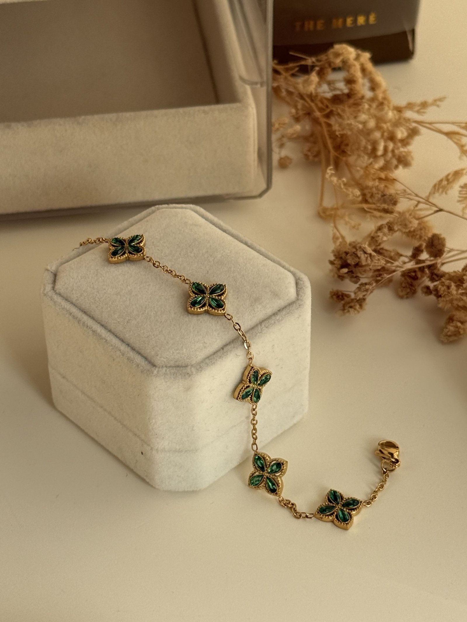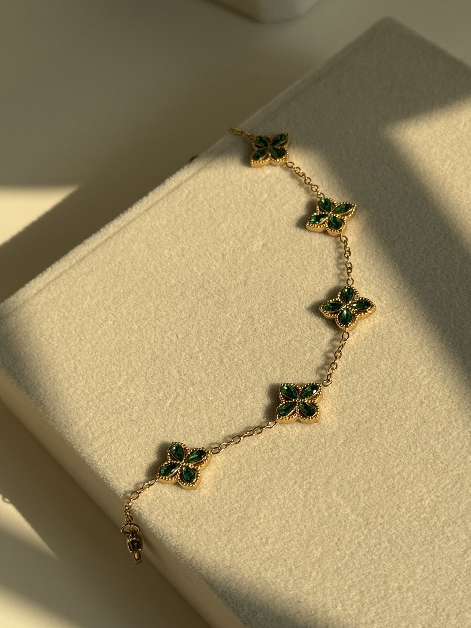 This elegant bracelet showcases full Alhambra-style clover motifs adorned with sparkling stones, creating a timeless and graceful aesthetic. Crafted from durable titanium stainless steel with a polished gold-tone finish, it offers excellent durability, shine retention, and everyday wear comfort.
