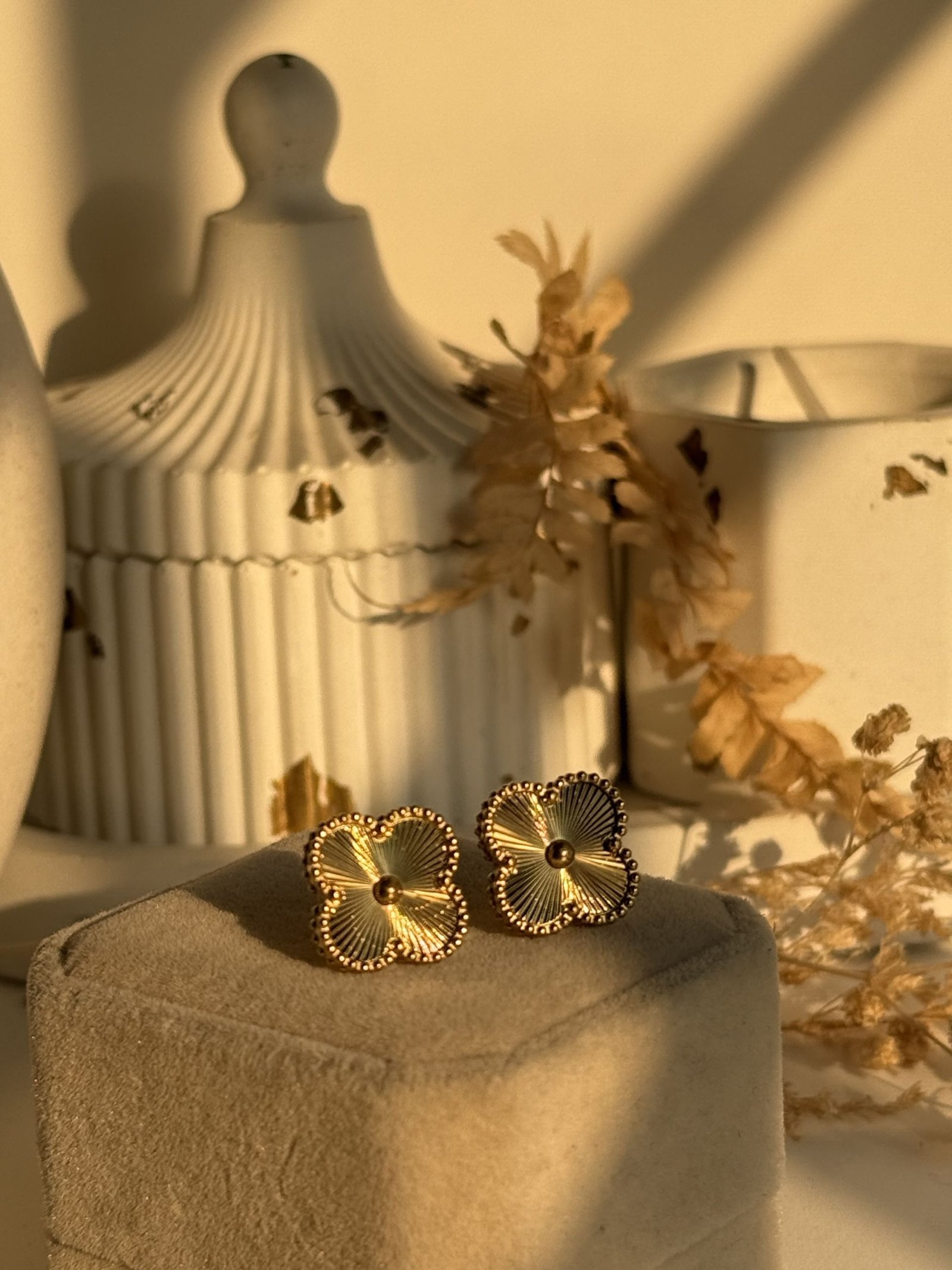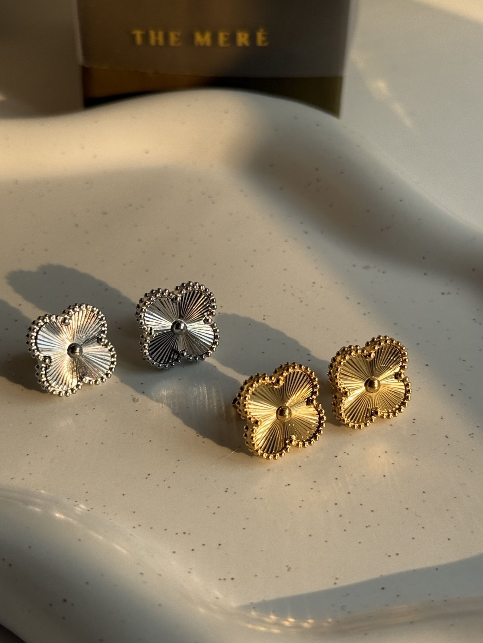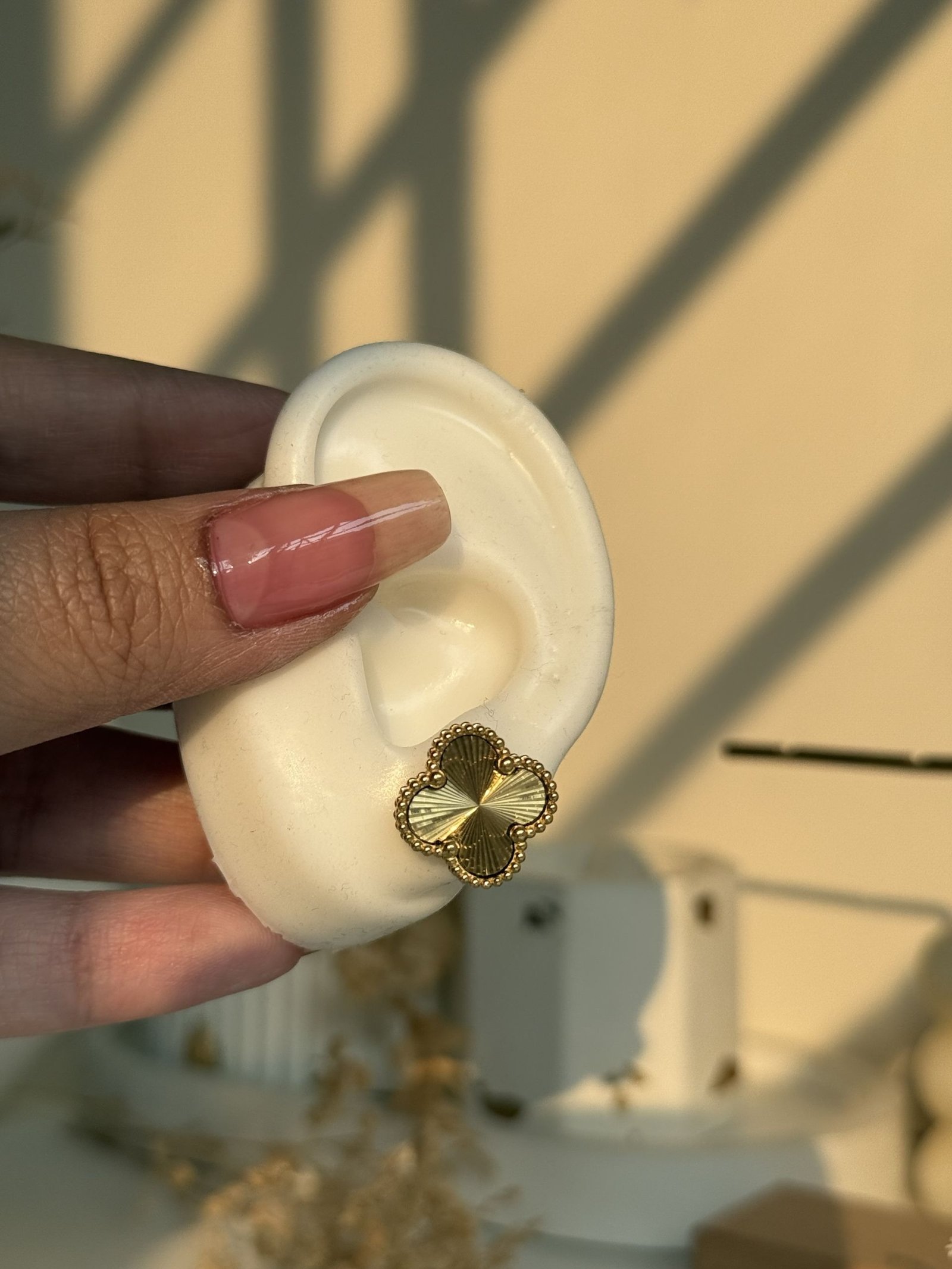 These refined clover stud earrings showcase a beautifully detailed laser-cut radial texture that reflects light with a subtle shimmer effect. Designed with a classic four-petal silhouette and bordered by delicate beaded edging, they offer a sophisticated luxury aesthetic. Crafted from durable titanium stainless steel, this pair ensures long-lasting color retention, resistance to tarnishing, and everyday durability. The secure butterfly push-back closure provides comfortable wear for extended hours, making them ideal for daily styling, office looks, and special occasions.