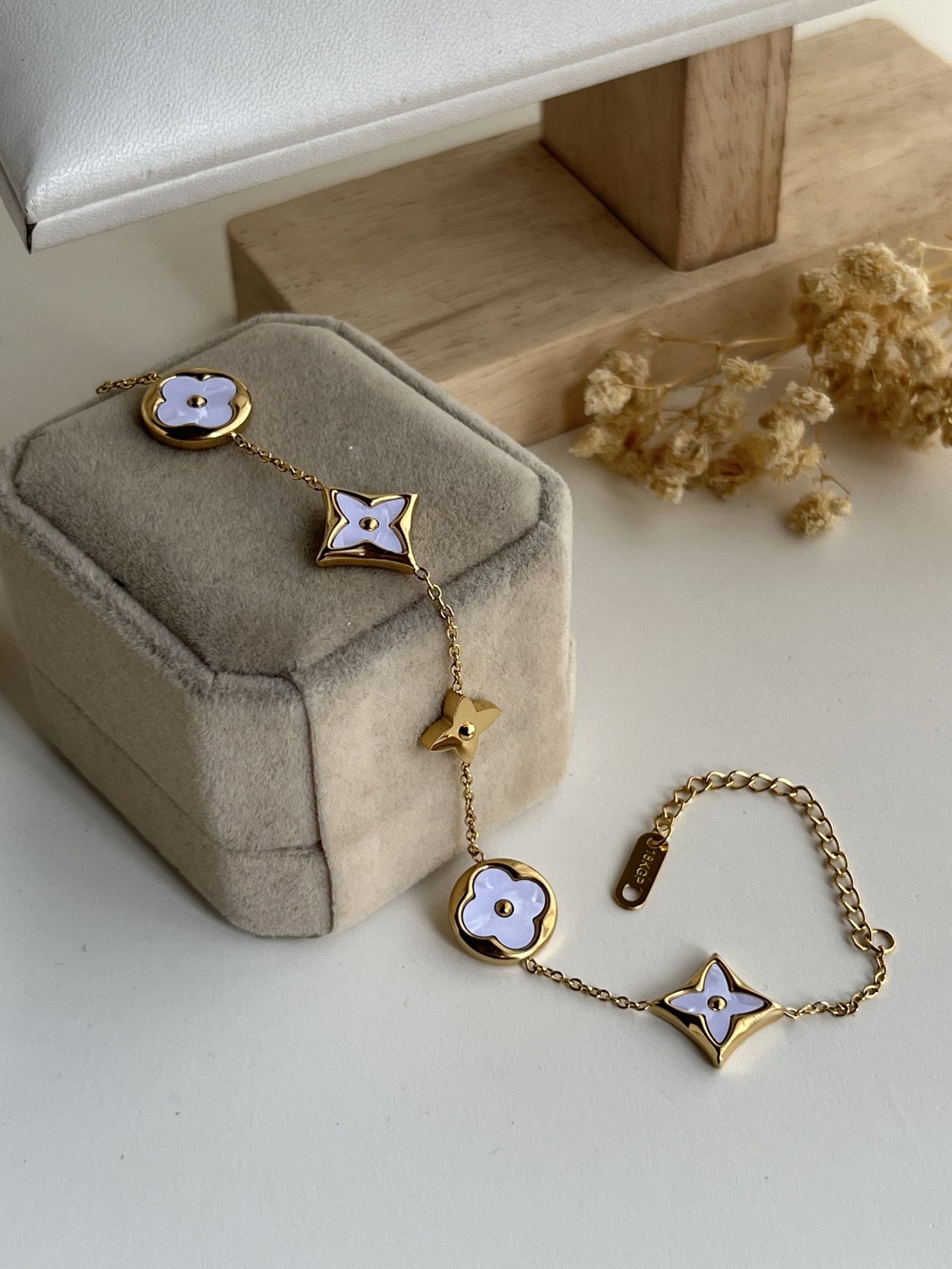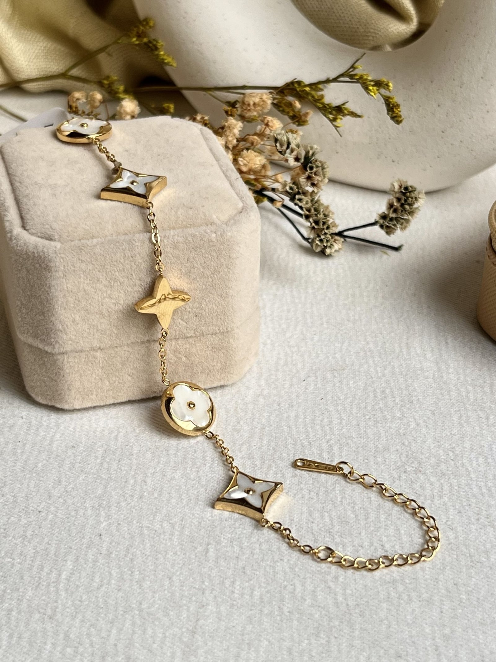 This bracelet features alternating four-leaf clover and star-shaped motifs accented with smooth white enamel inlays, creating a balanced contrast against the polished gold-tone frame. The refined silhouette offers a graceful visual appeal suitable for both minimal solo styling and layered combinations. Its flexible chain structure ensures comfortable wrist movement while maintaining a secure and elegant fit throughout daily wear. Made from titanium stainless steel with gold plating, it delivers strong durability, tarnish resistance, and long-lasting color stability ideal for regular use.