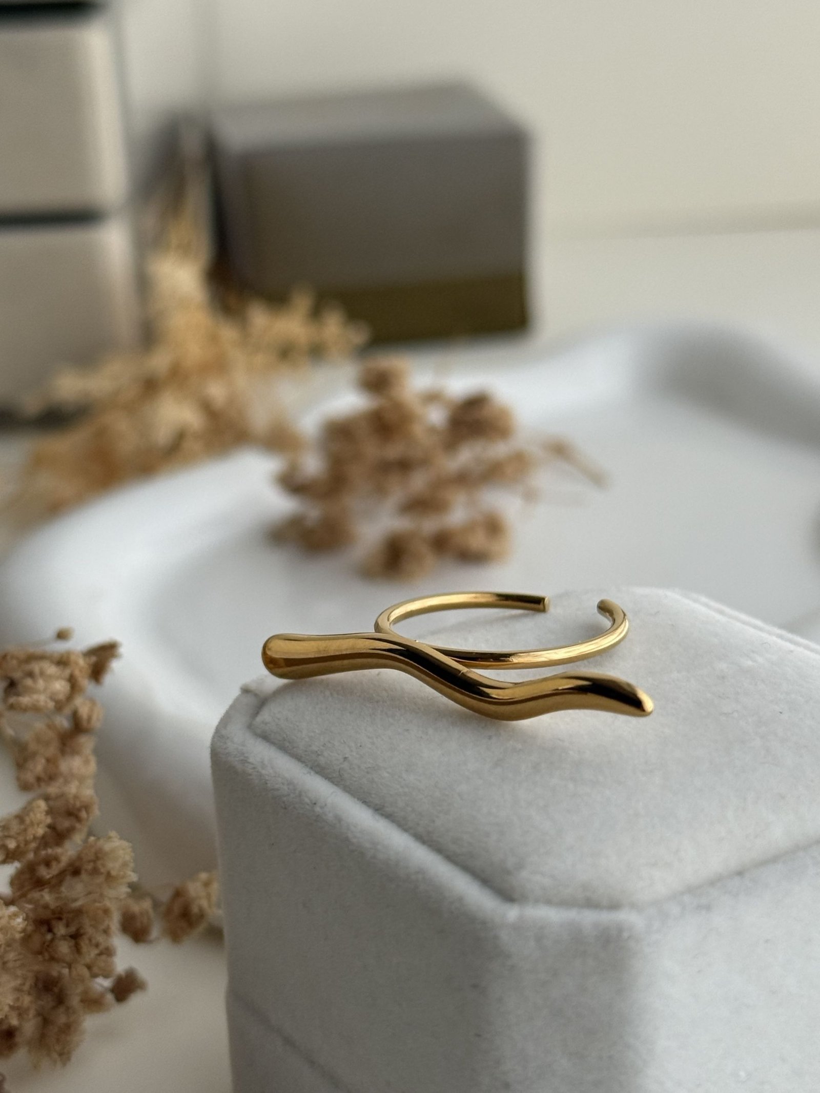 The Auralis Wave Ring features an irregular flowing silhouette inspired by natural movement, finished in a smooth high-polish surface that reflects light with subtle elegance. Its open adjustable structure offers a comfortable fit while maintaining a bold yet refined profile. Designed to be worn solo for a statement look or paired with minimal bands for layered styling, this ring transitions effortlessly between everyday wear and elevated occasions. Crafted from titanium stainless steel with premium gold plating, it delivers durability, tarnish resistance, and long-lasting surface brilliance suitable for regular use.