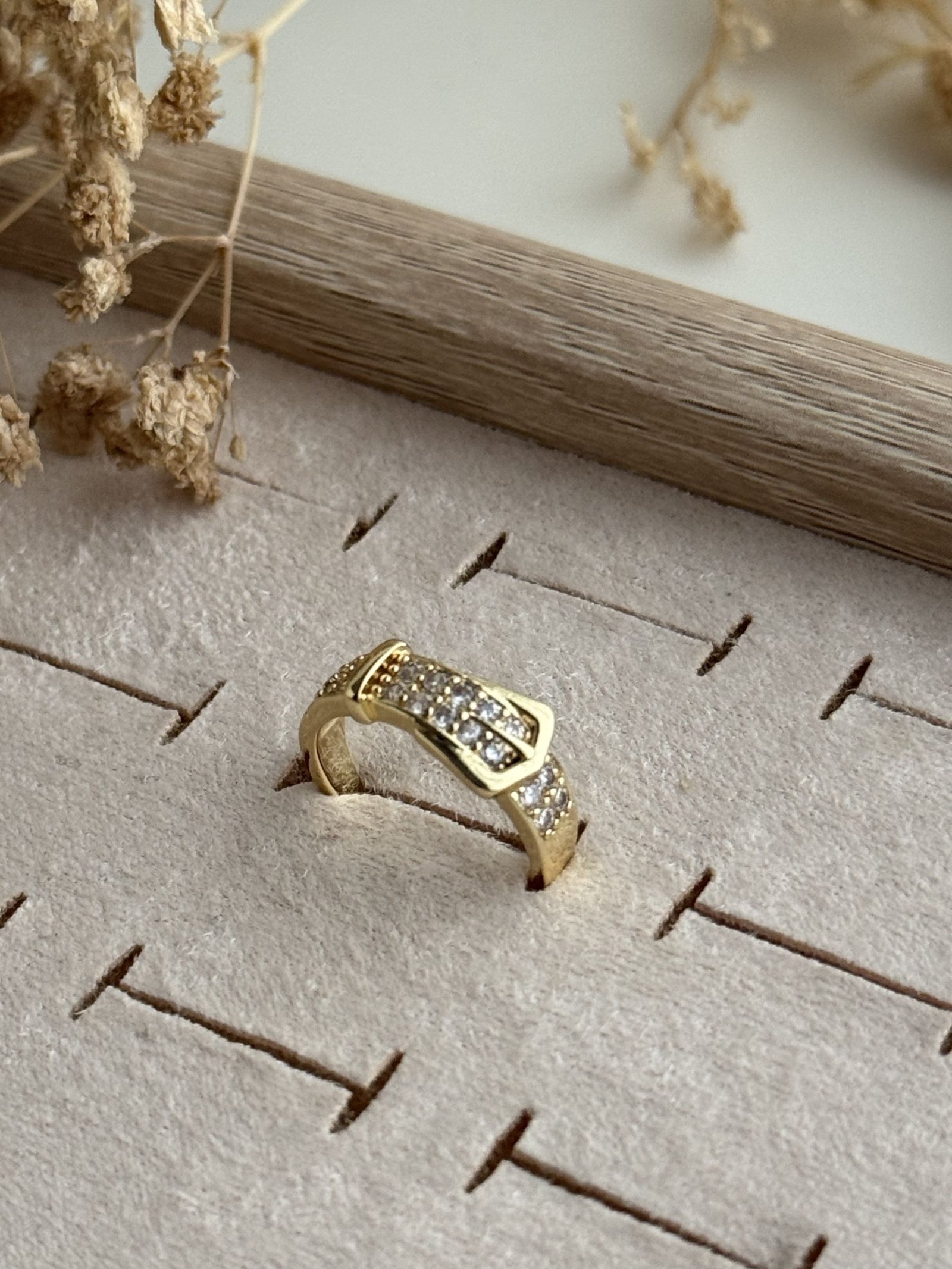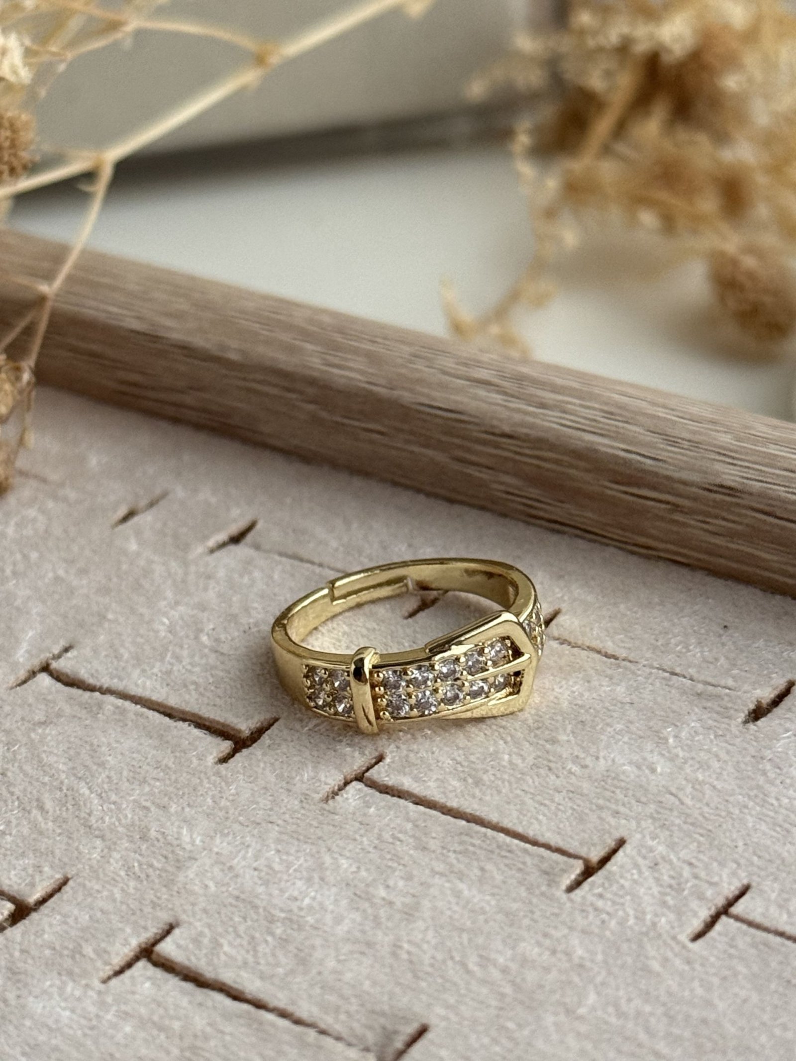 The Aurelia Buckle Pavé Ring is designed with a gold-plated copper base and a modern buckle-style centerpiece highlighted by fine clear stone pavé detailing. Its polished finish and clean geometric lines create a bold yet refined visual appeal, while the adjustable open-back structure ensures comfortable wear throughout the day. Ideal for both solo styling and layered ring combinations, this piece adds a contemporary accent to everyday and occasion looks with effortless elegance.