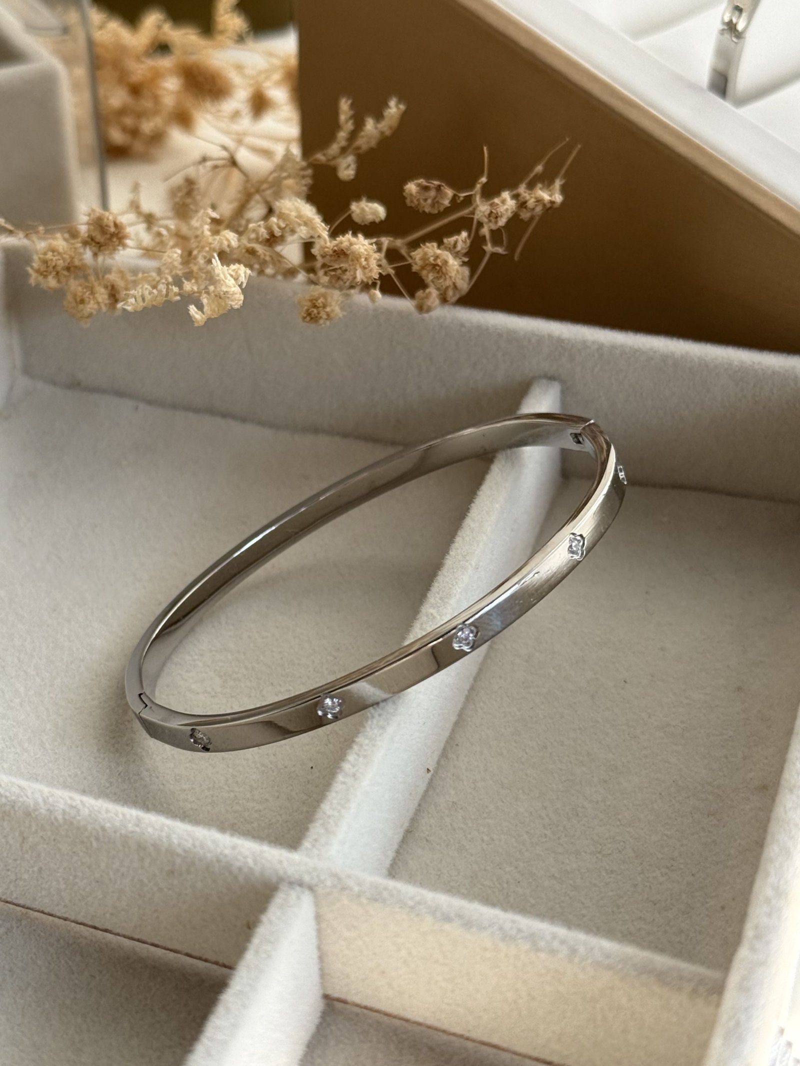 The slim cuff structure ensures comfortable wrist movement while maintaining a secure fit. It can be worn alone for understated elegance or layered with other bangles for a refined stacked look. Crafted from titanium stainless steel, this piece offers long-term durability and surface stability for everyday wear.