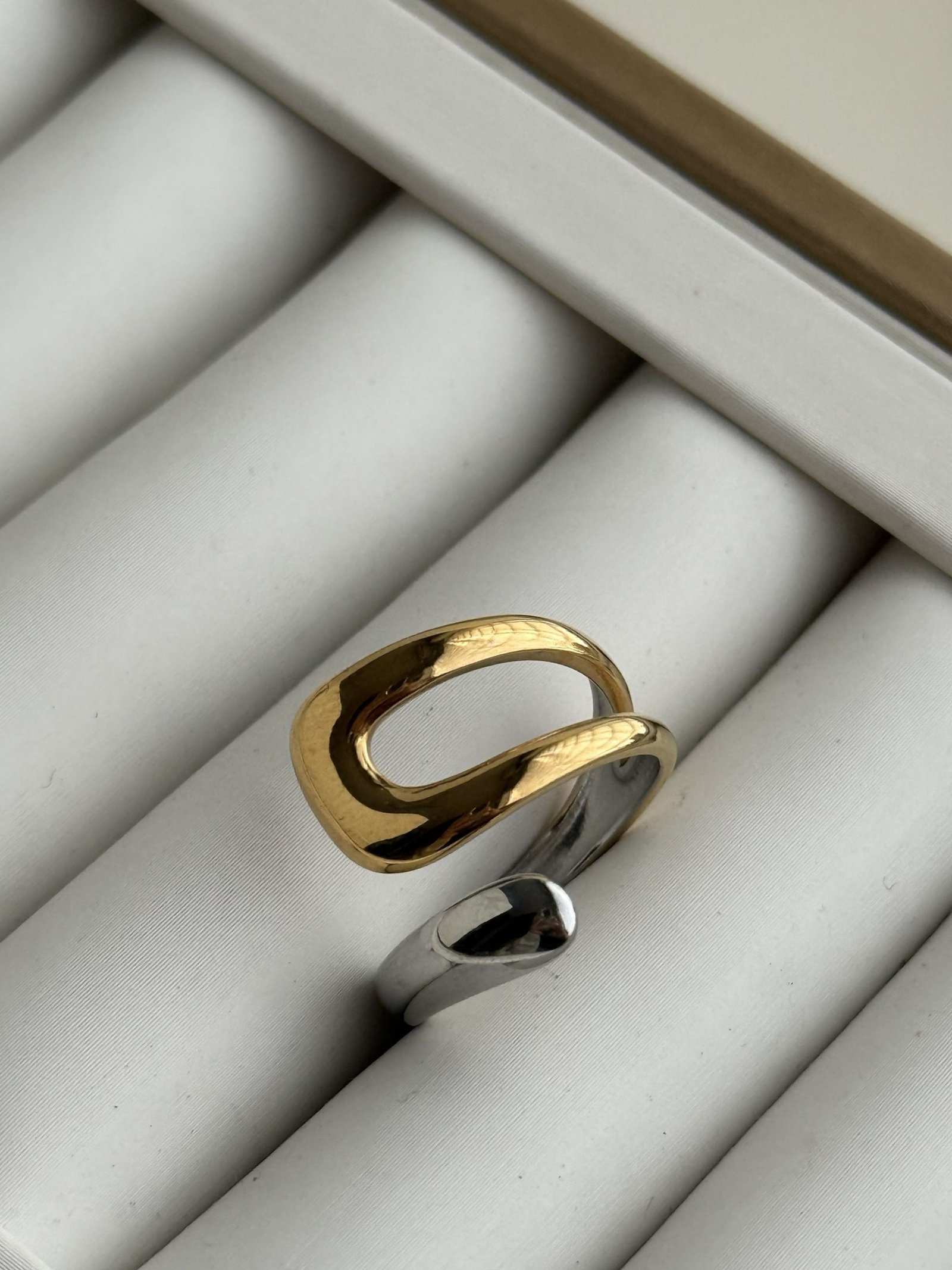 The Aurelia Duo Flow Ring showcases a smooth flowing silhouette highlighted by a balanced gold and silver dual-tone finish that creates visual contrast and refined dimension. Its open adjustable structure offers comfortable wear while maintaining a bold sculptural presence. Designed for effortless solo styling or elegant stacking, this piece transitions seamlessly from everyday wear to elevated looks. Made from titanium stainless steel, it delivers durability, tarnish resistance, and long-lasting shine for dependable daily elegance.