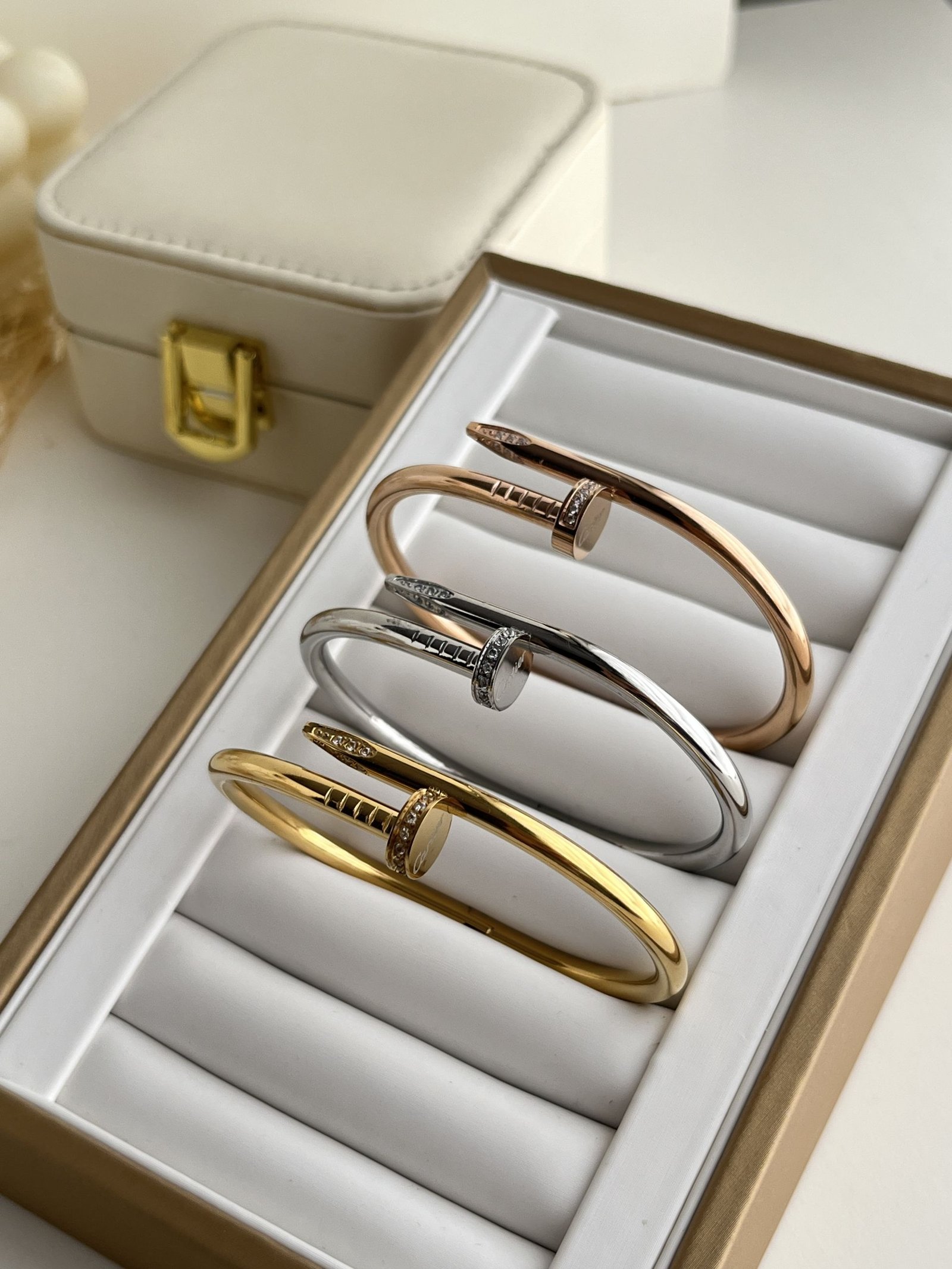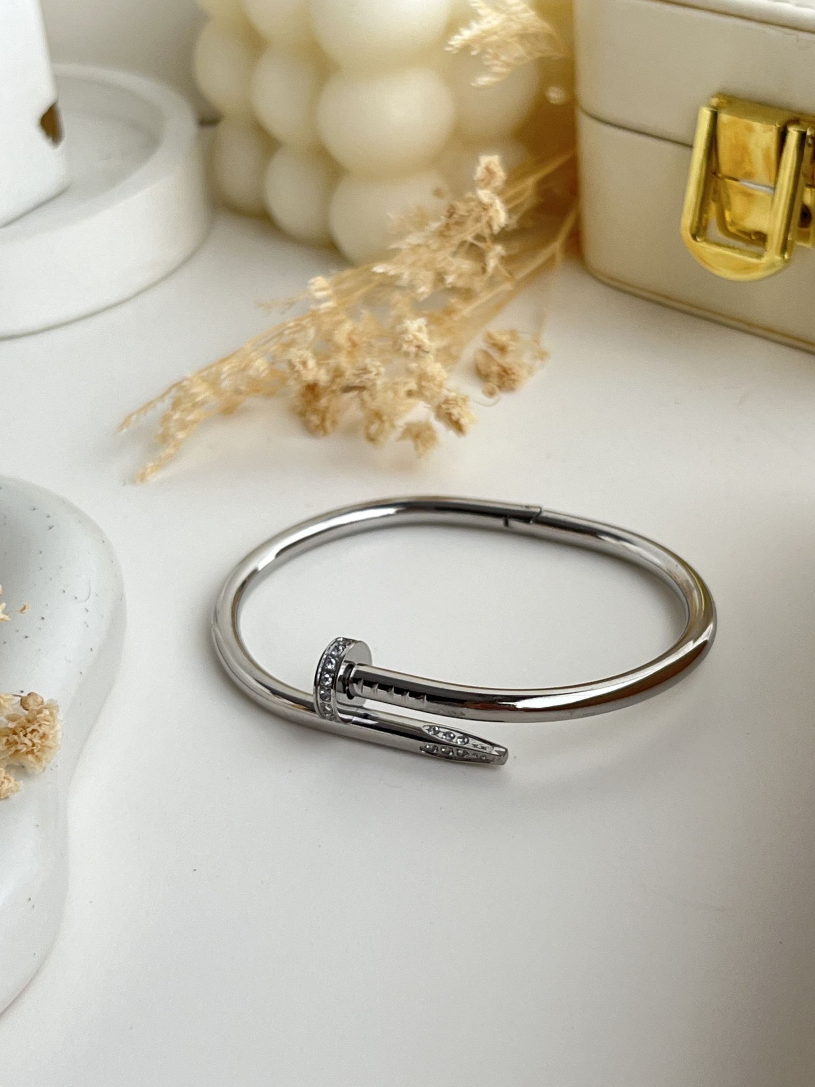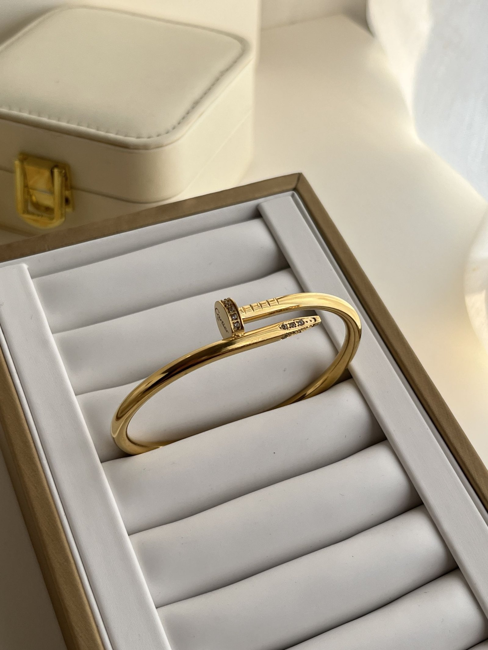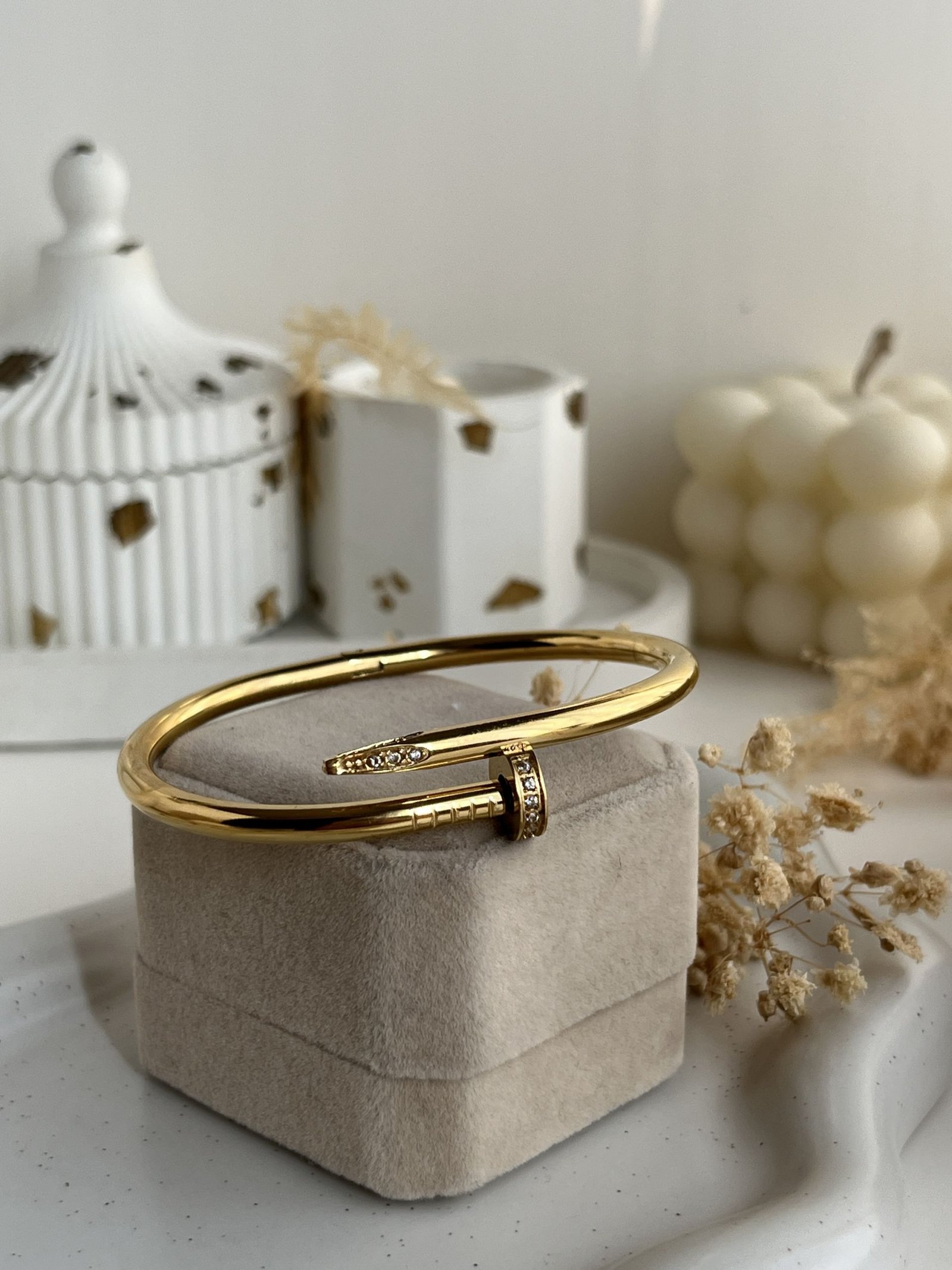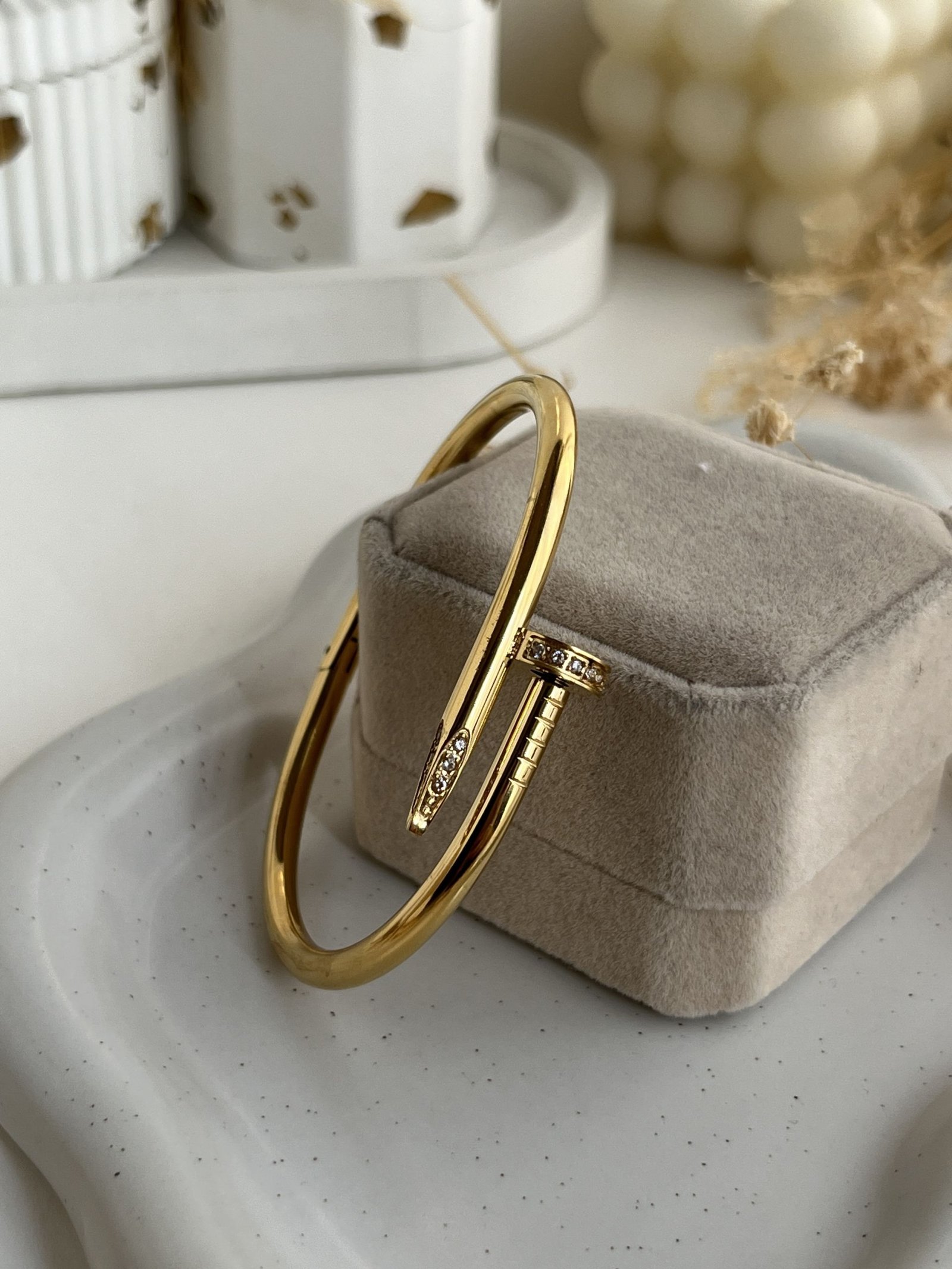 Aurelia Nail Crystal Cuff showcases a modern nail-inspired form with engraved surface detailing and half-head crystal embellishments that add subtle brilliance. The sleek curved profile and polished gold-tone finish create a contemporary luxury look suitable for both casual styling and elevated outfits.