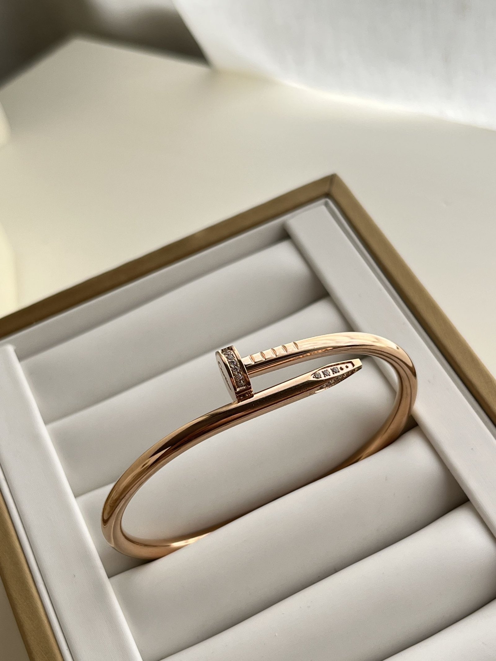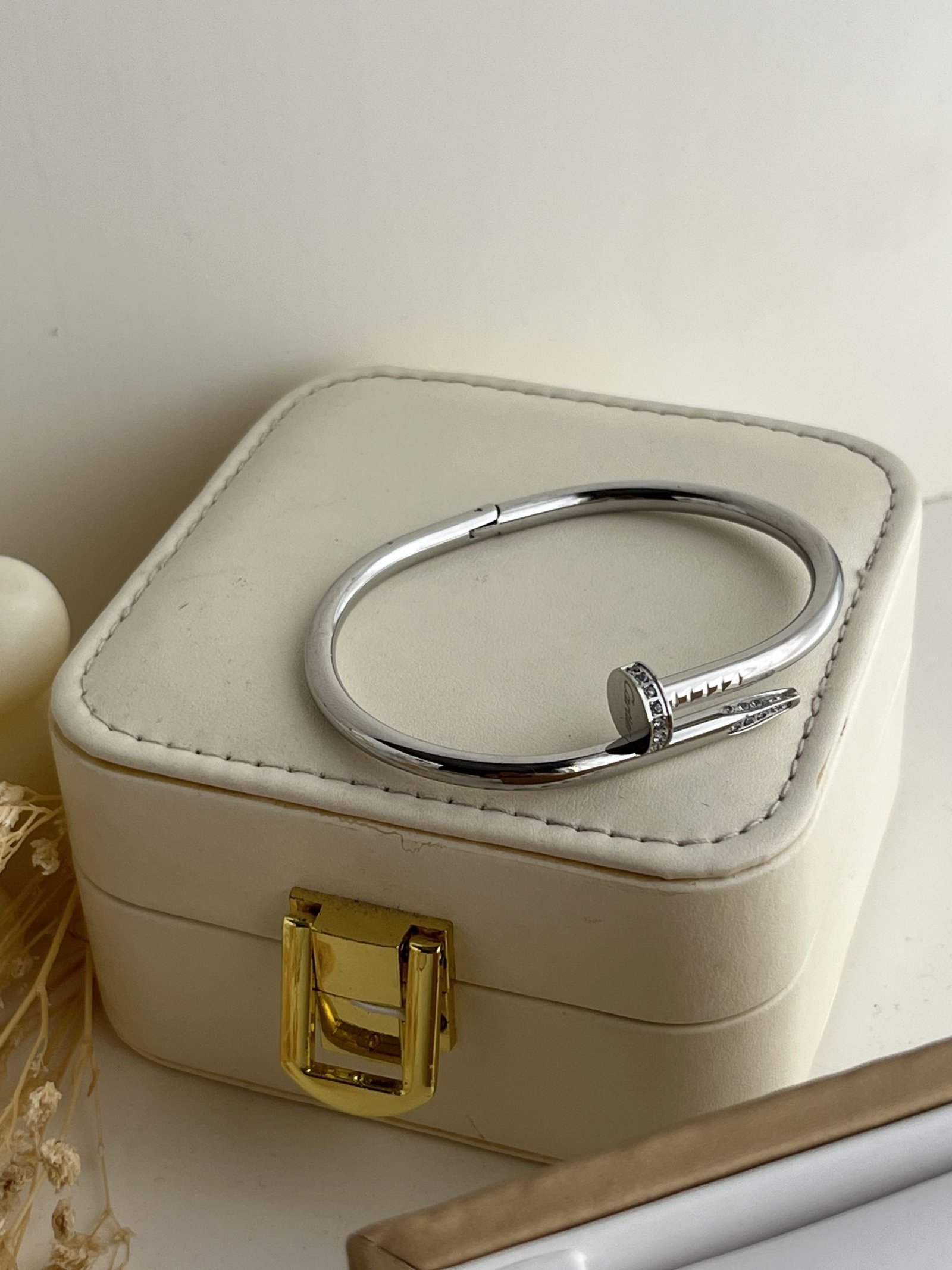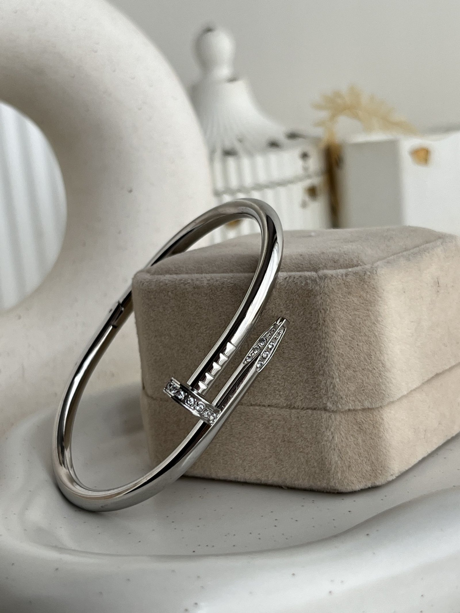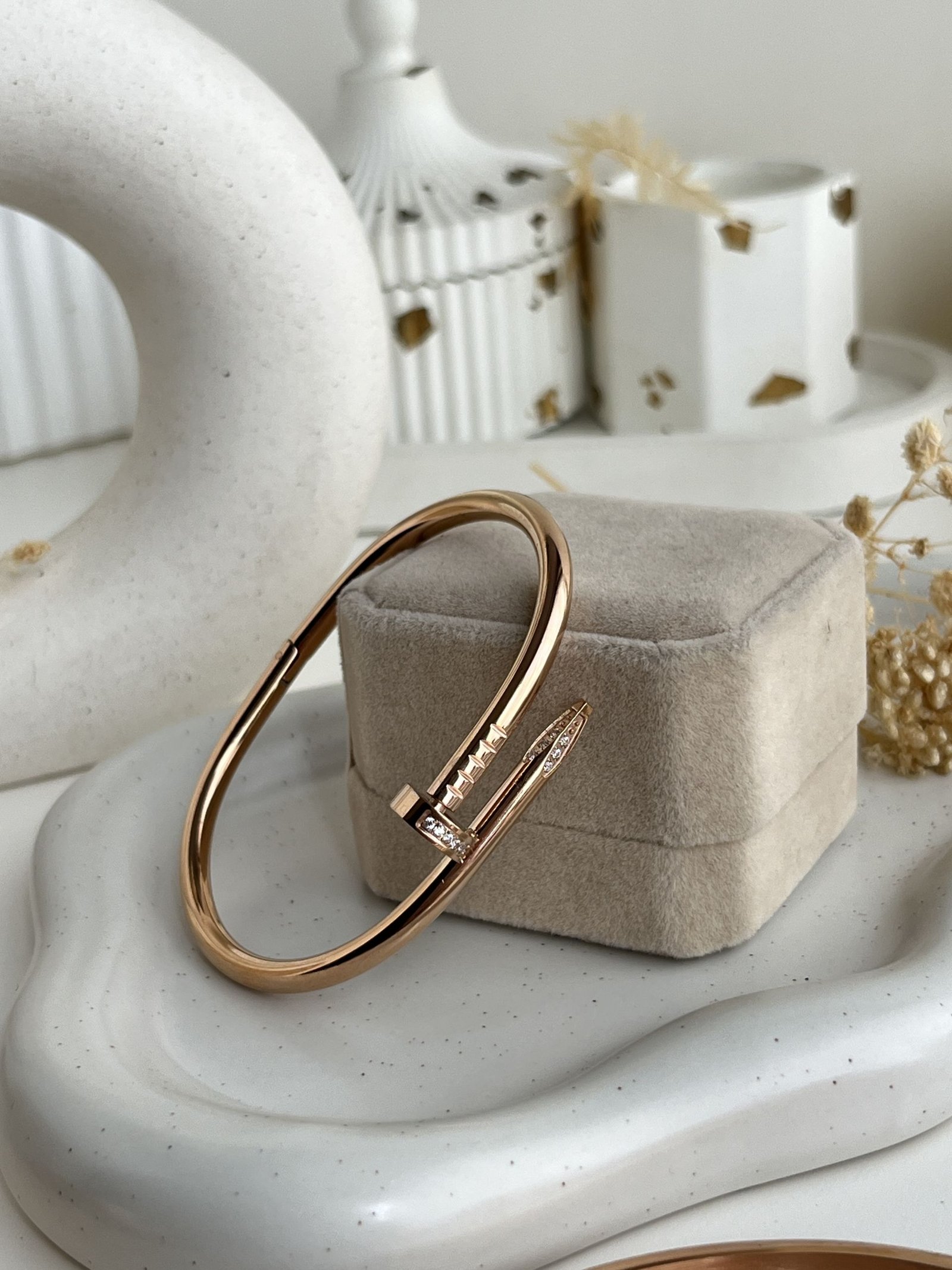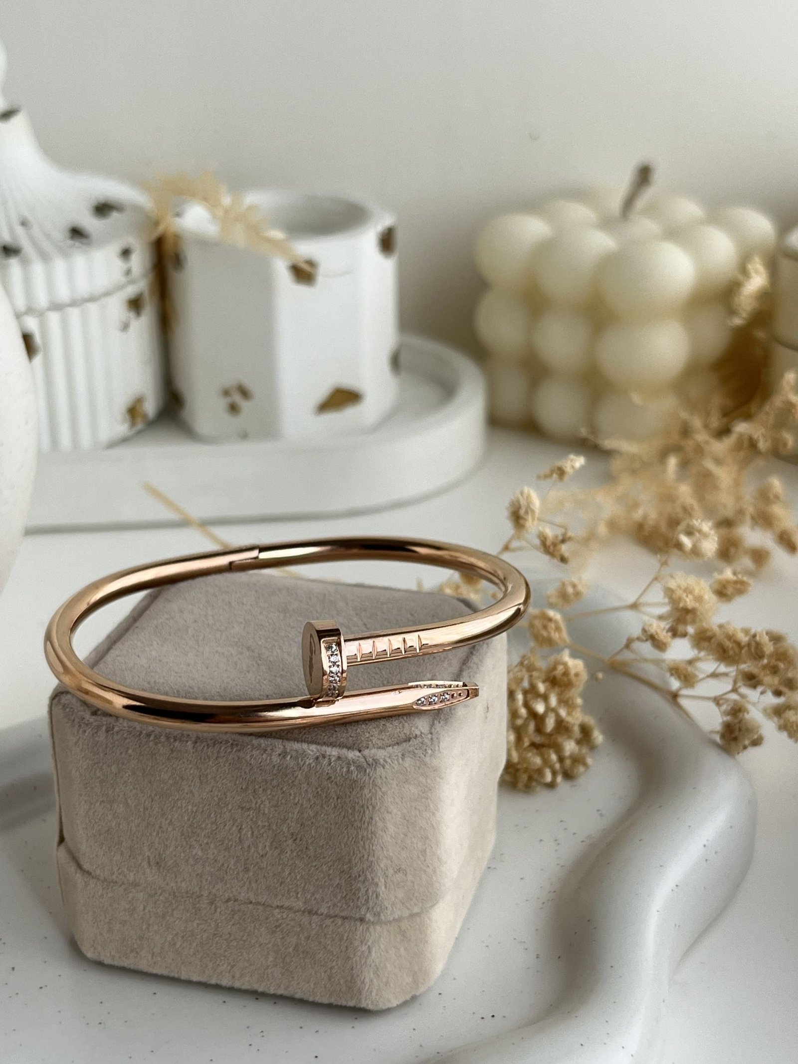 Aurelia Nail Crystal Cuff showcases a modern nail-inspired form with engraved surface detailing and half-head crystal embellishments that add subtle brilliance. The sleek curved profile and polished gold-tone finish create a contemporary luxury look suitable for both casual styling and elevated outfits.