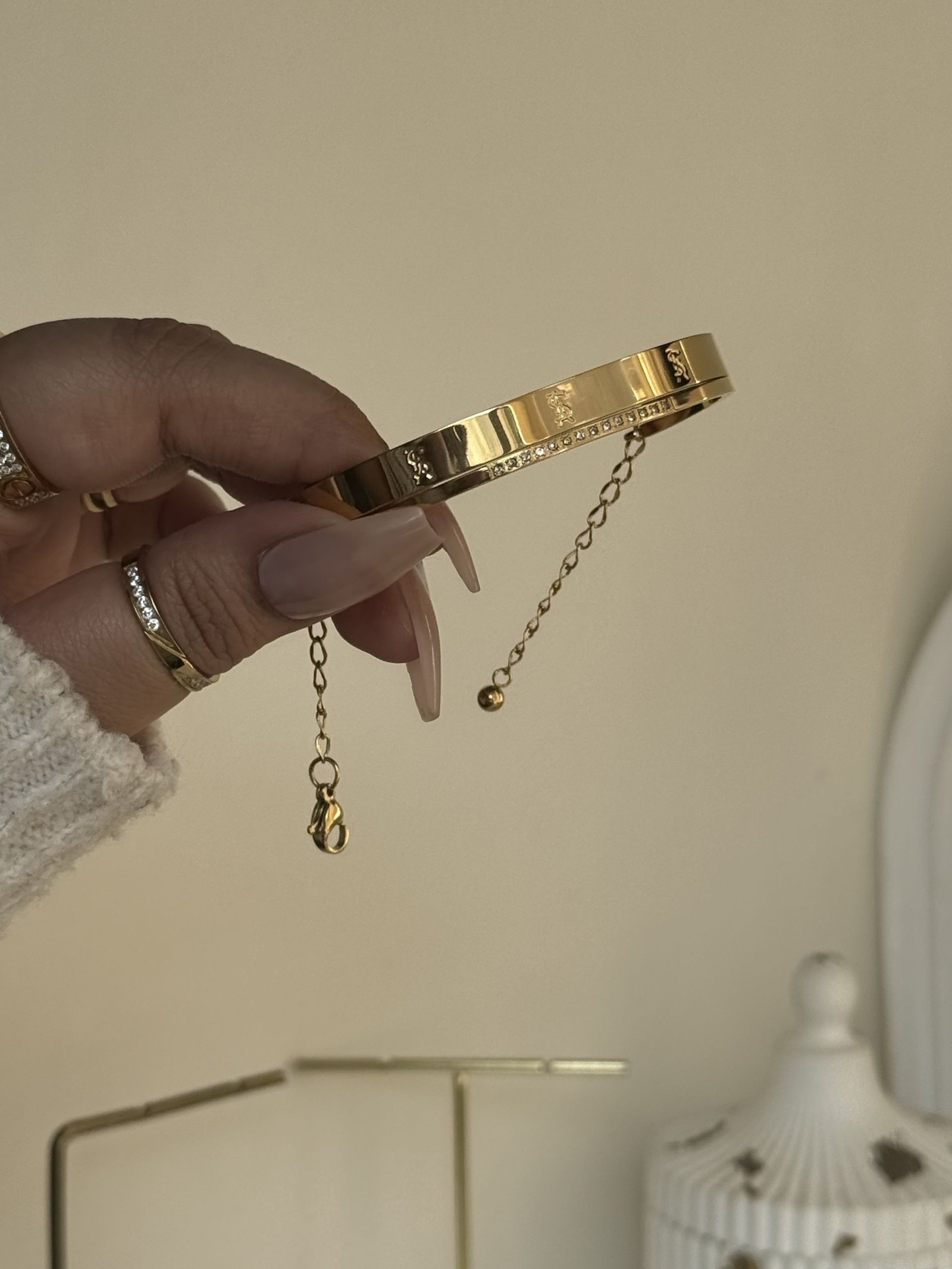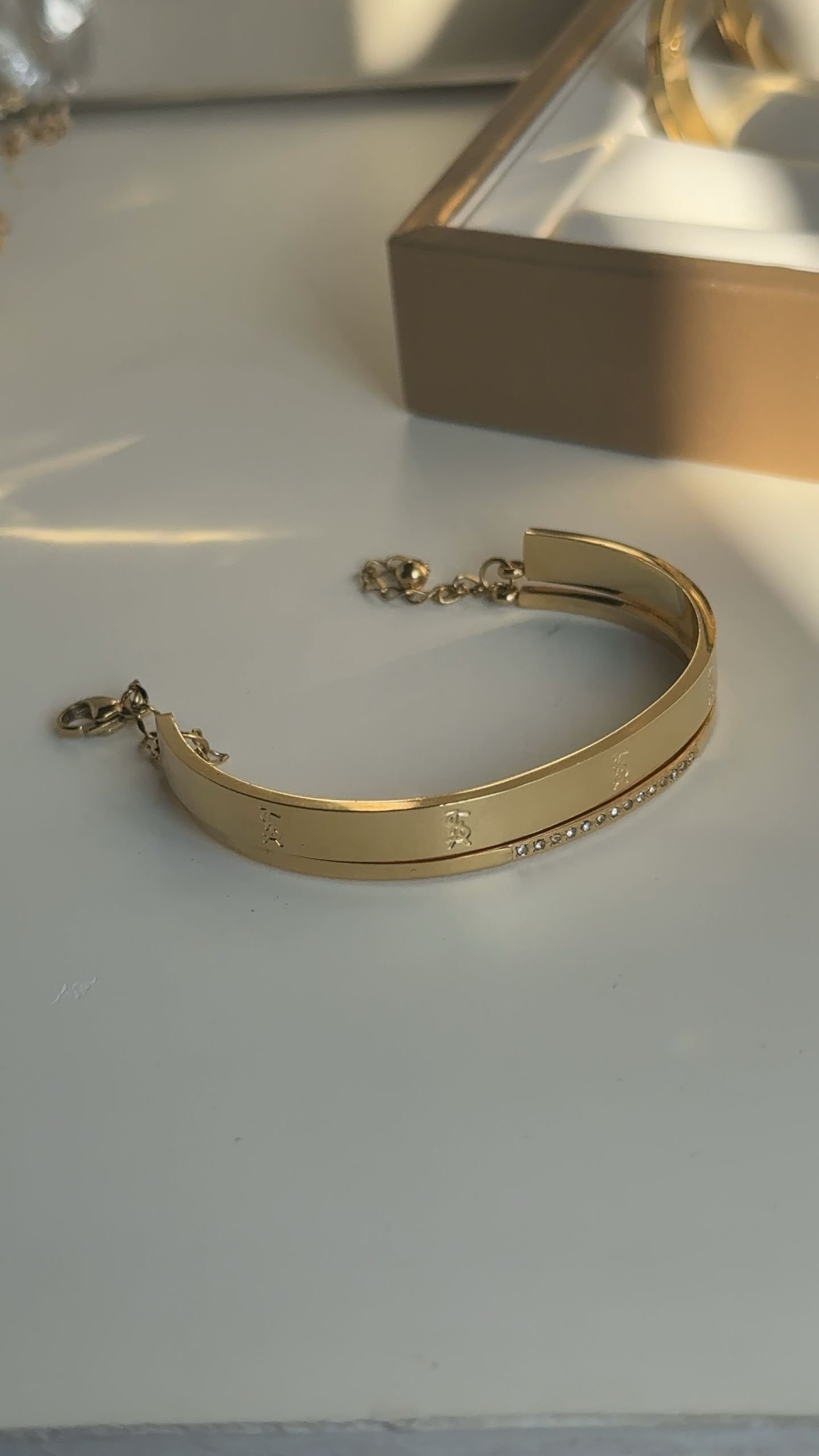 AurΓ©ne Bar Cuff is designed with a polished oval silhouette, finished in a luminous gold tone and accented with a slim crystal bar detail that adds subtle brilliance without overpowering the design. The engraved surface detailing creates a refined fashion-inspired aesthetic while maintaining a balanced and minimal appearance.
