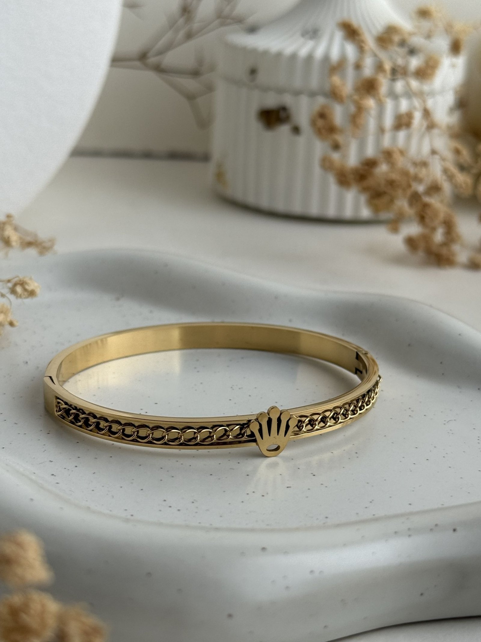 A sleek chain-detailed cuff featuring a refined emblem accent that adds character without overpowering the design. The clean structure paired with subtle detailing makes it an easy everyday piece with a luxury-inspired feel.