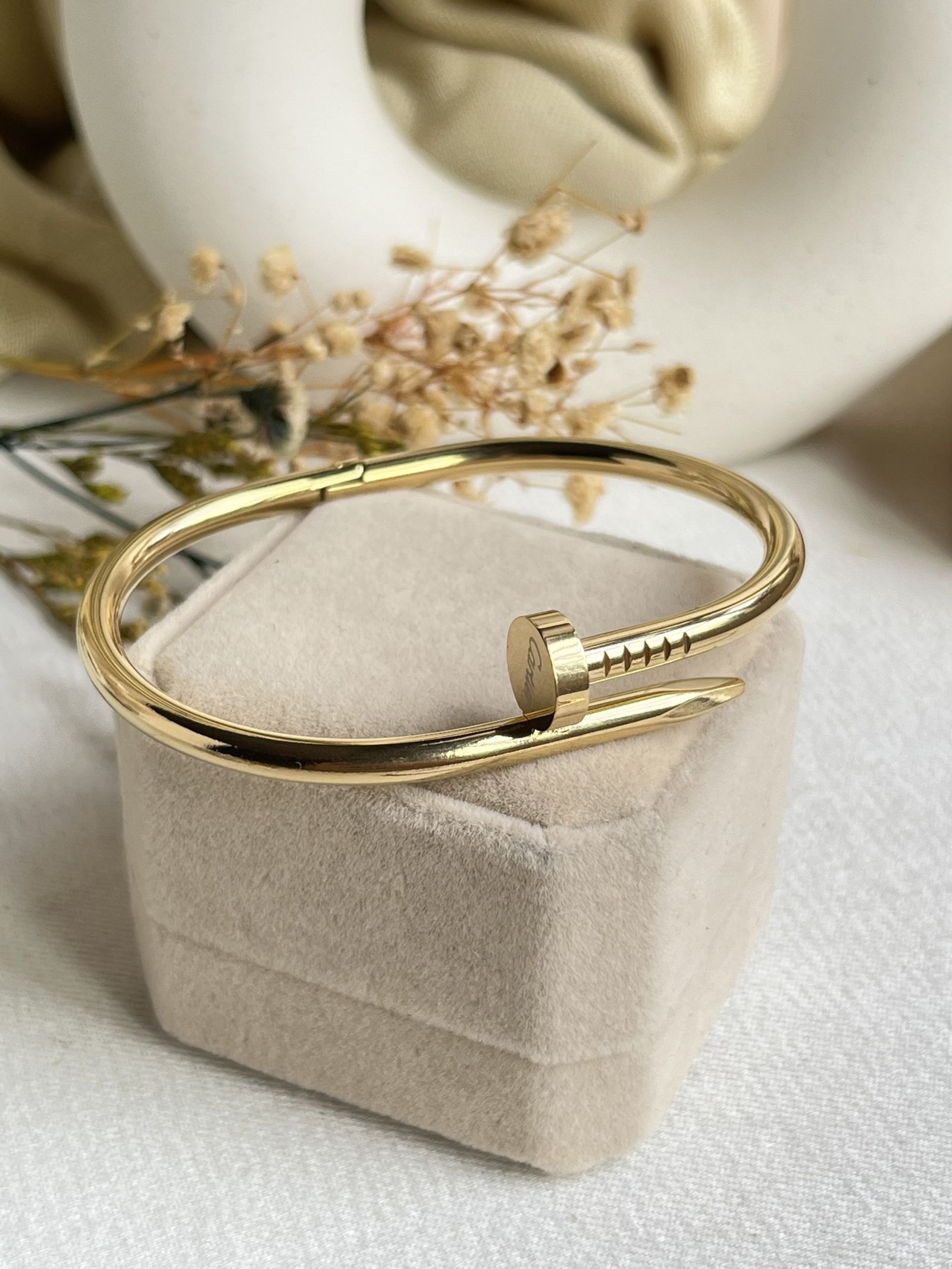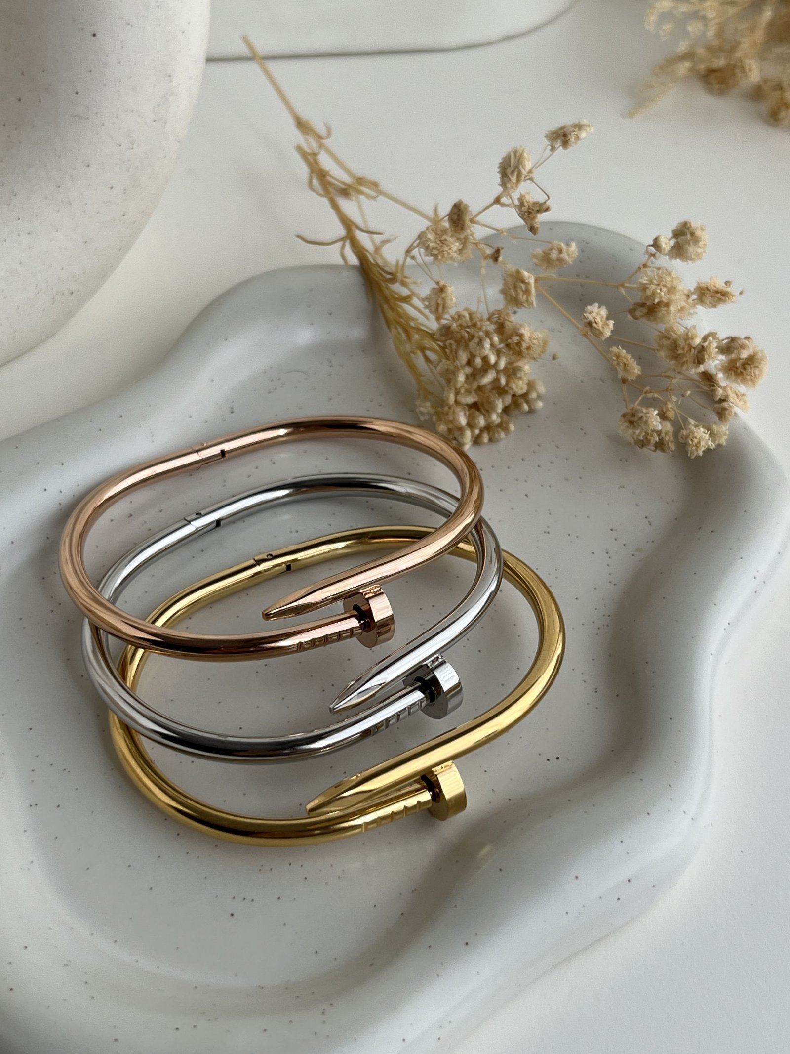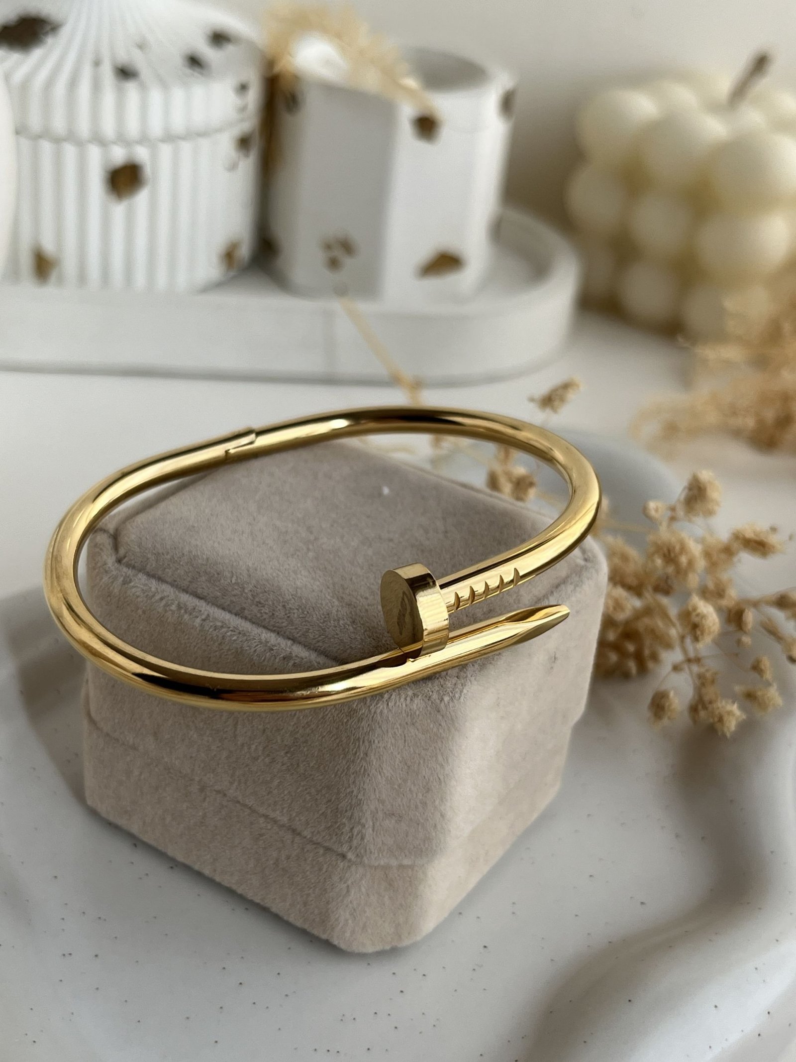 Aurex Nail Signature Cuff features a clean nail-inspired design with a smooth polished gold-tone surface that delivers a modern luxury aesthetic. The fluid curved structure creates a strong visual statement while maintaining an elegant profile suitable for both everyday wear and elevated styling.