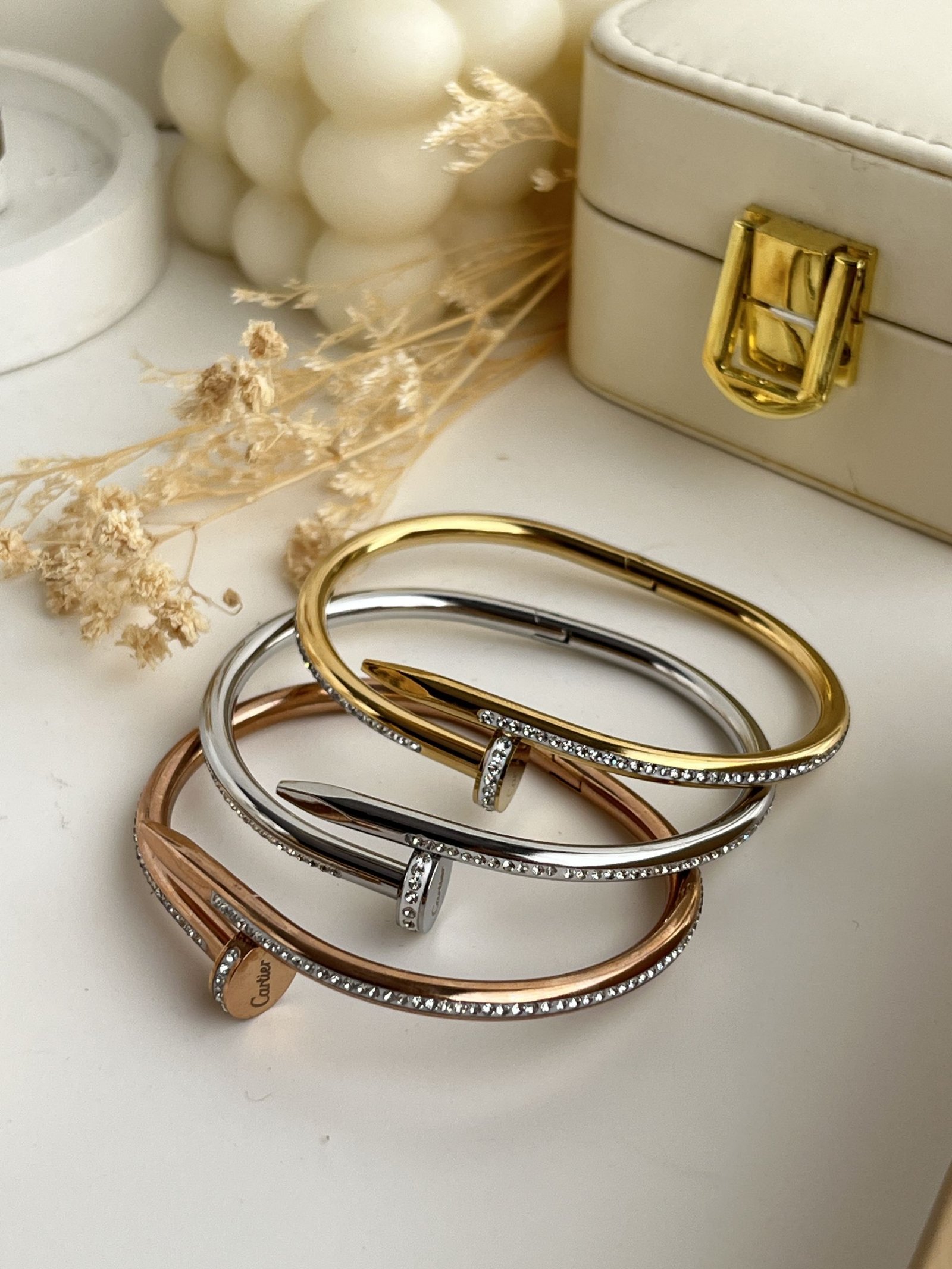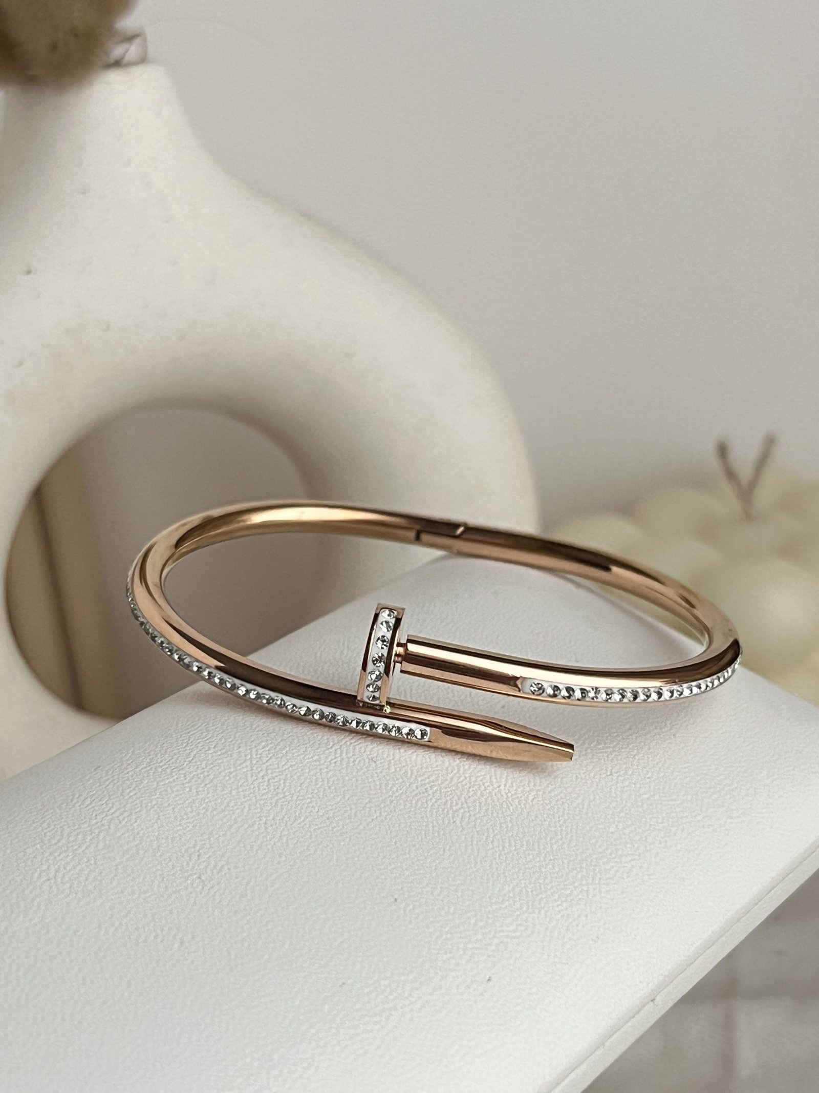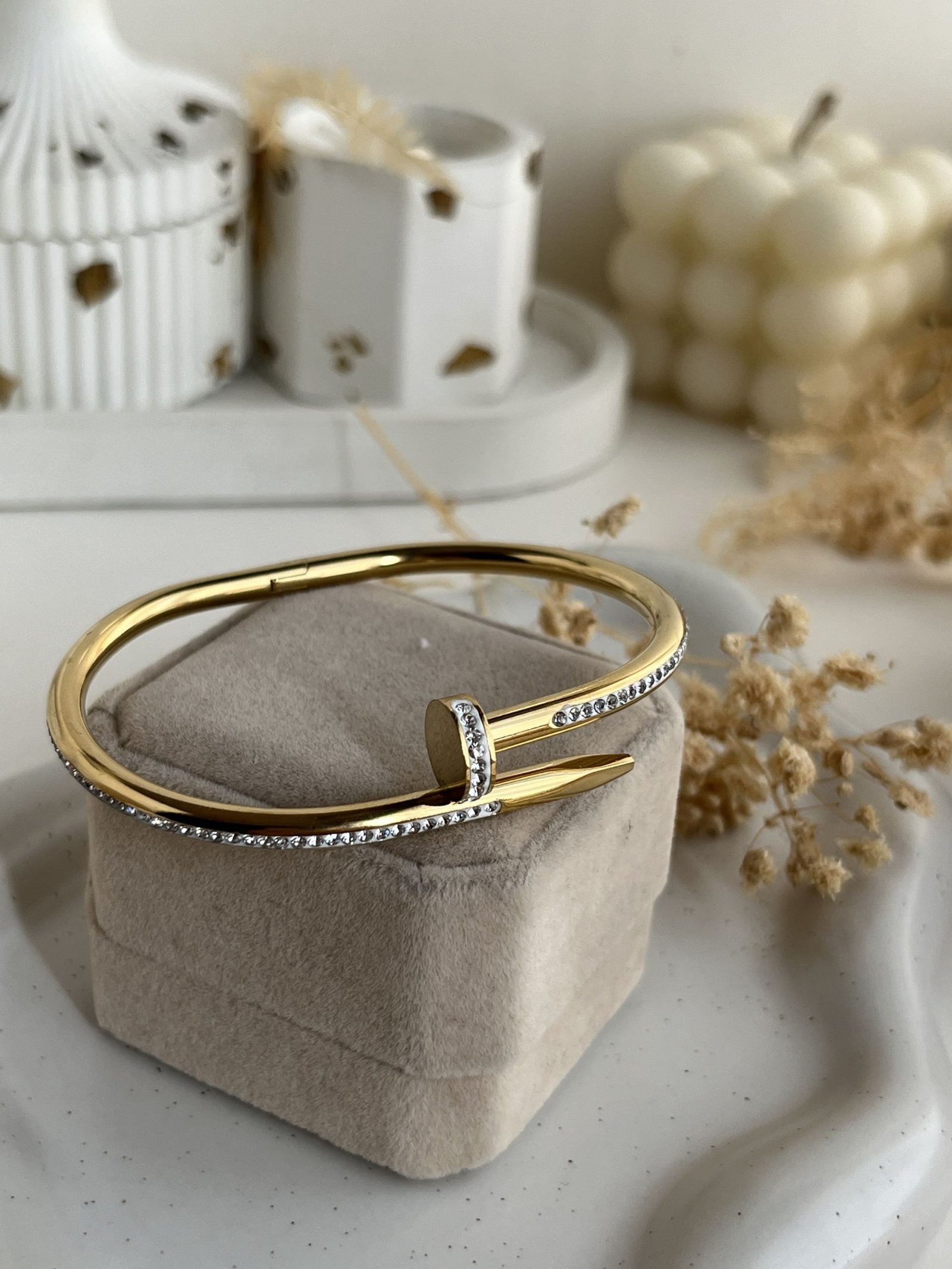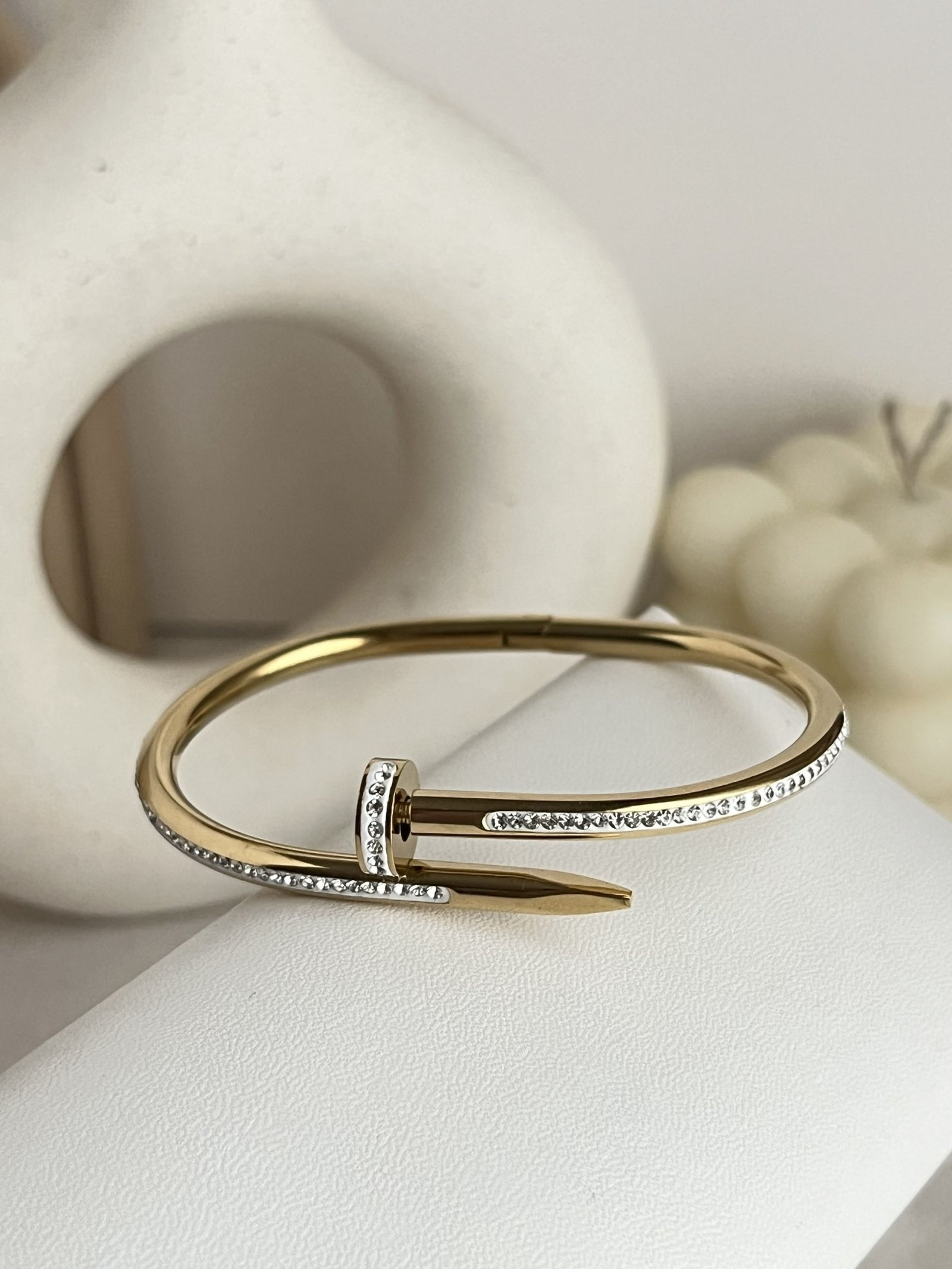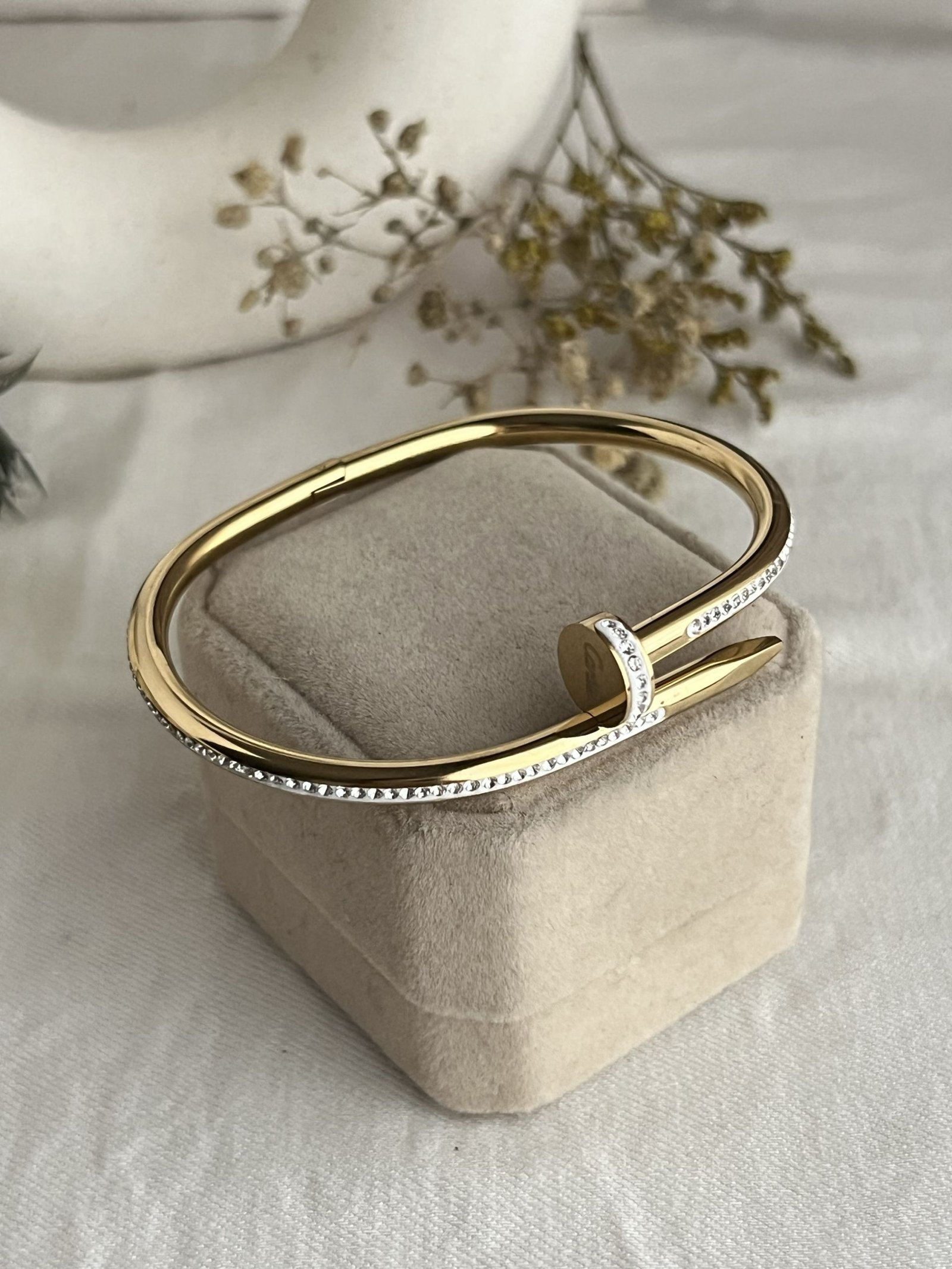 Aurex Pavé Nail Cuff showcases a modern nail-inspired structure enhanced with full micro-set cubic zirconia stones along the band, creating a balanced blend of edge and elegance. The polished gold-tone finish reflects light beautifully, giving the cuff a luxurious presence without overwhelming the wrist.