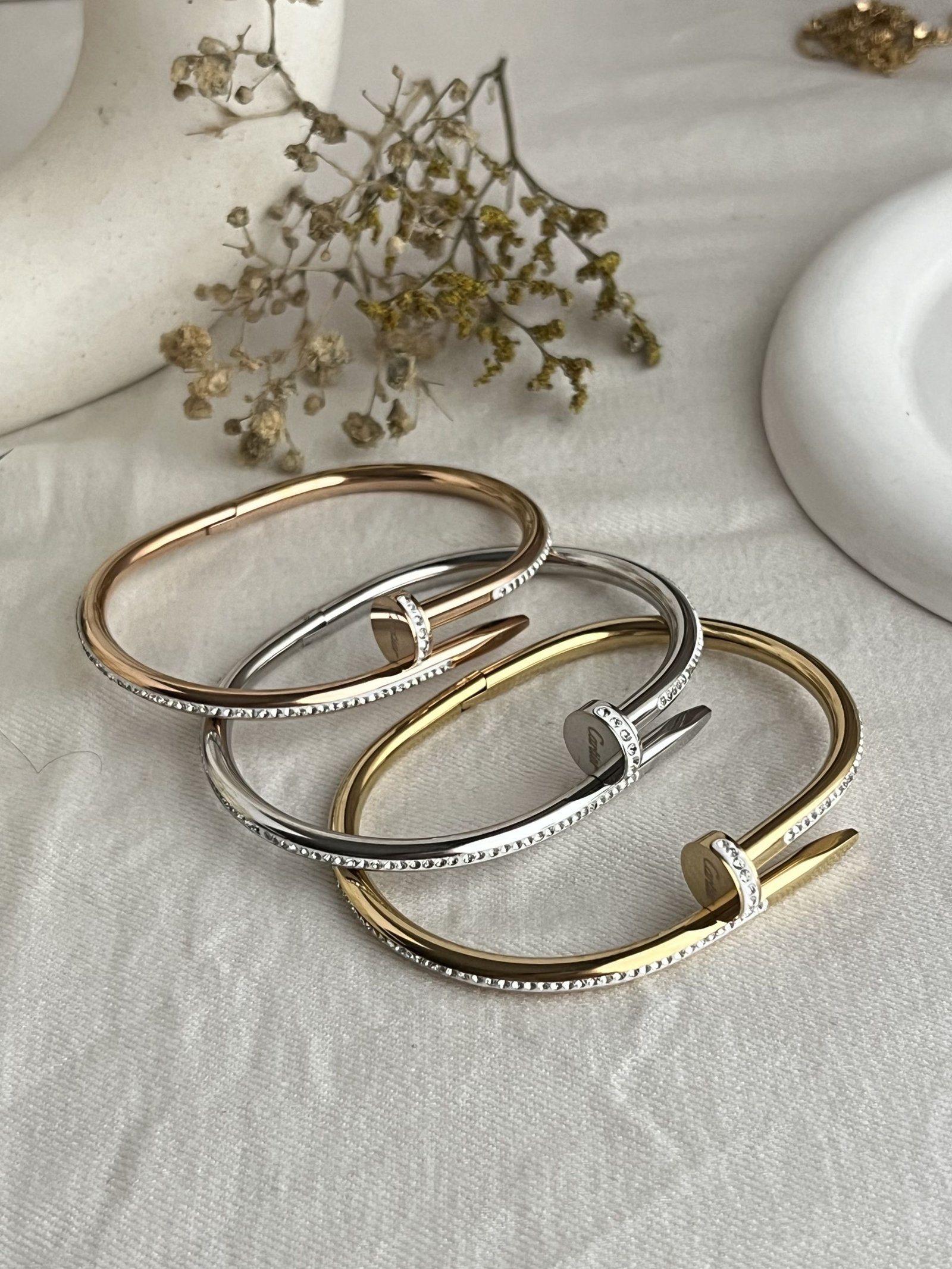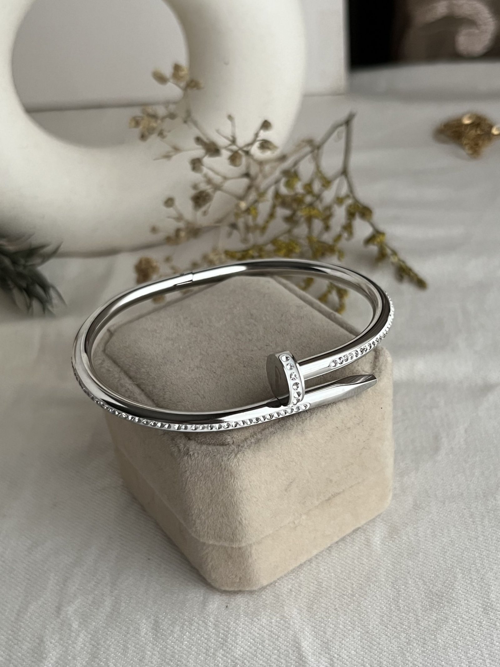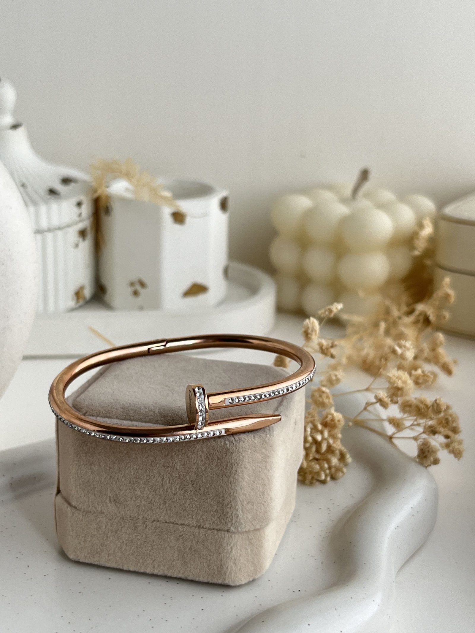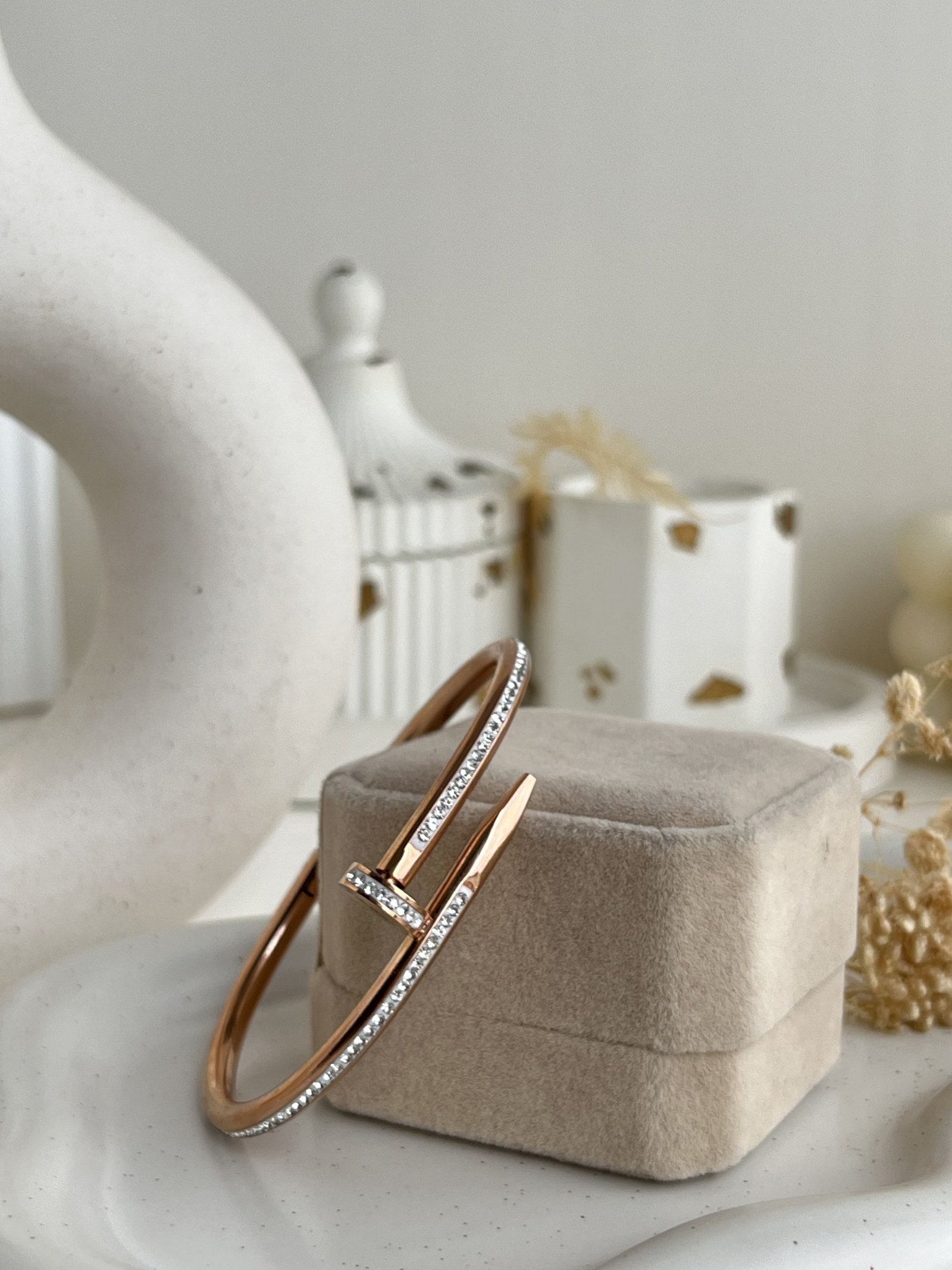 Aurex Pavé Nail Cuff showcases a modern nail-inspired structure enhanced with full micro-set cubic zirconia stones along the band, creating a balanced blend of edge and elegance. The polished gold-tone finish reflects light beautifully, giving the cuff a luxurious presence without overwhelming the wrist.