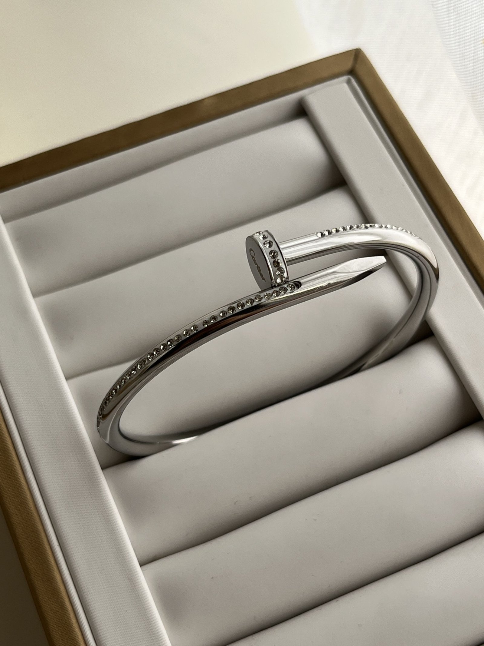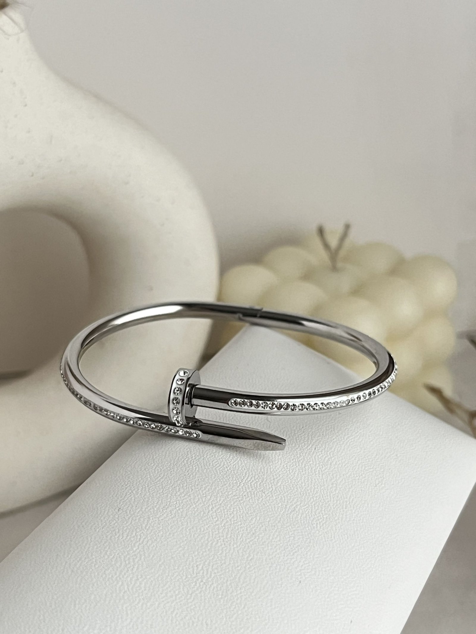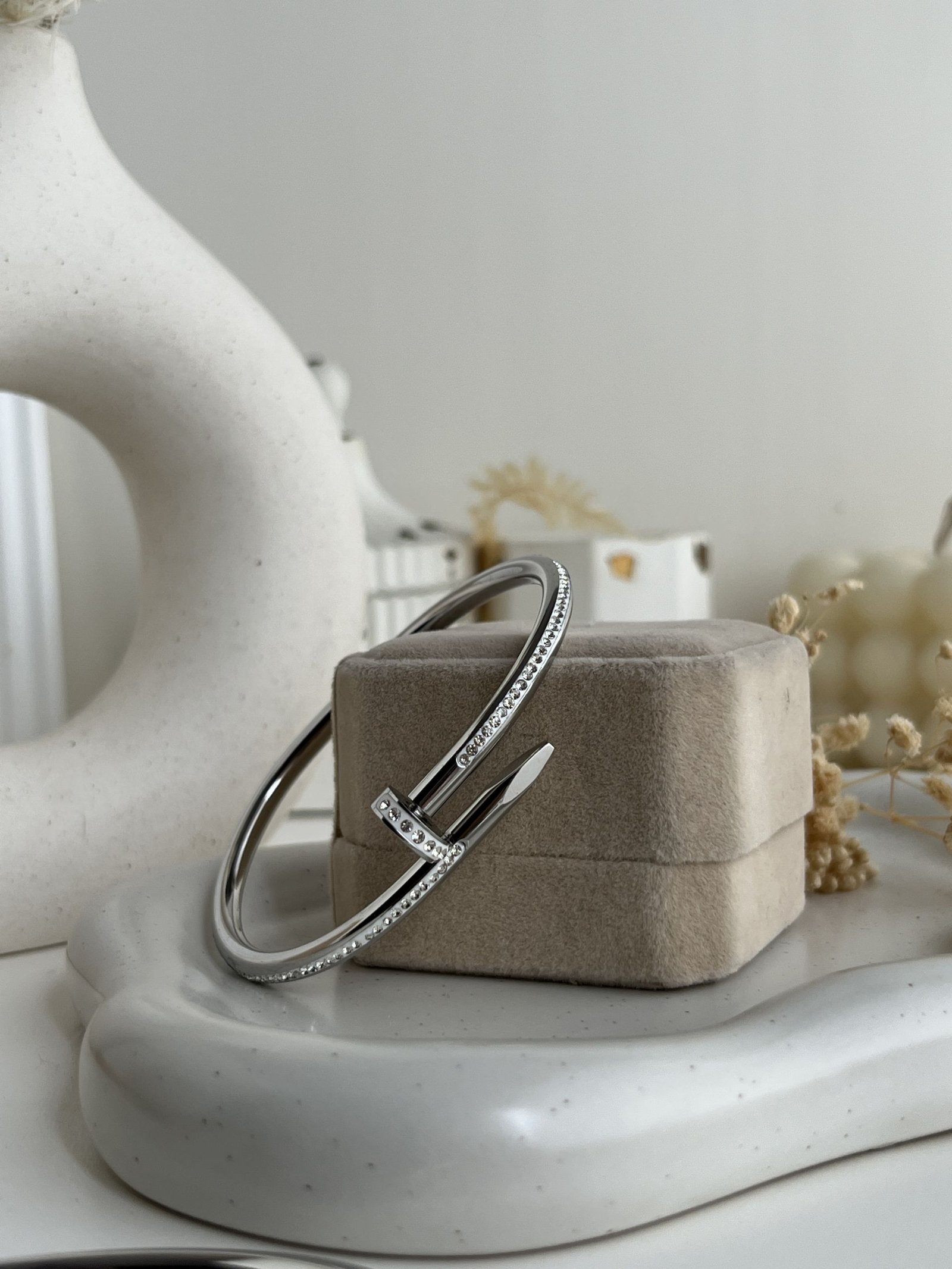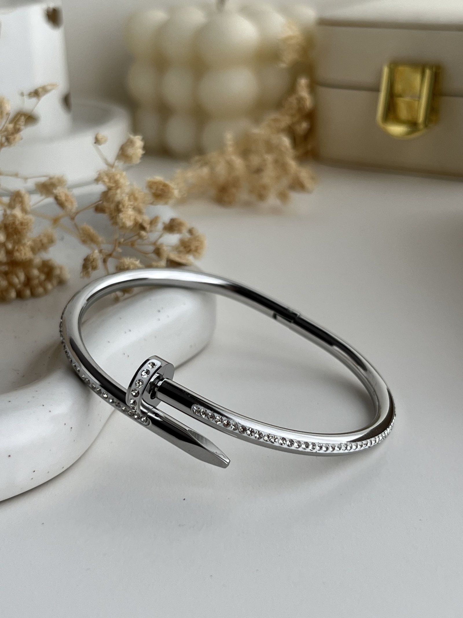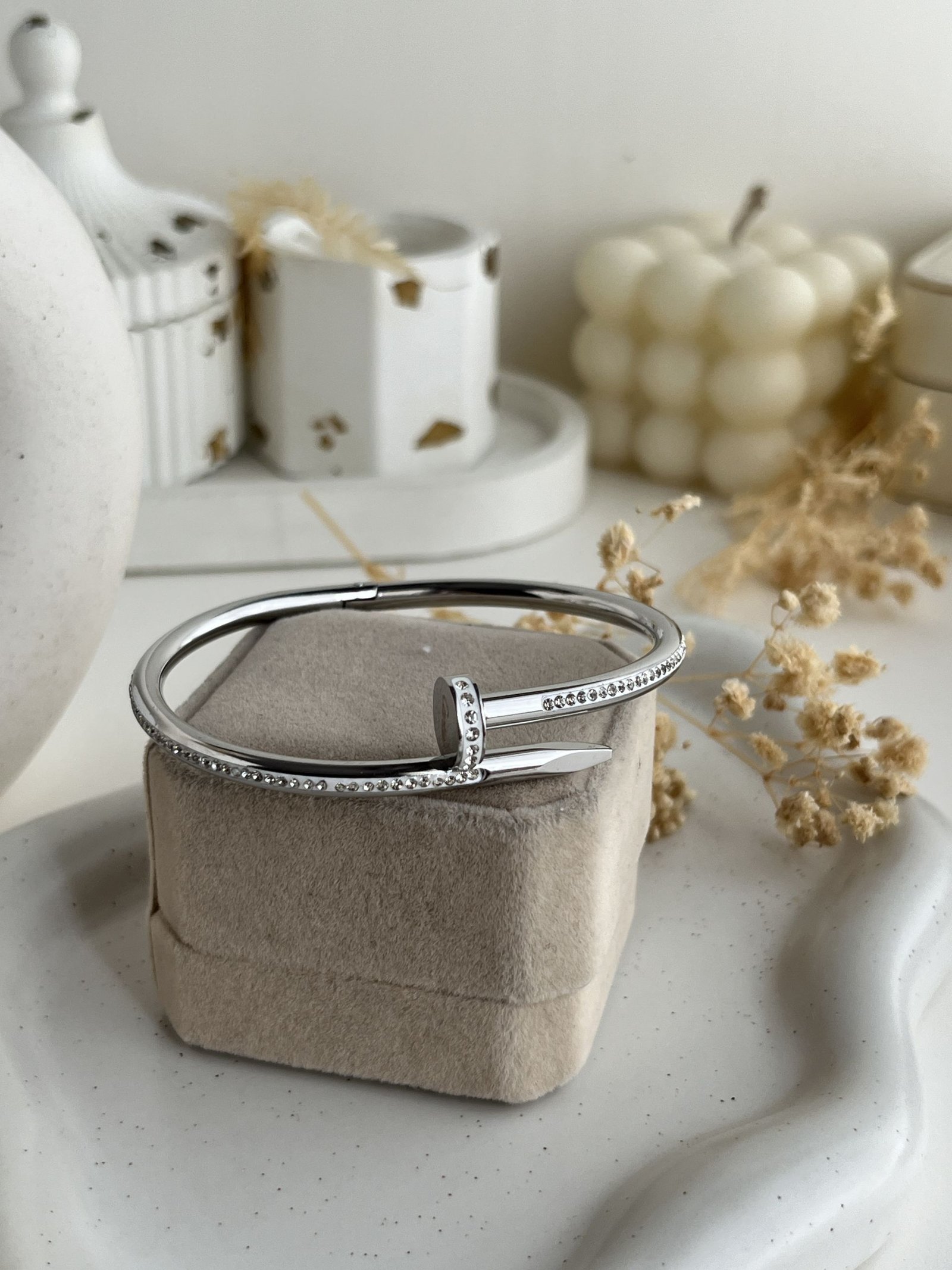 Aurex Pavé Nail Cuff showcases a modern nail-inspired structure enhanced with full micro-set cubic zirconia stones along the band, creating a balanced blend of edge and elegance. The polished gold-tone finish reflects light beautifully, giving the cuff a luxurious presence without overwhelming the wrist.