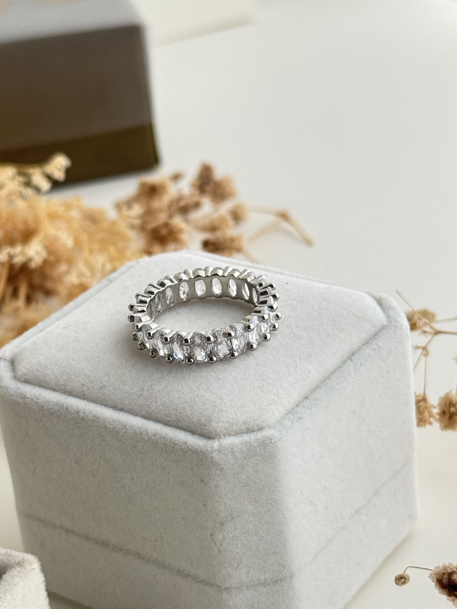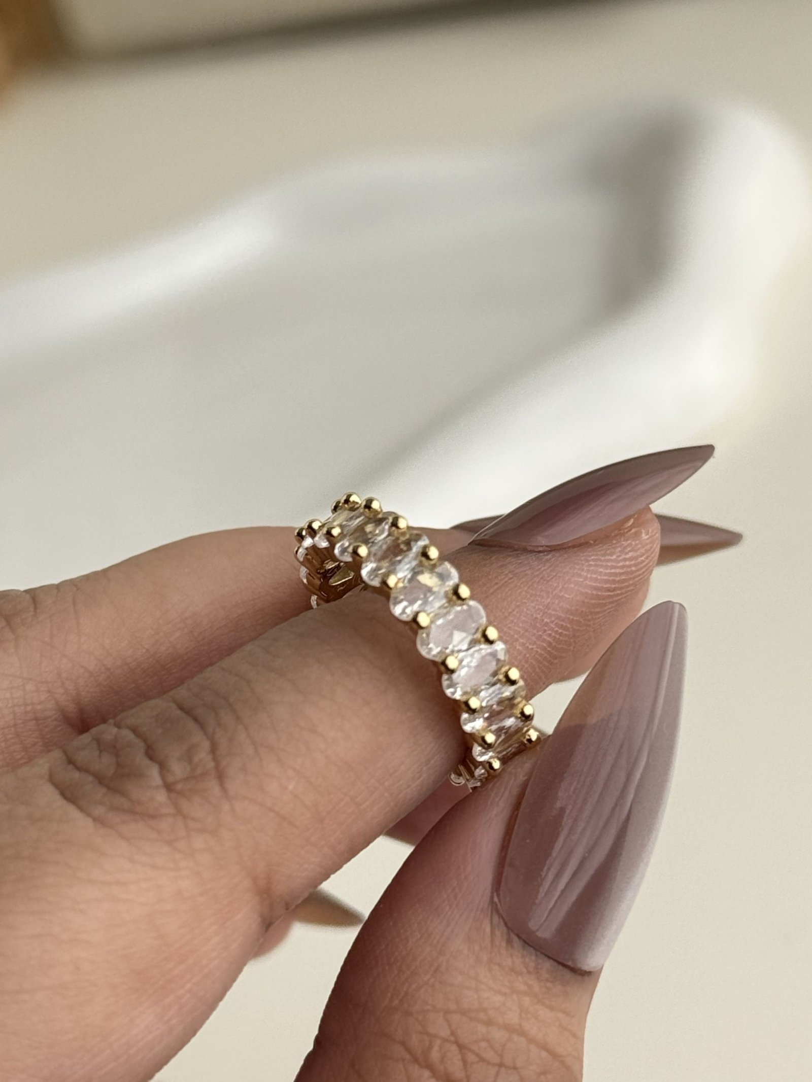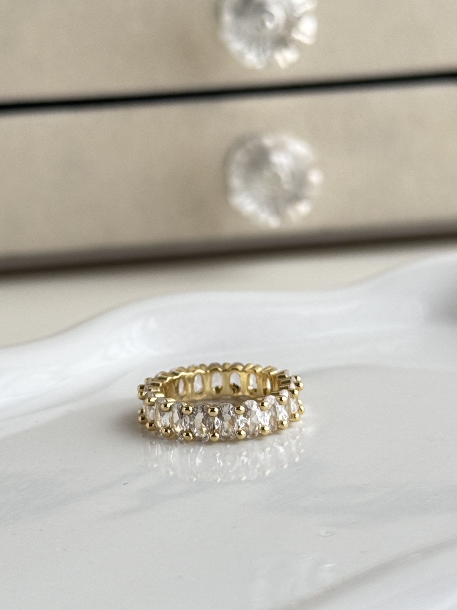 The Cassienne Oval Eternity Ring showcases a continuous row of oval-cut clear stones arranged in a classic eternity band design, delivering balanced sparkle with a refined profile. Its slim, structured form offers comfortable wear while maintaining a graceful visual flow that pairs effortlessly with both minimalist bands and statement rings. Finished in gold-plated copper, this ring provides a luminous appearance with lightweight flexibility, making it ideal for elegant everyday styling and special occasion layering.