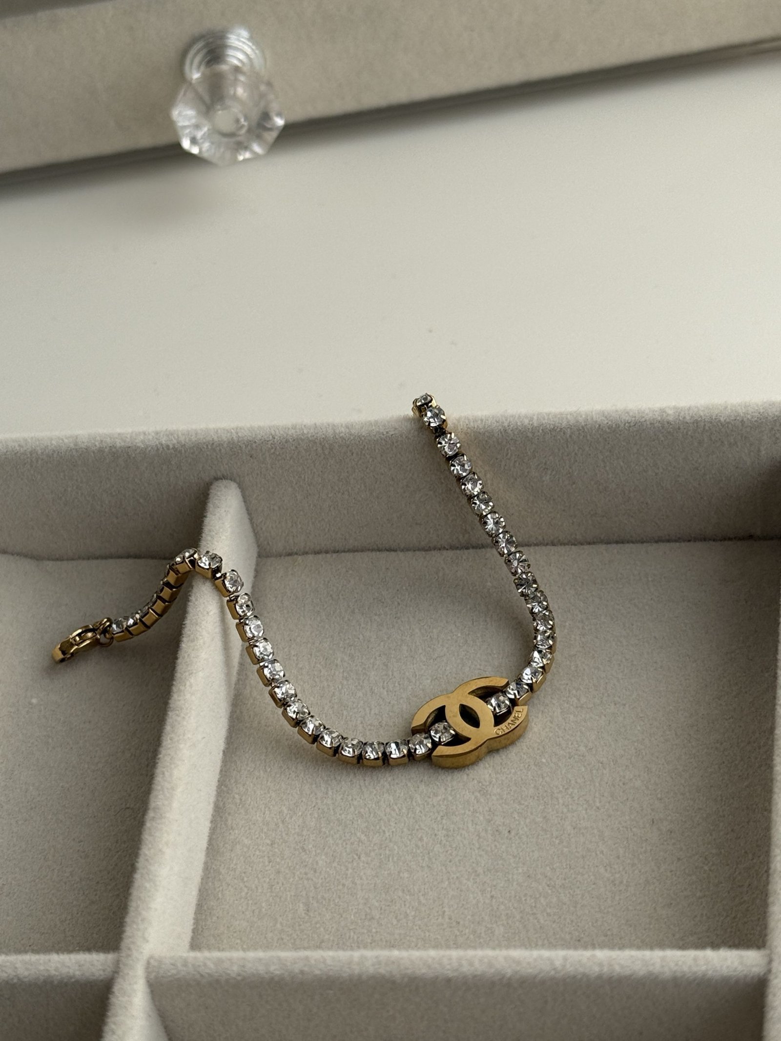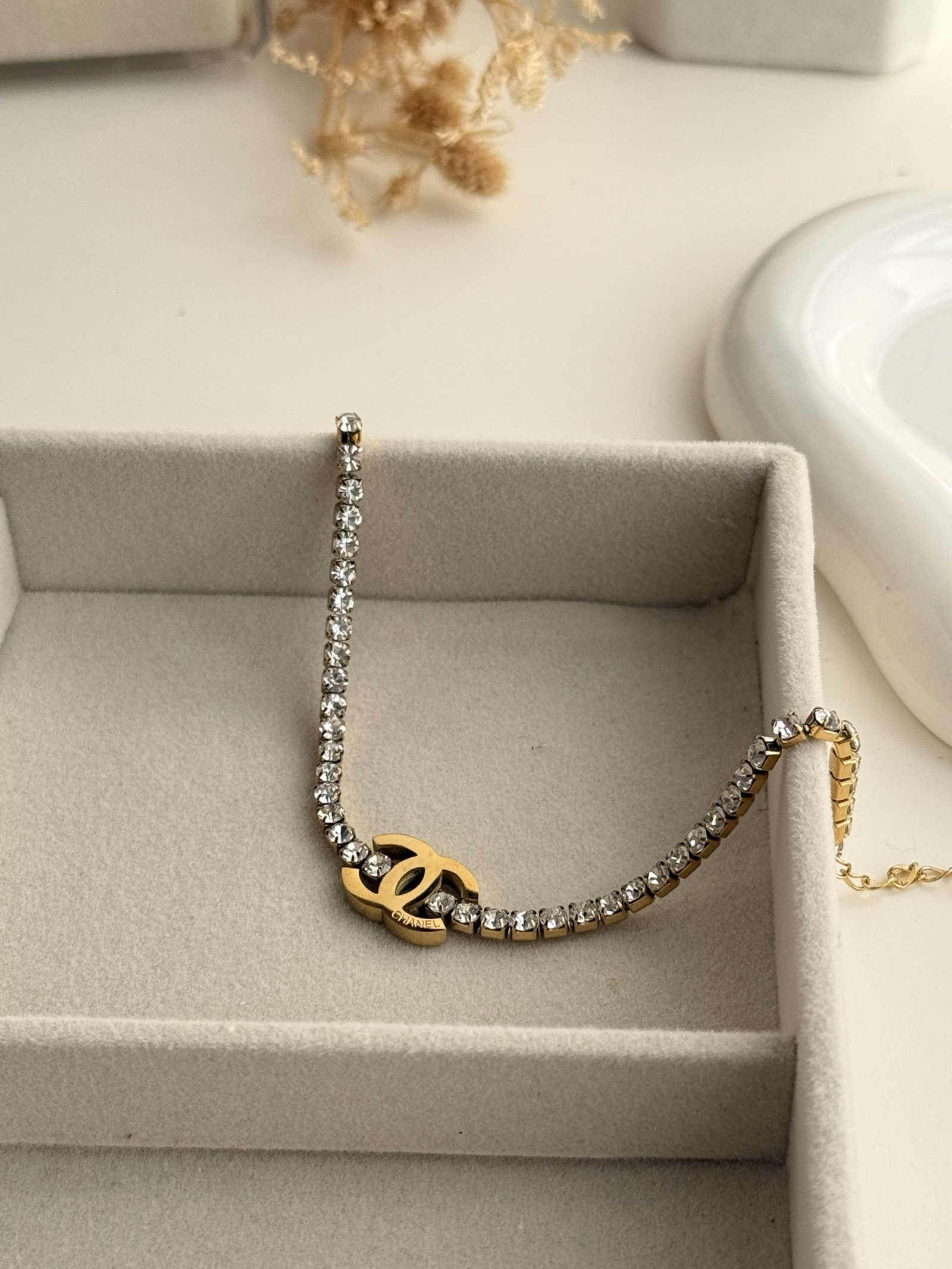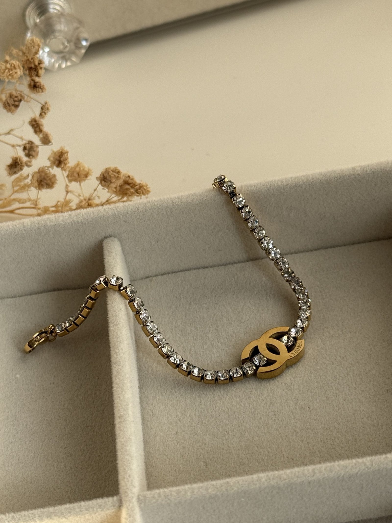 A luxurious gold-tone crystal chain bracelet featuring an iconic double-letter charm for elegant everyday wear.