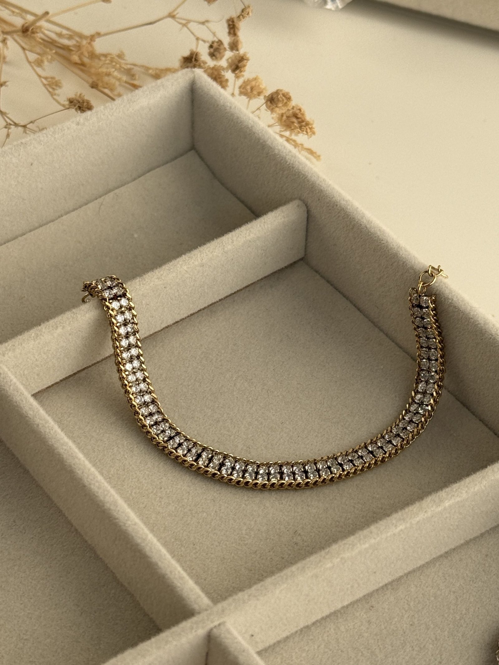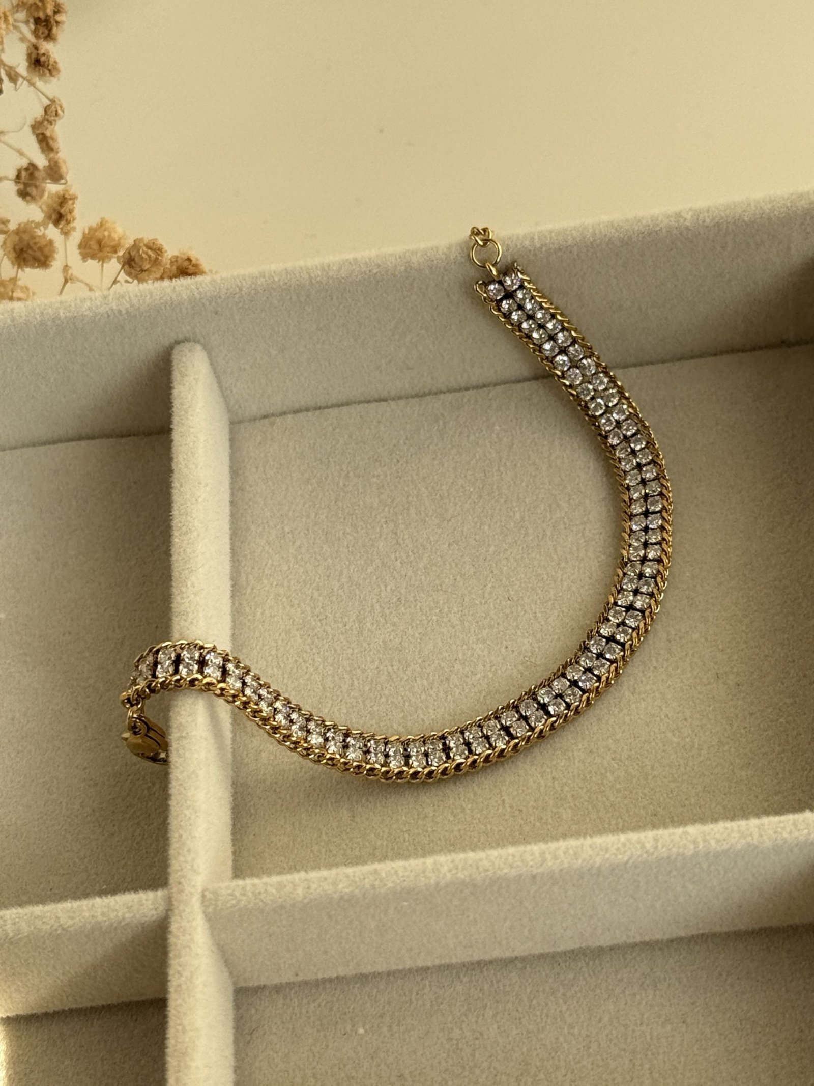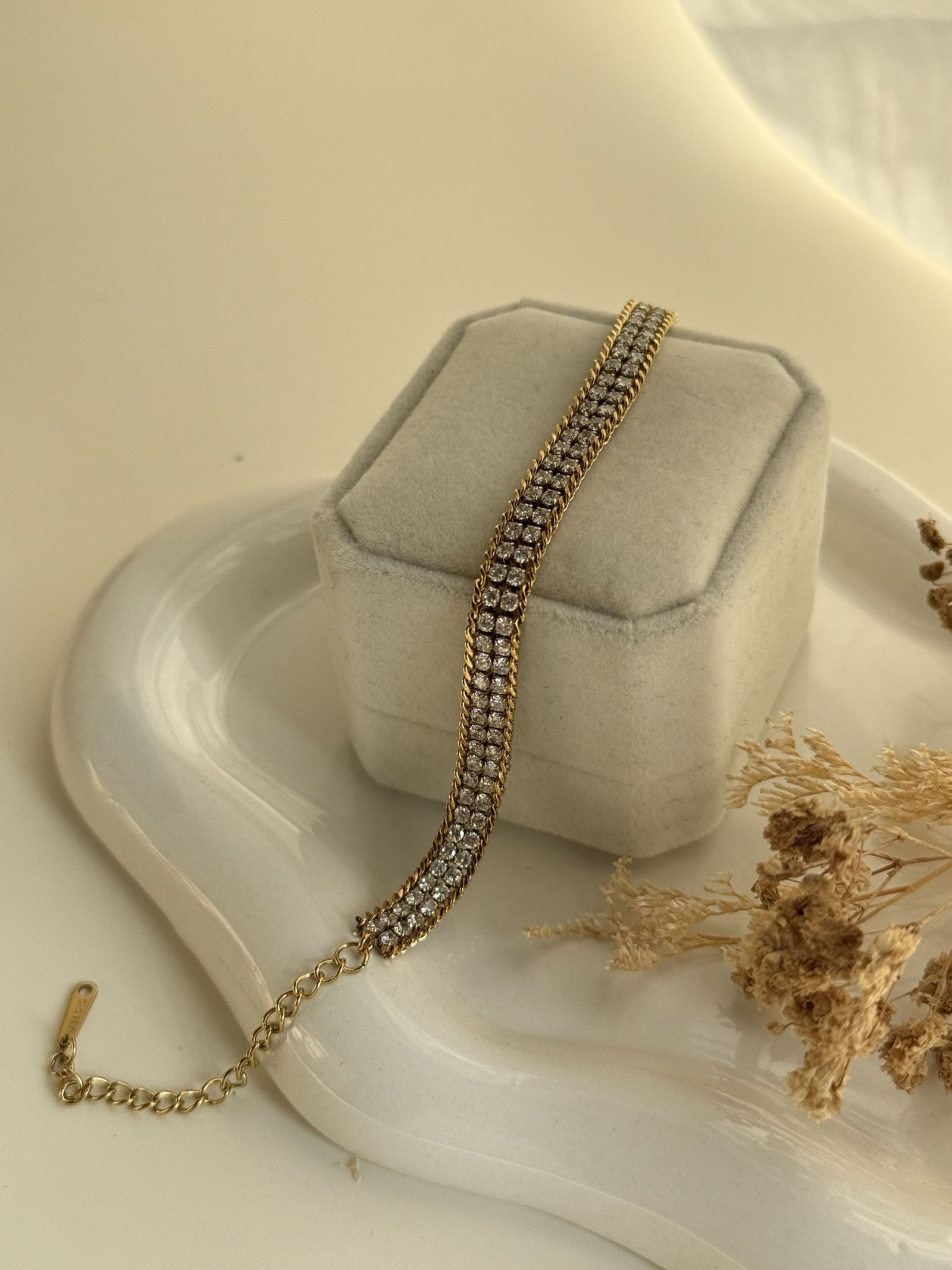A refined gold-tone double-row crystal chain bracelet designed to deliver elegant sparkle with a sleek modern silhouette.