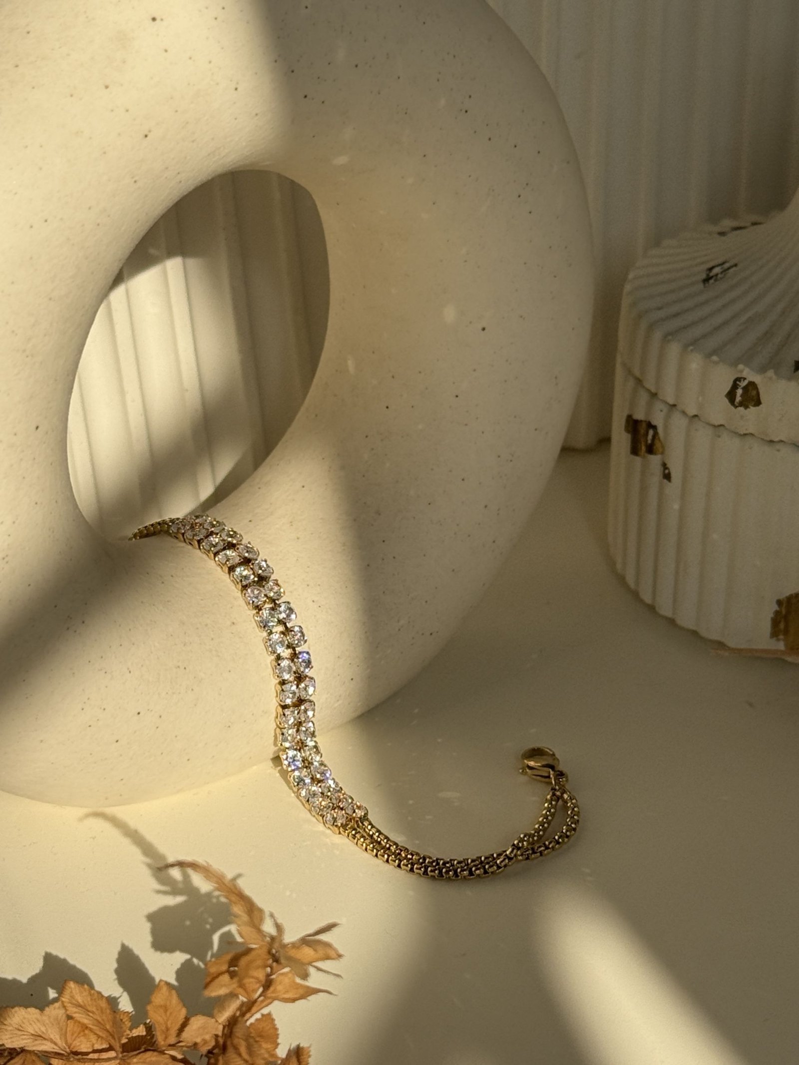 This elegant bracelet features a dual-row crystal design set on a polished gold-tone titanium stainless steel base, creating a layered sparkle effect with a clean, contemporary finish. The double-chain structure enhances brilliance while maintaining lightweight comfort for extended wear.