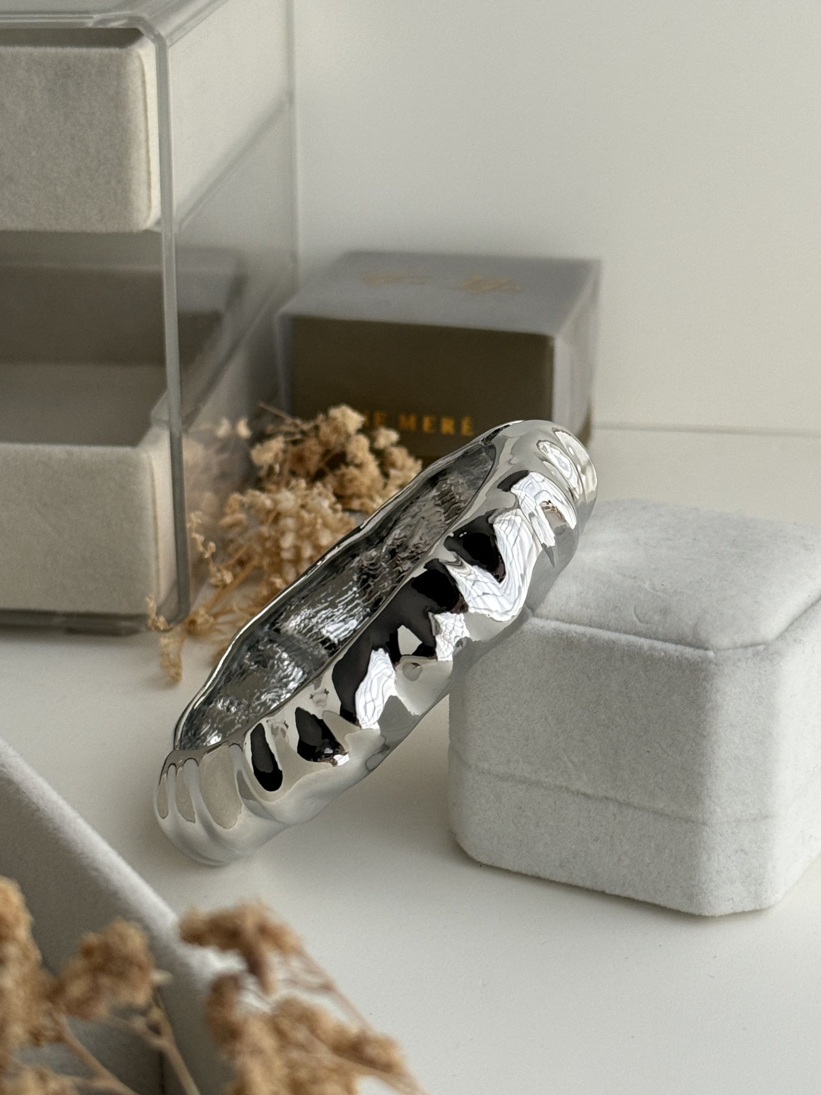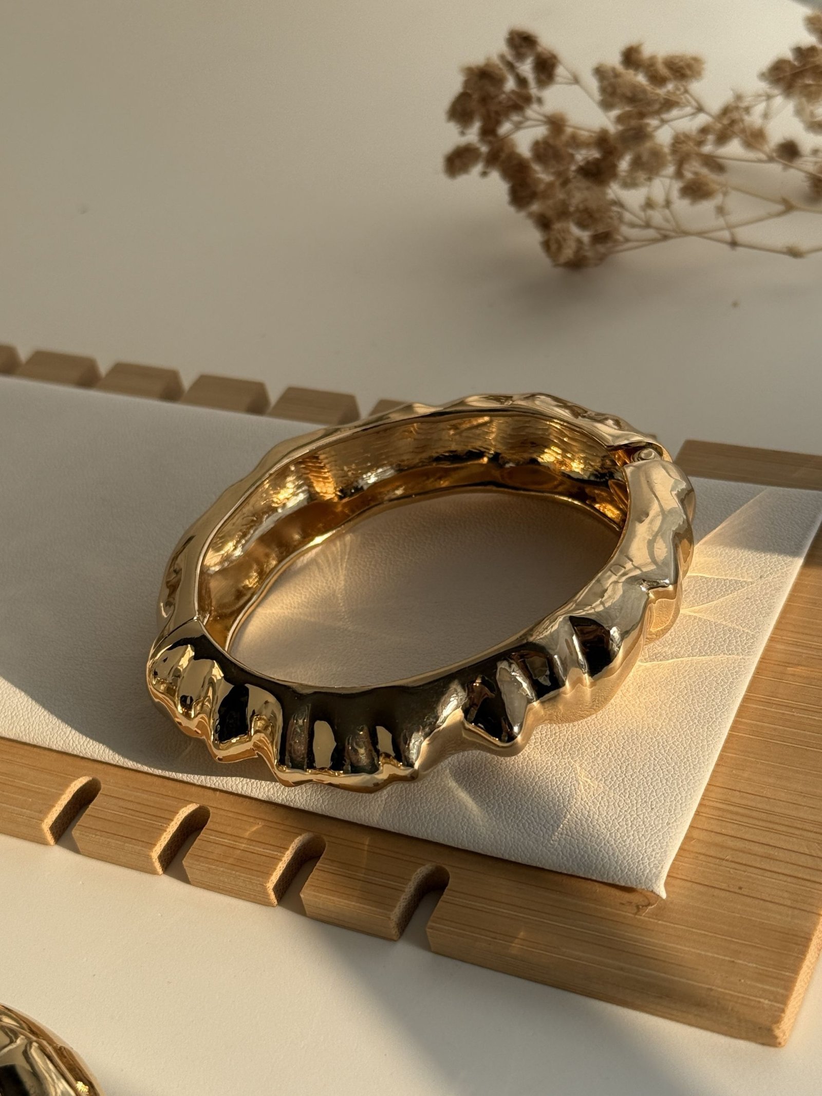 Elara Ripple Luxe Cuff is designed for bold yet refined elegance. The softly contoured ripple texture reflects light beautifully, creating a dynamic and luxurious appearance. Crafted from premium gold-plated copper, this cuff offers durability while maintaining a polished designer aesthetic.