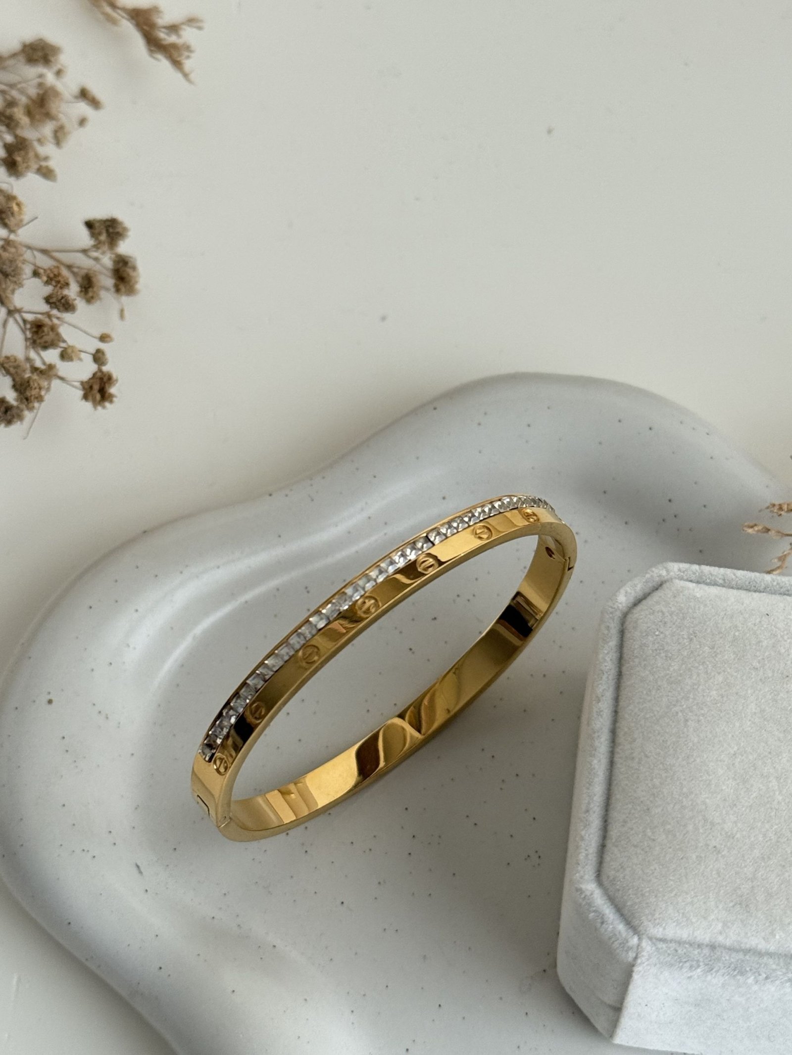Γterna PavΓ© Cuff is designed with a clean oval silhouette, finished in a luminous gold tone and detailed with a line of pavΓ©-style stones set into the center of the band. Subtle screw-inspired accents add structure and balance, giving the cuff a refined, iconic look without overwhelming the design.