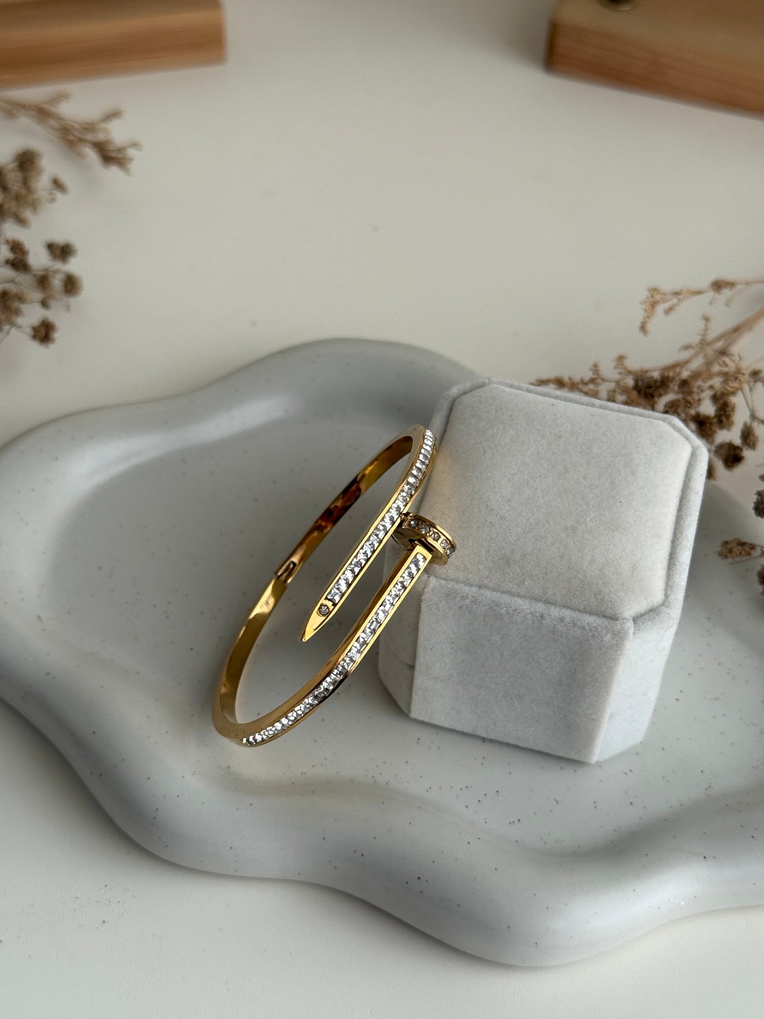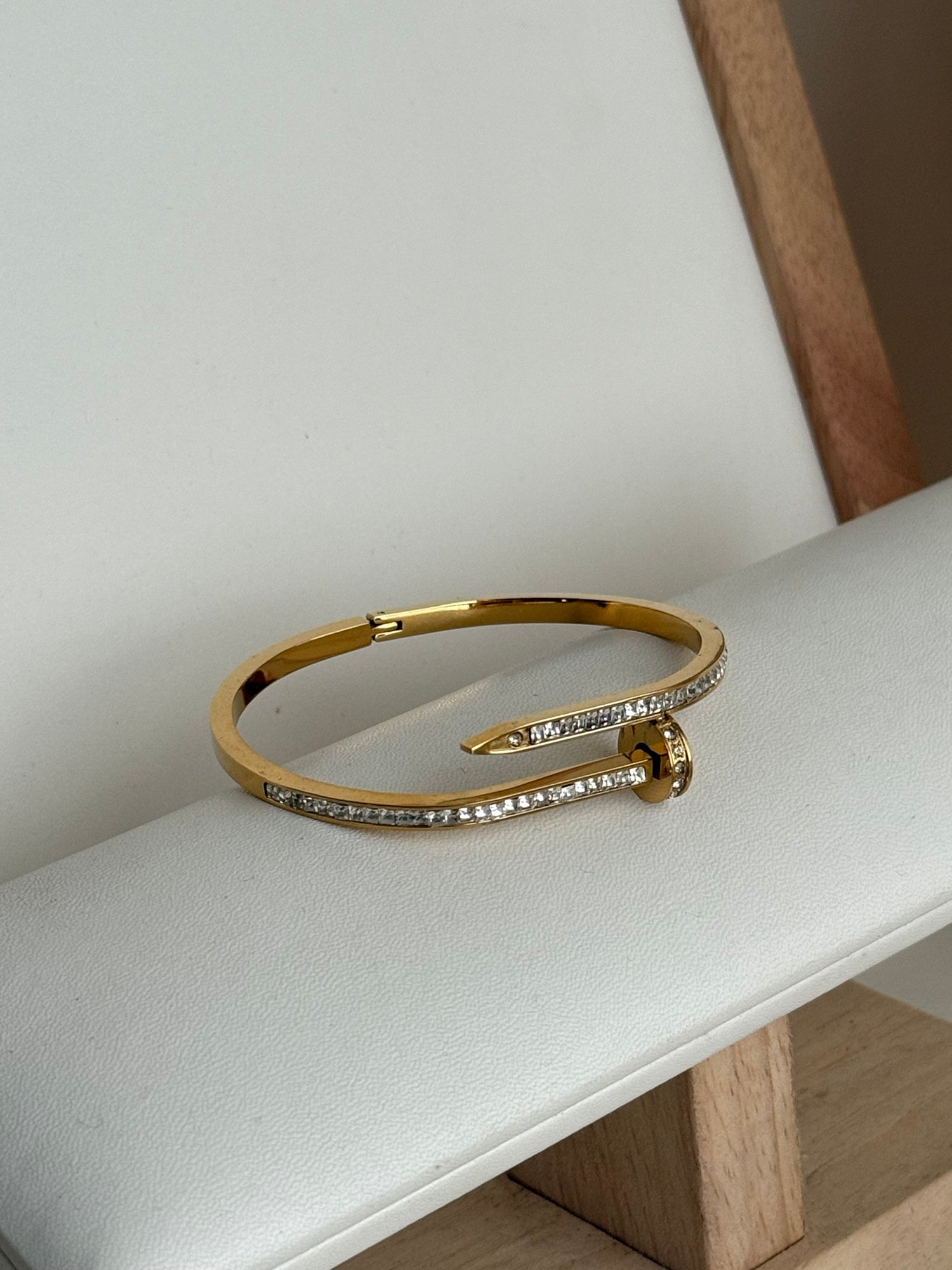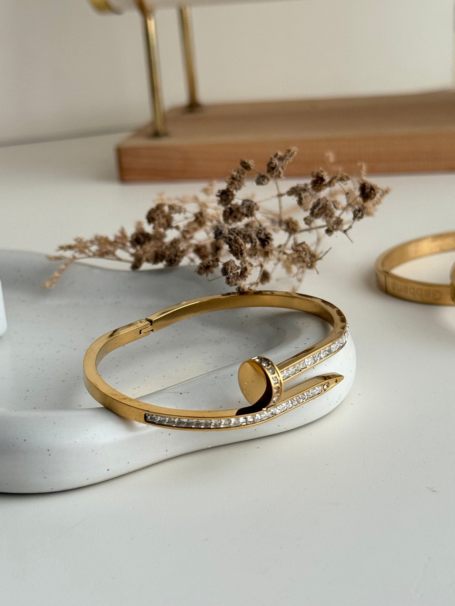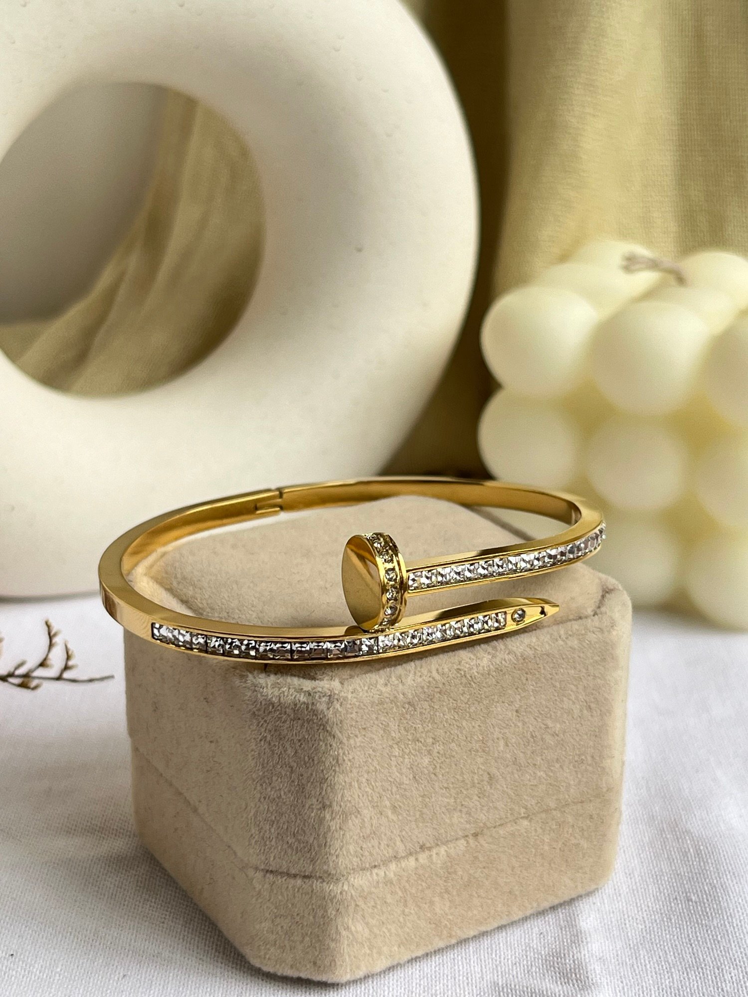 A titanium stainless steel nail-style cuff with a gold-tone finish and crystal detailing. Designed in an oval bangle shape with a center screw opening for a secure and comfortable fit.