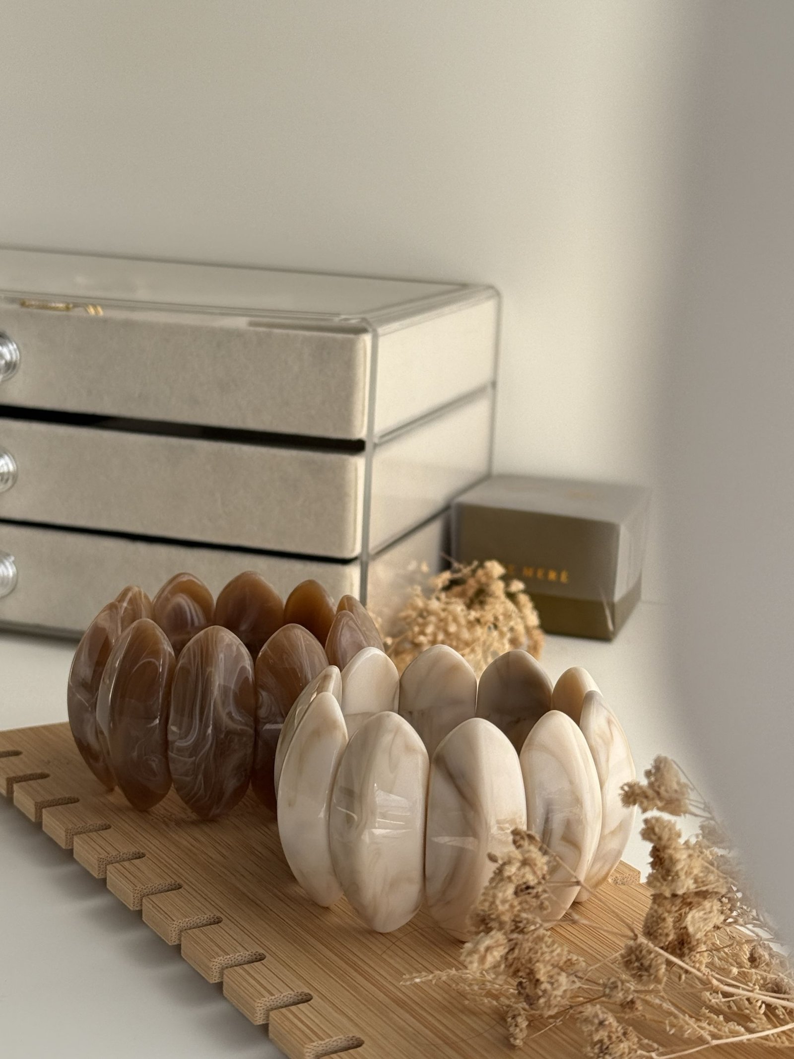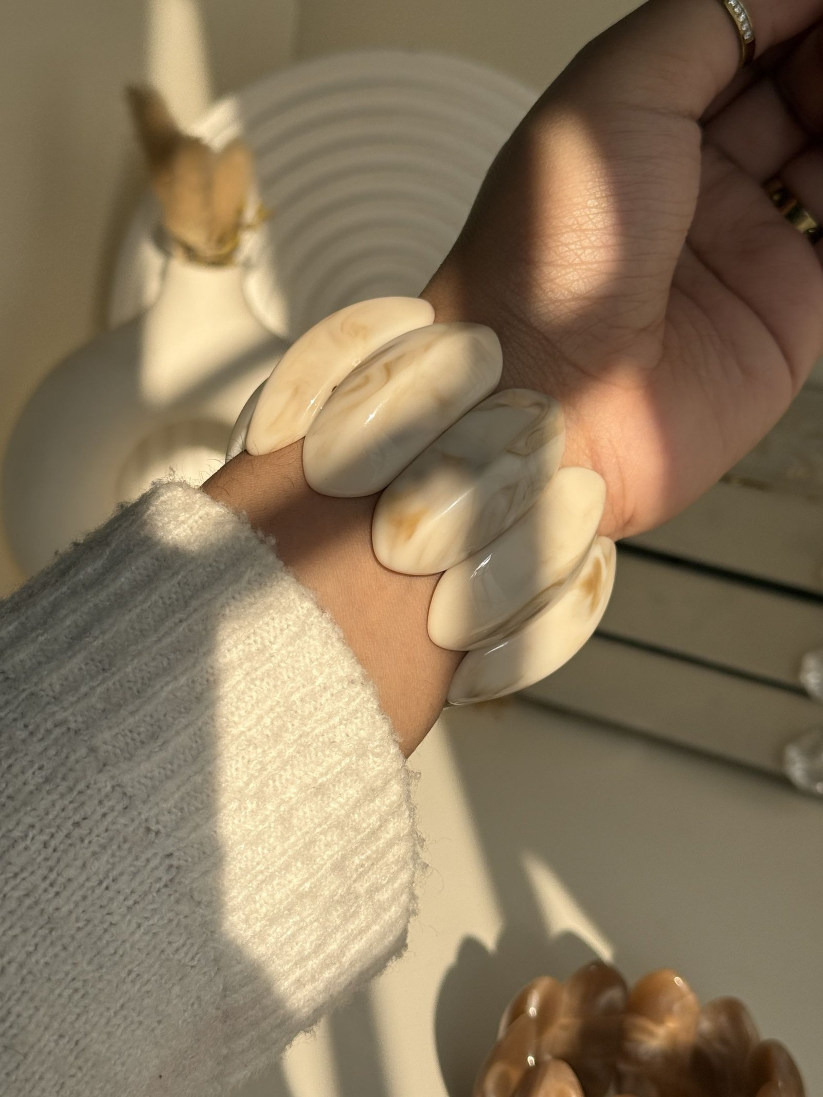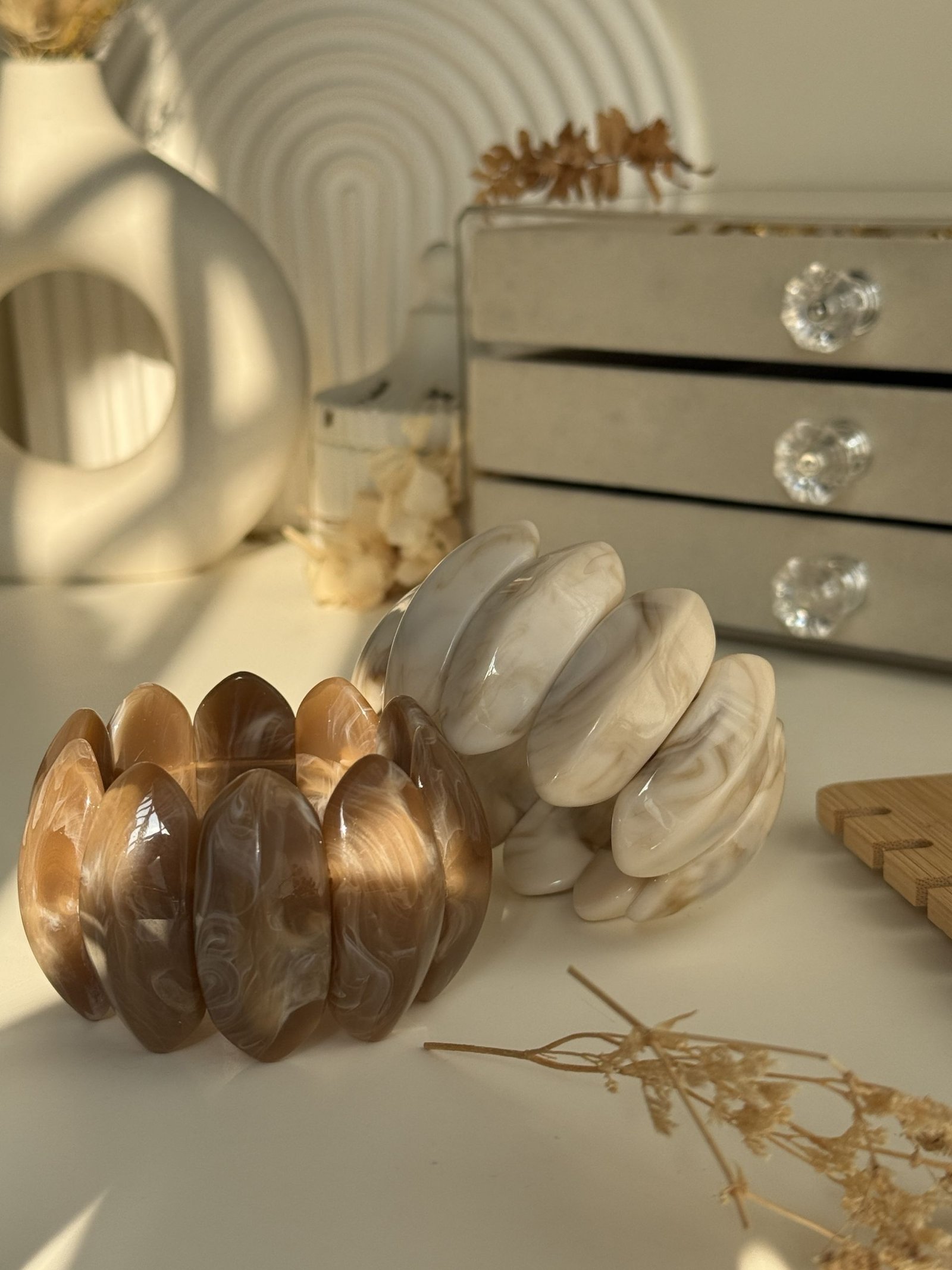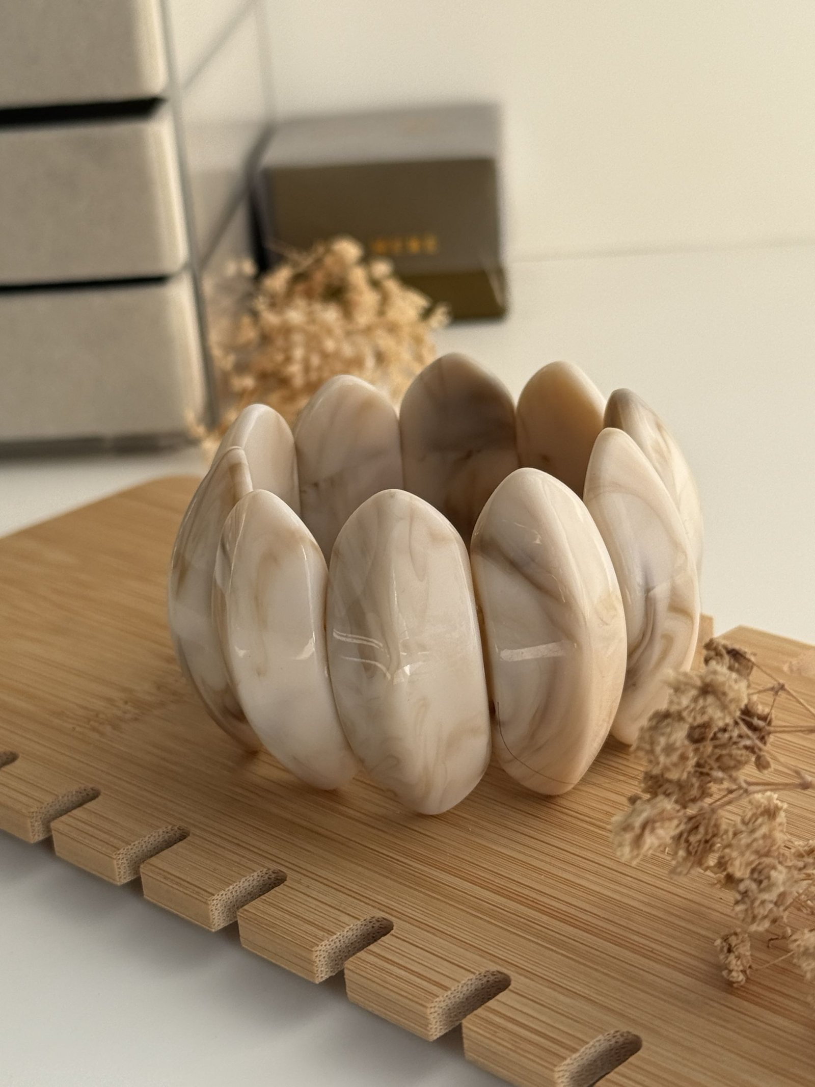 Geometric Resin Stretch Cuff is designed for contemporary styling with its sculpted oval segments and rich marbled resin texture. The stretch construction allows easy slip-on wear while maintaining a secure and comfortable fit. Its wide profile adds bold presence, making it ideal for statement outfits, casual styling, and layered wrist combinations.