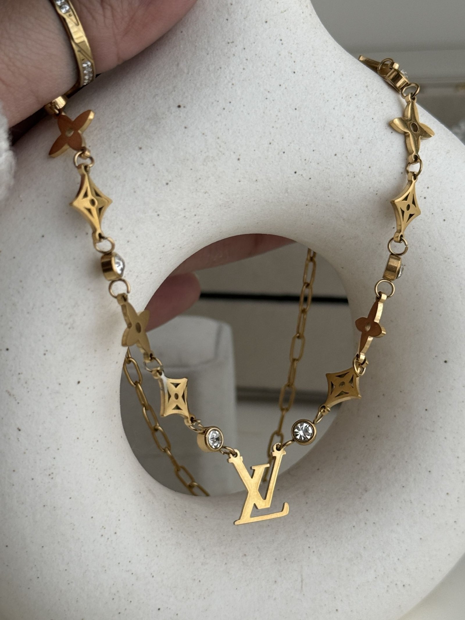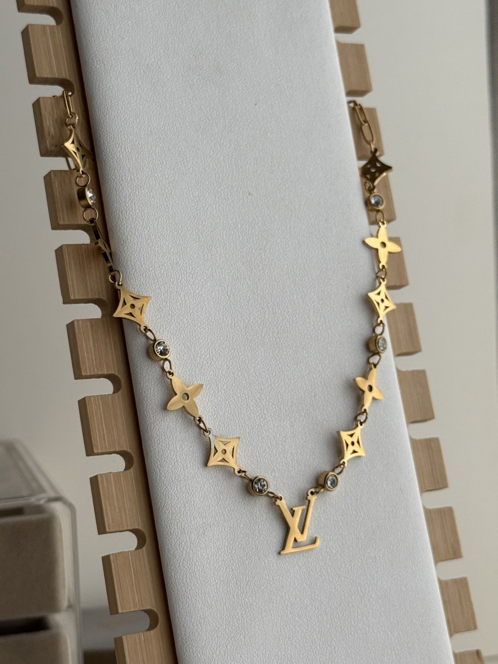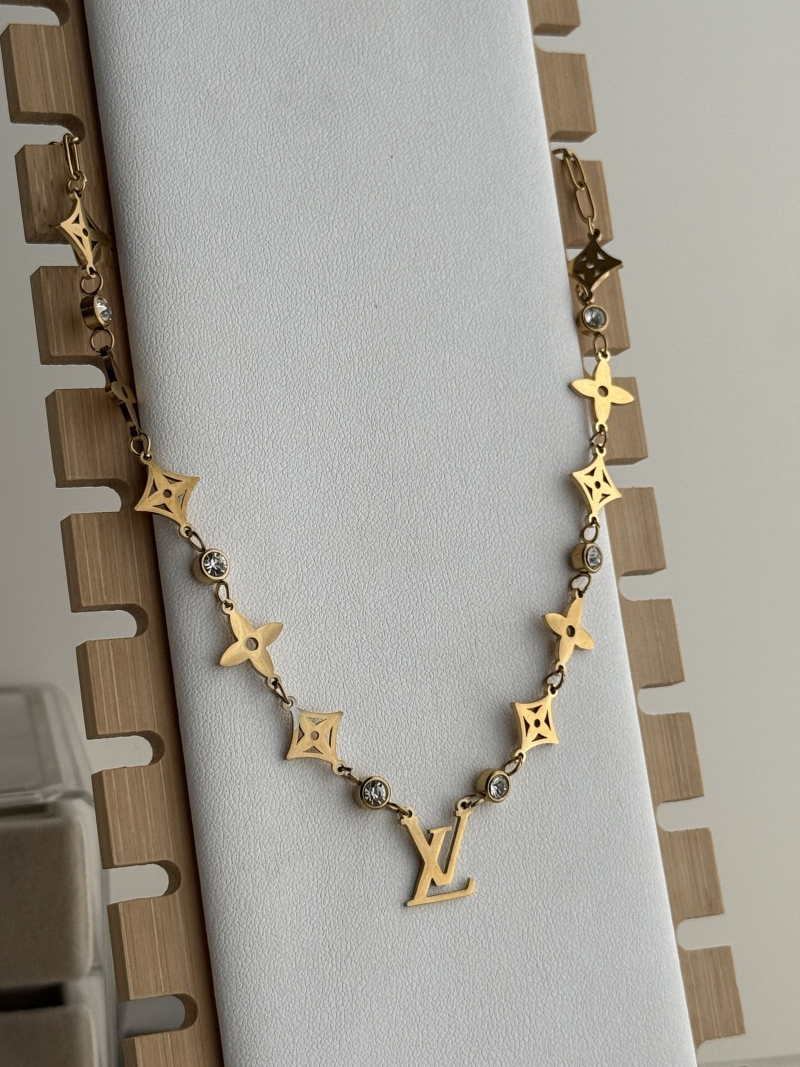 This statement necklace showcases a refined monogram-inspired initial charm paired with decorative floral motifs and subtle crystal accents. Designed with a balanced charm layout, it delivers a bold yet elegant aesthetic that elevates both casual and formal looks.