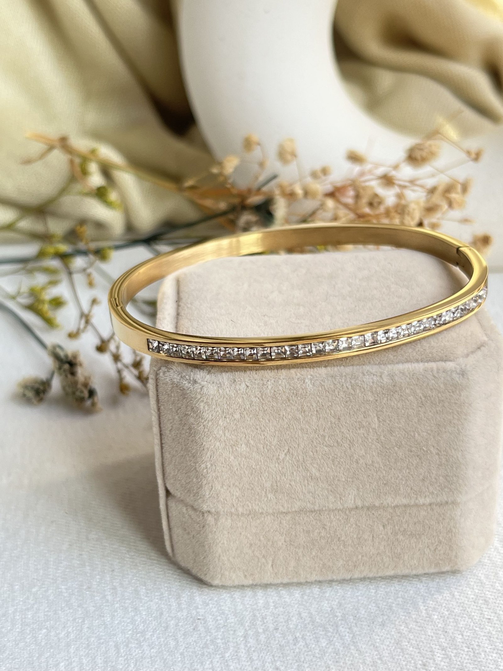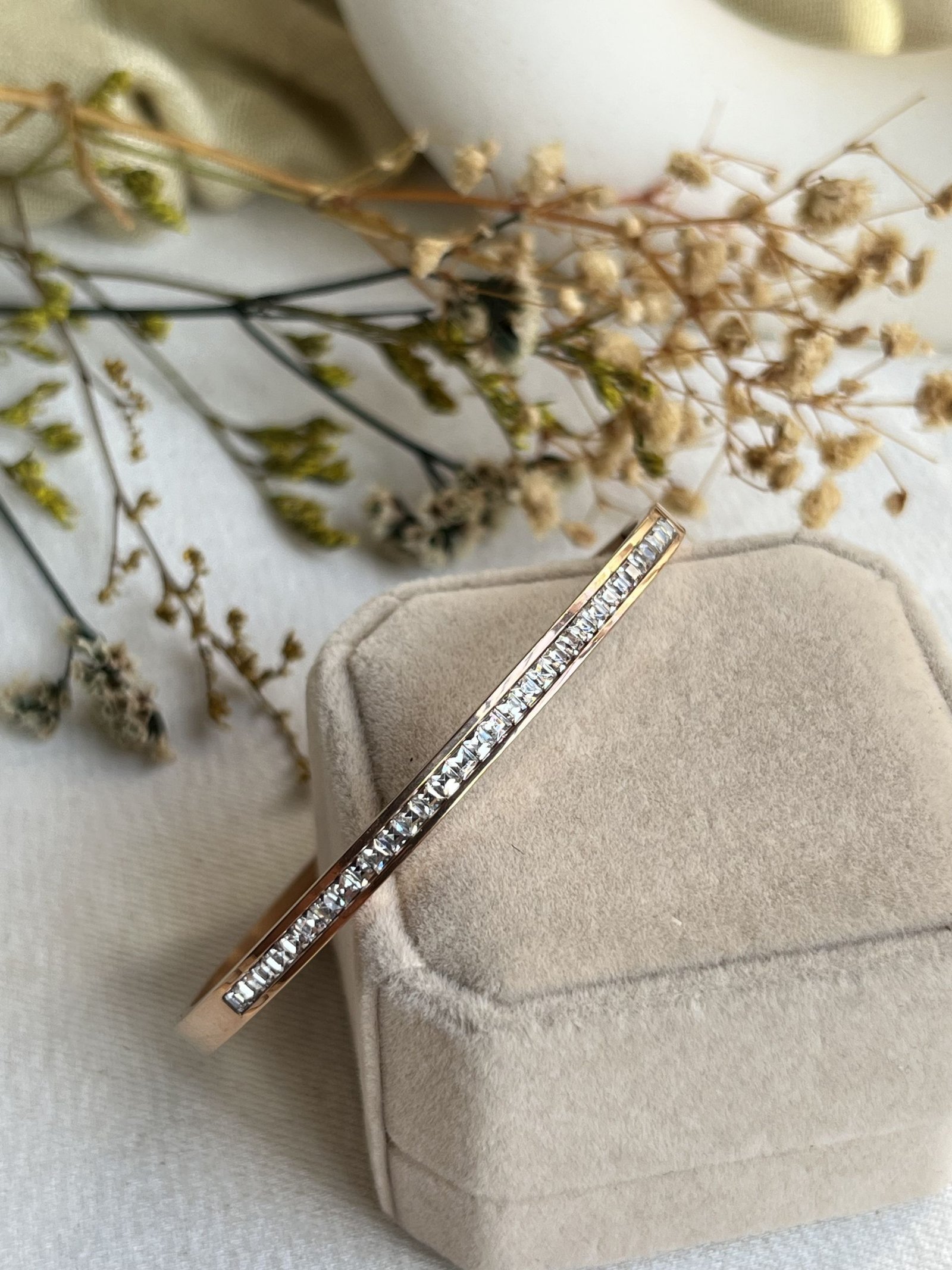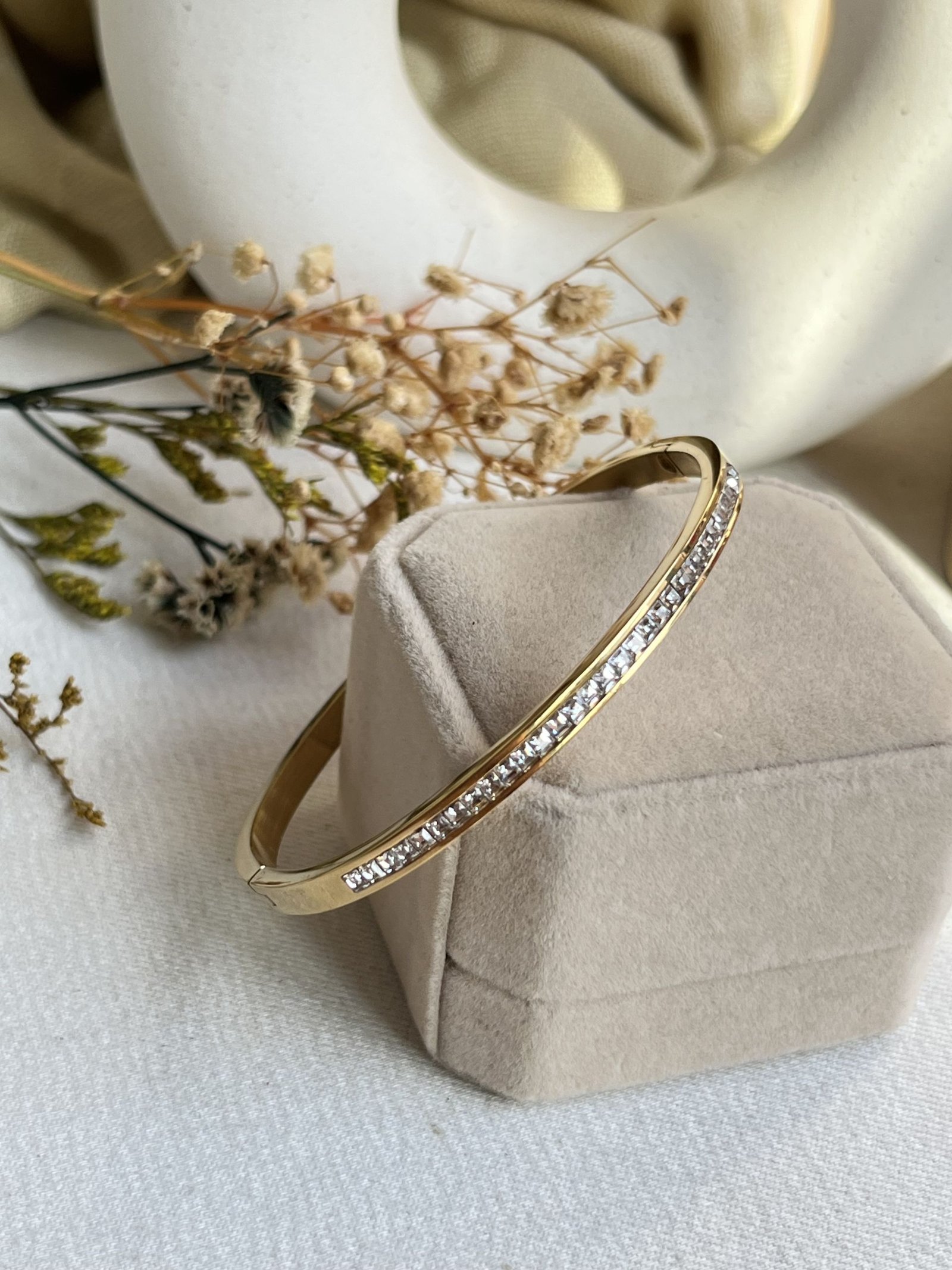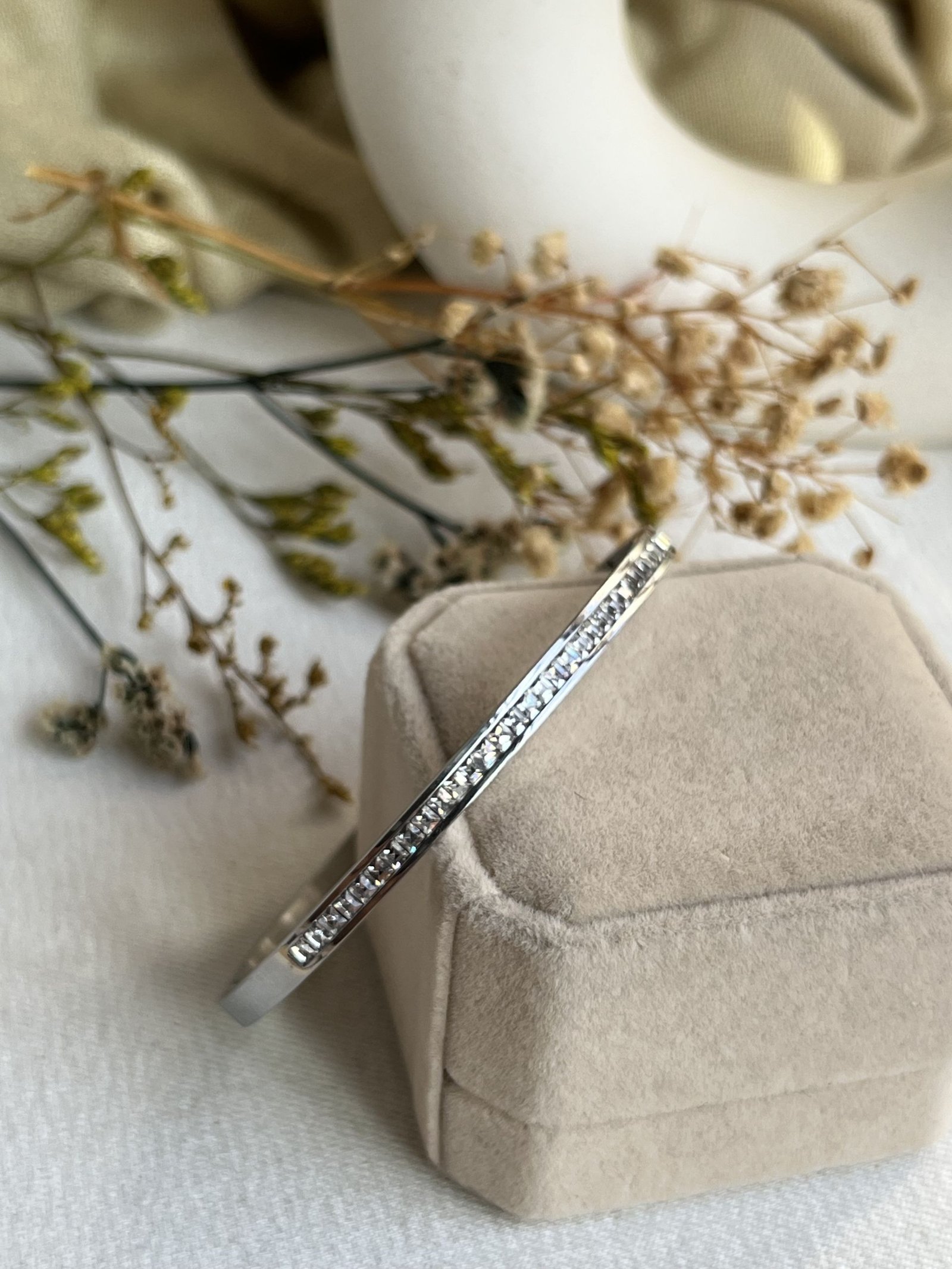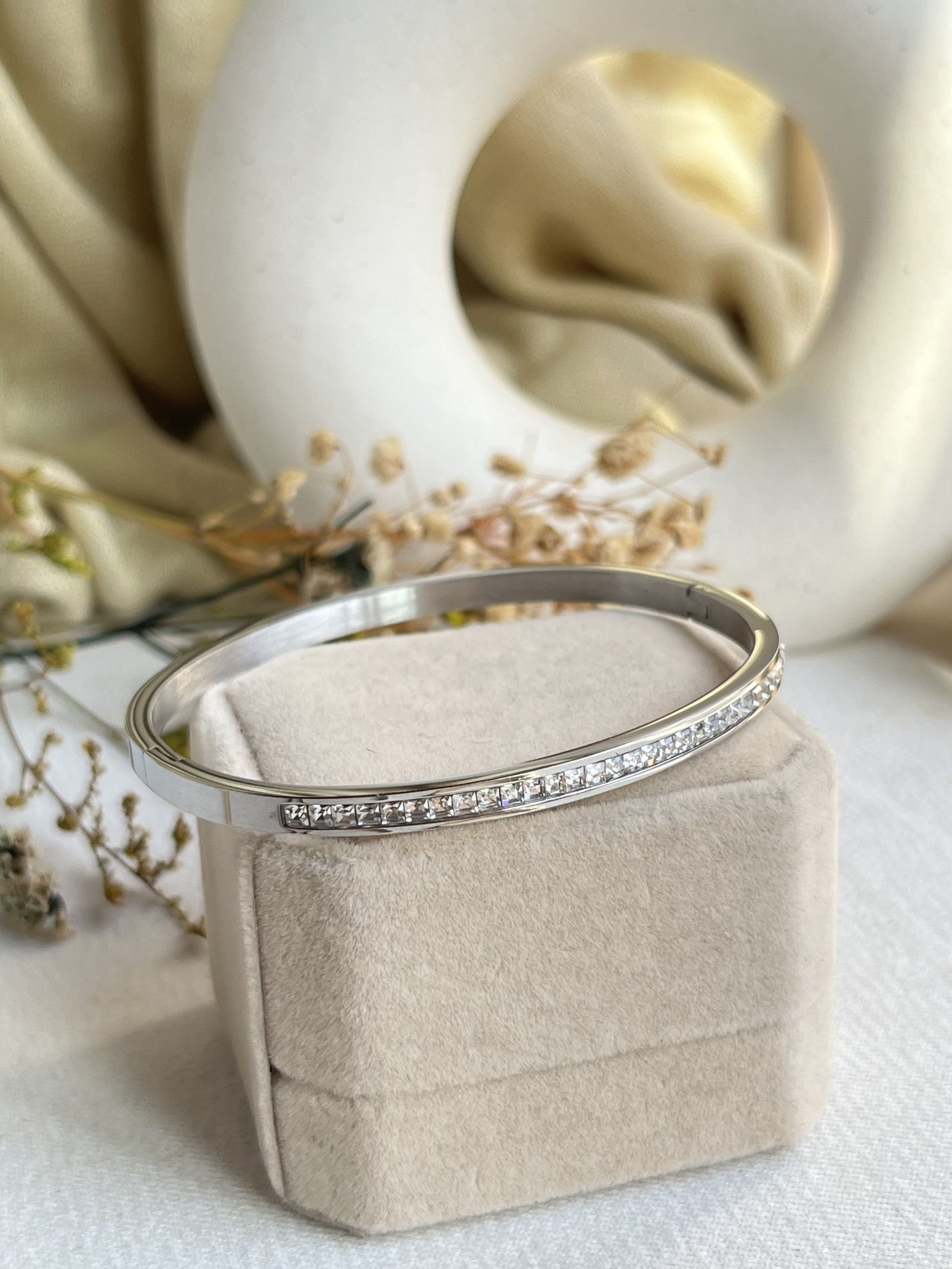 “Lunara Diamond Line Bangle is designed with a clean, structured profile that blends everyday comfort with luxury detailing. The cubic zirconia stones are precisely set along the center line, creating a continuous shimmer effect while maintaining a lightweight and balanced feel on the wrist.