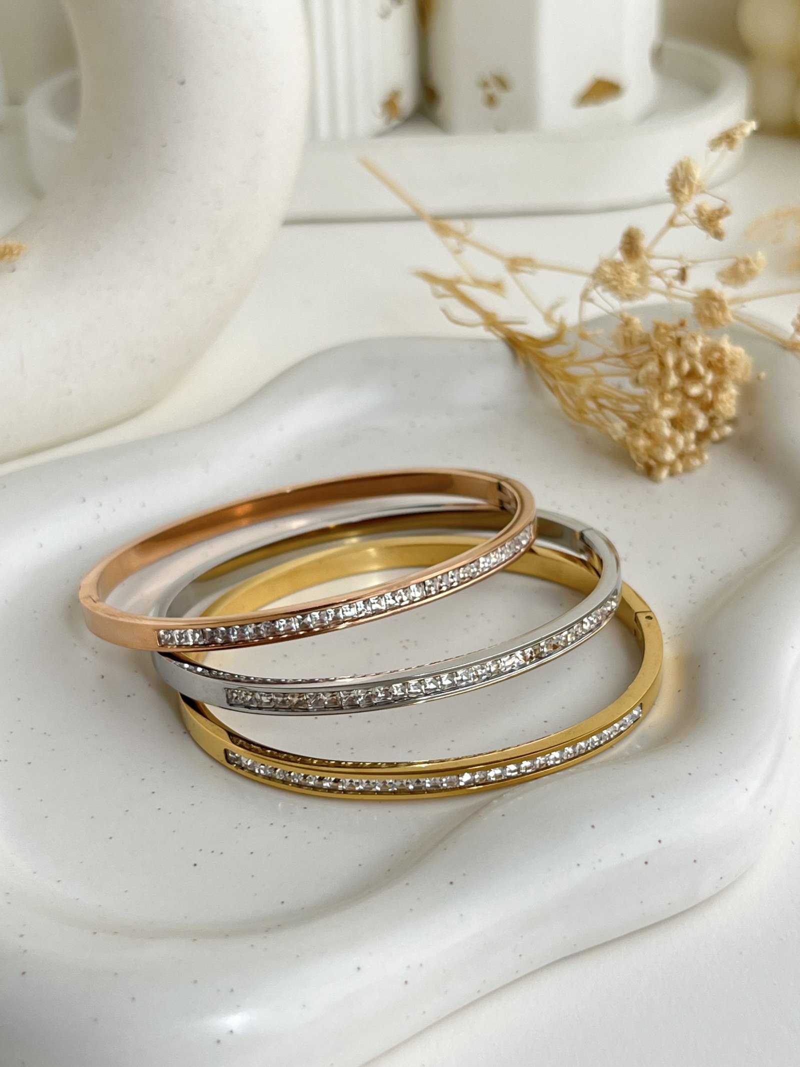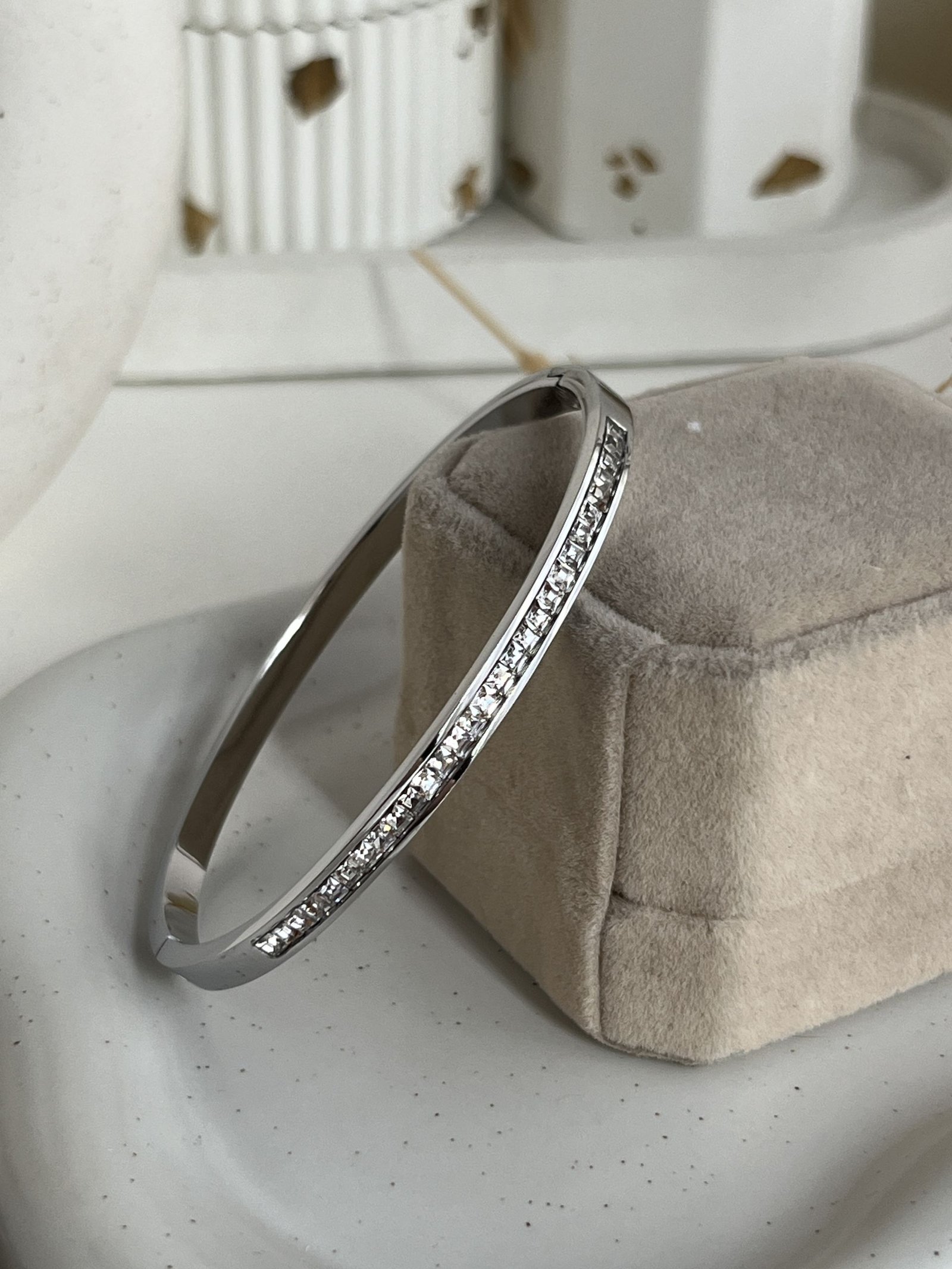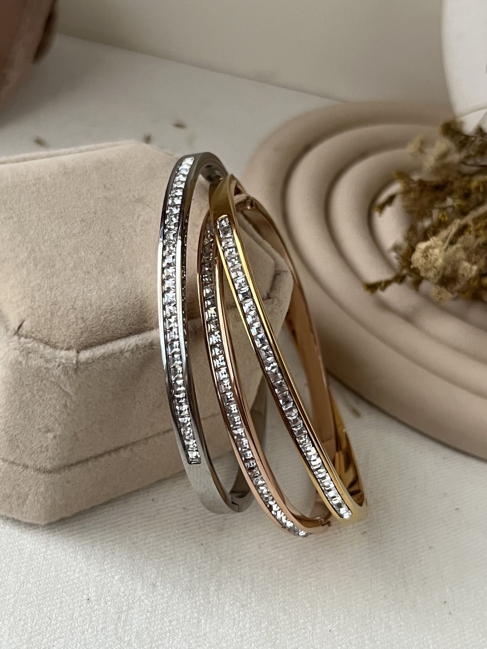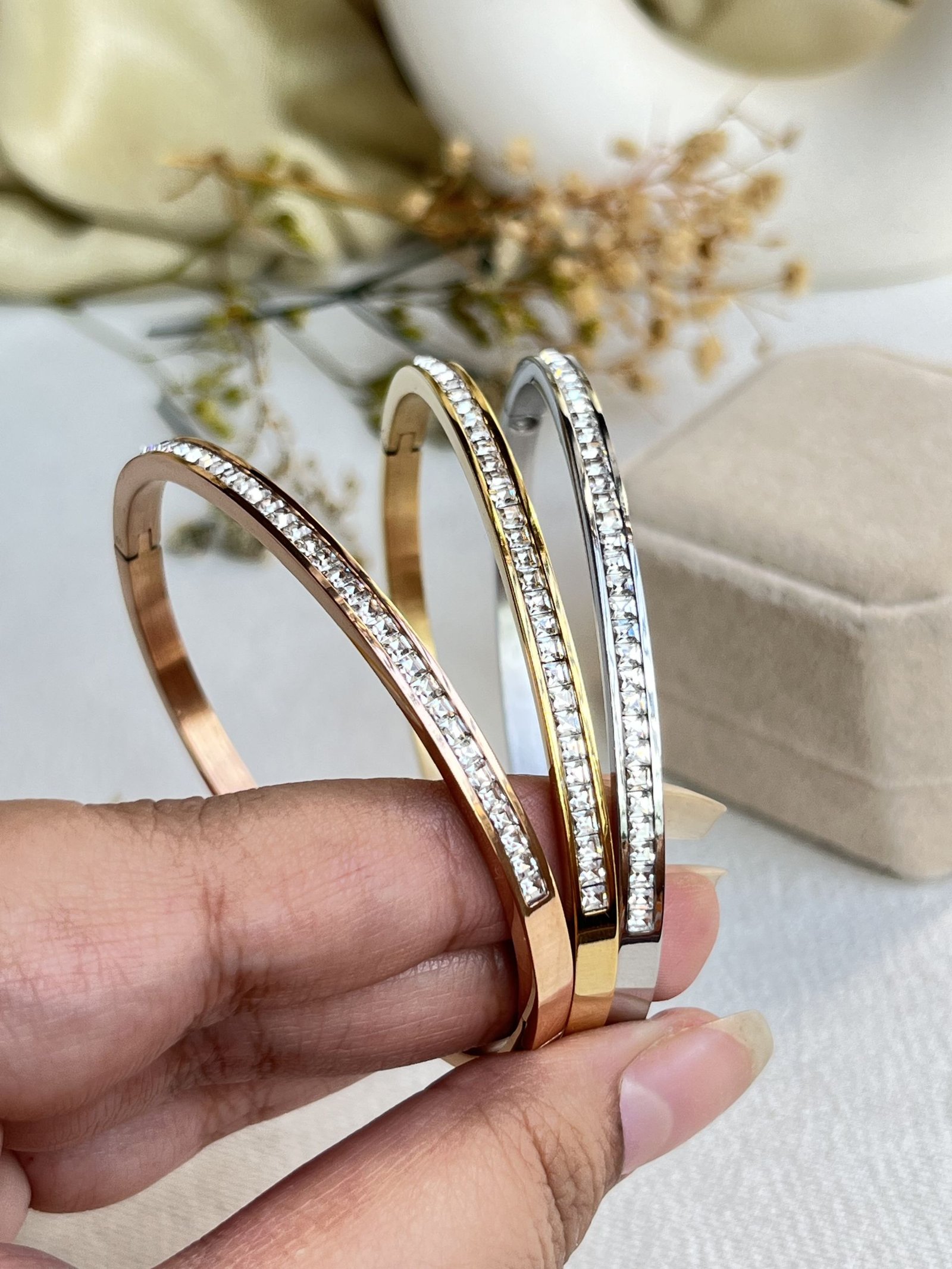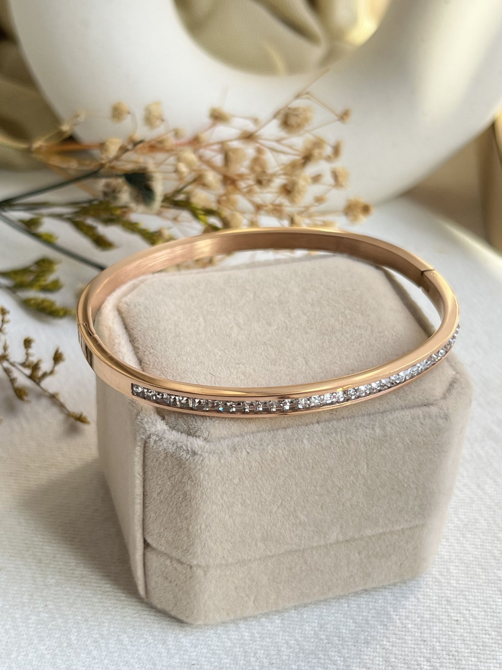 “Lunara Diamond Line Bangle is designed with a clean, structured profile that blends everyday comfort with luxury detailing. The cubic zirconia stones are precisely set along the center line, creating a continuous shimmer effect while maintaining a lightweight and balanced feel on the wrist.