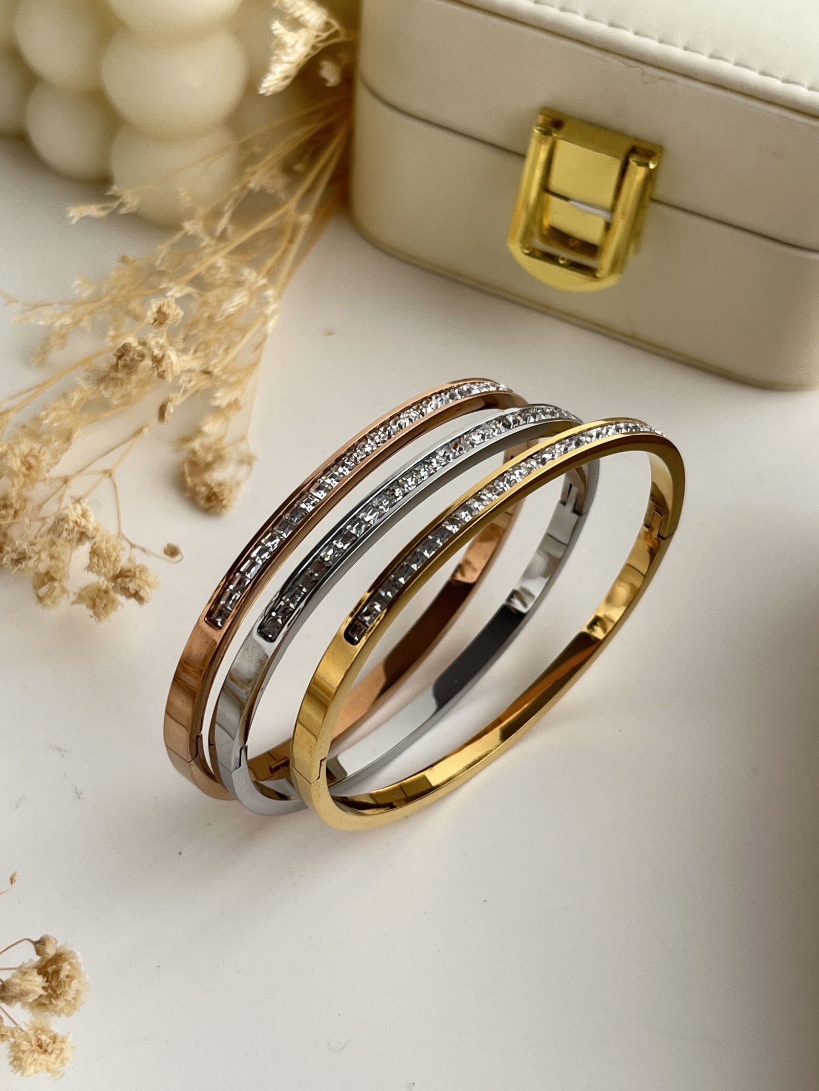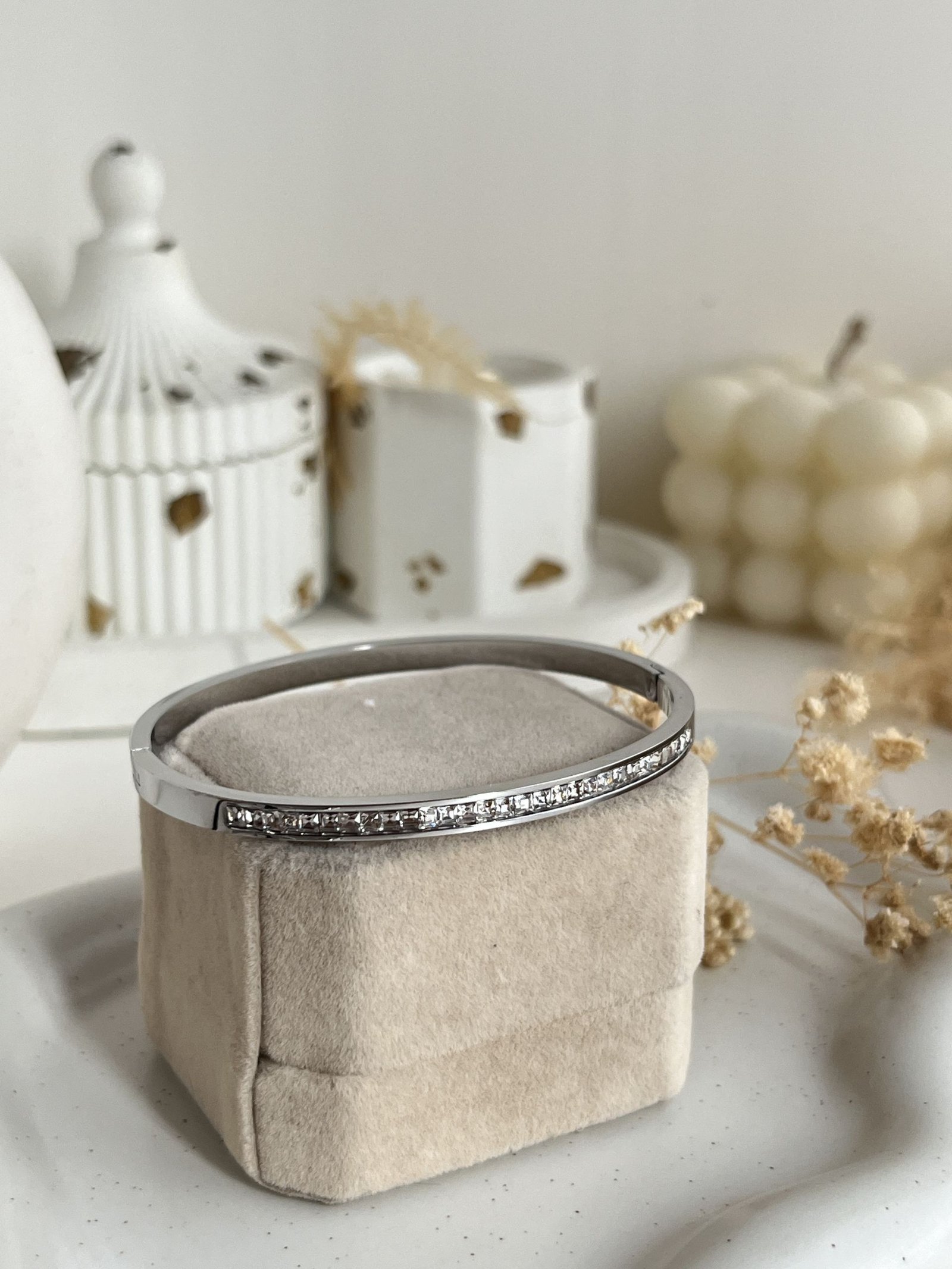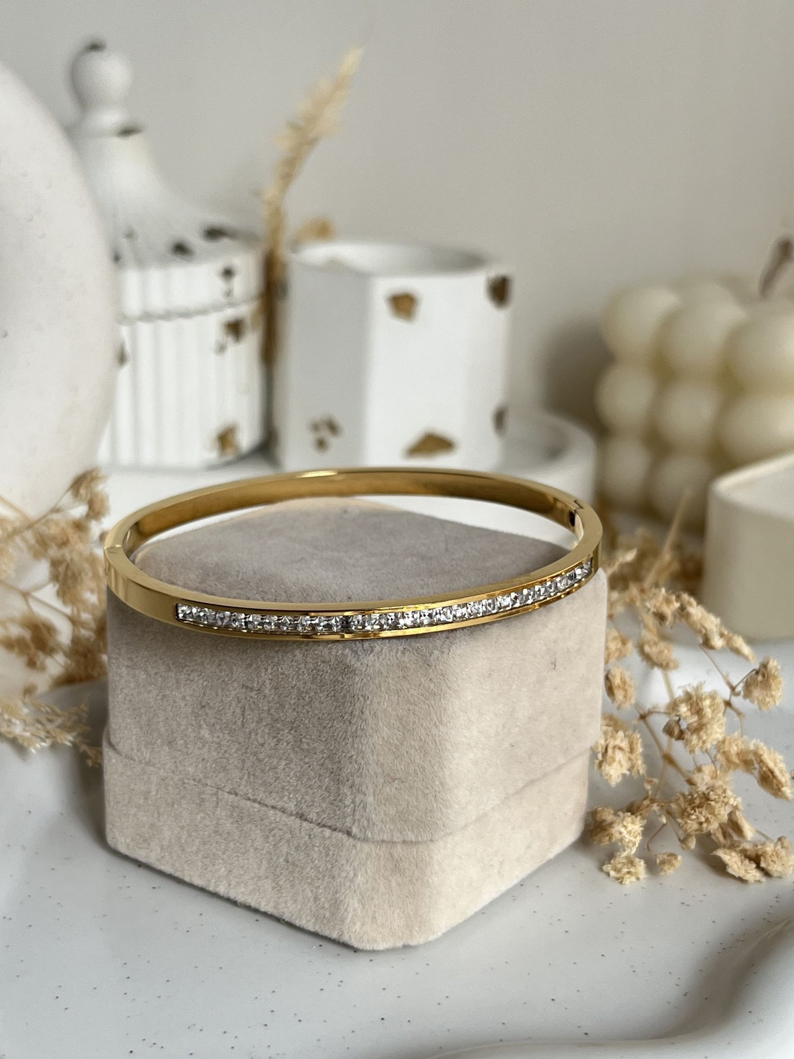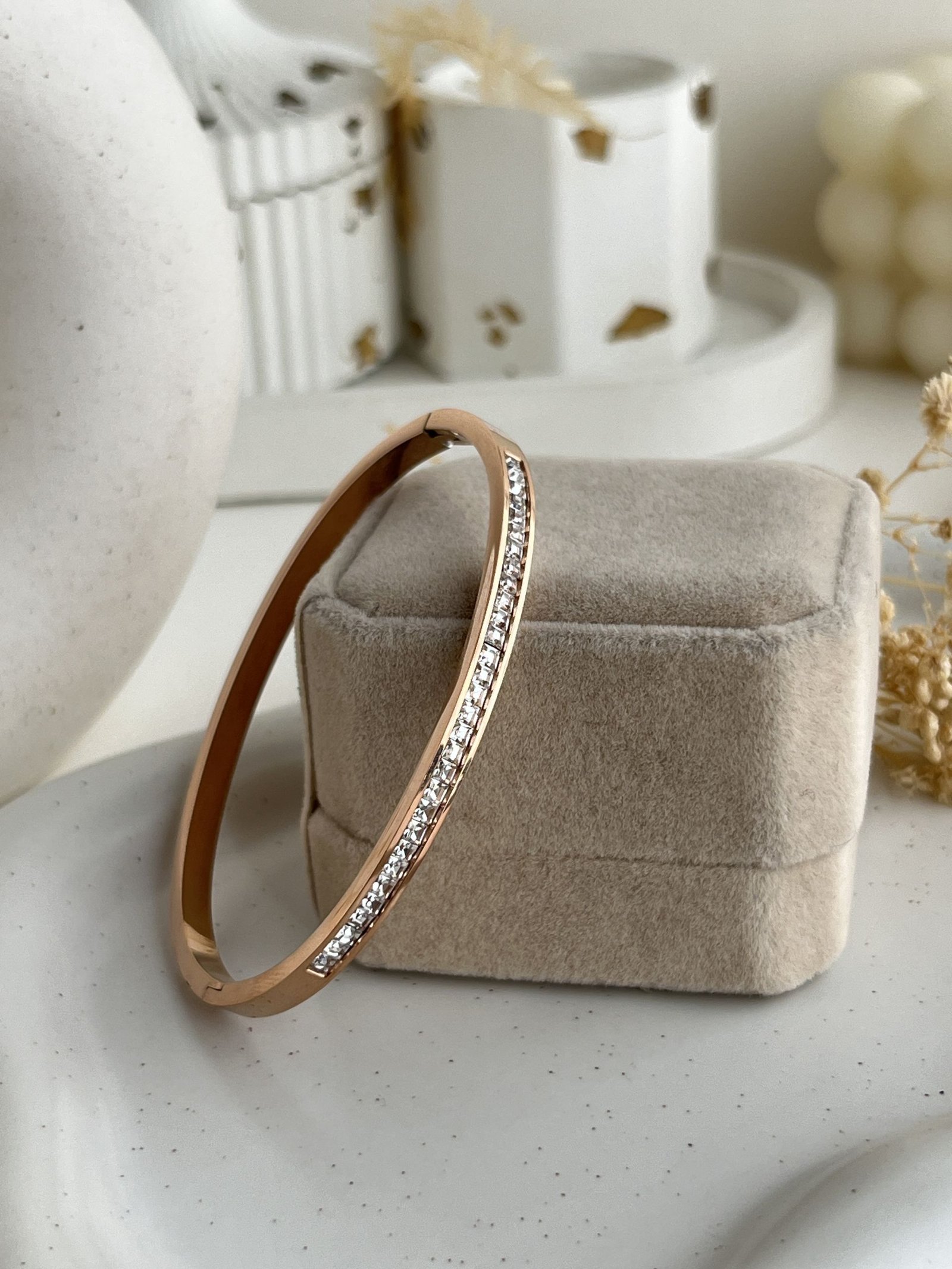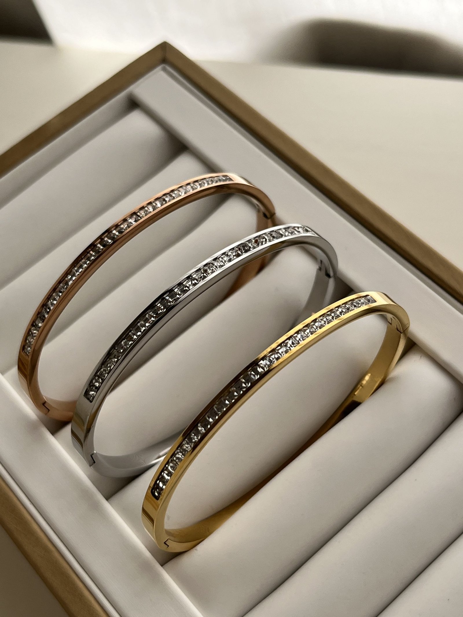 “Lunara Diamond Line Bangle is designed with a clean, structured profile that blends everyday comfort with luxury detailing. The cubic zirconia stones are precisely set along the center line, creating a continuous shimmer effect while maintaining a lightweight and balanced feel on the wrist.