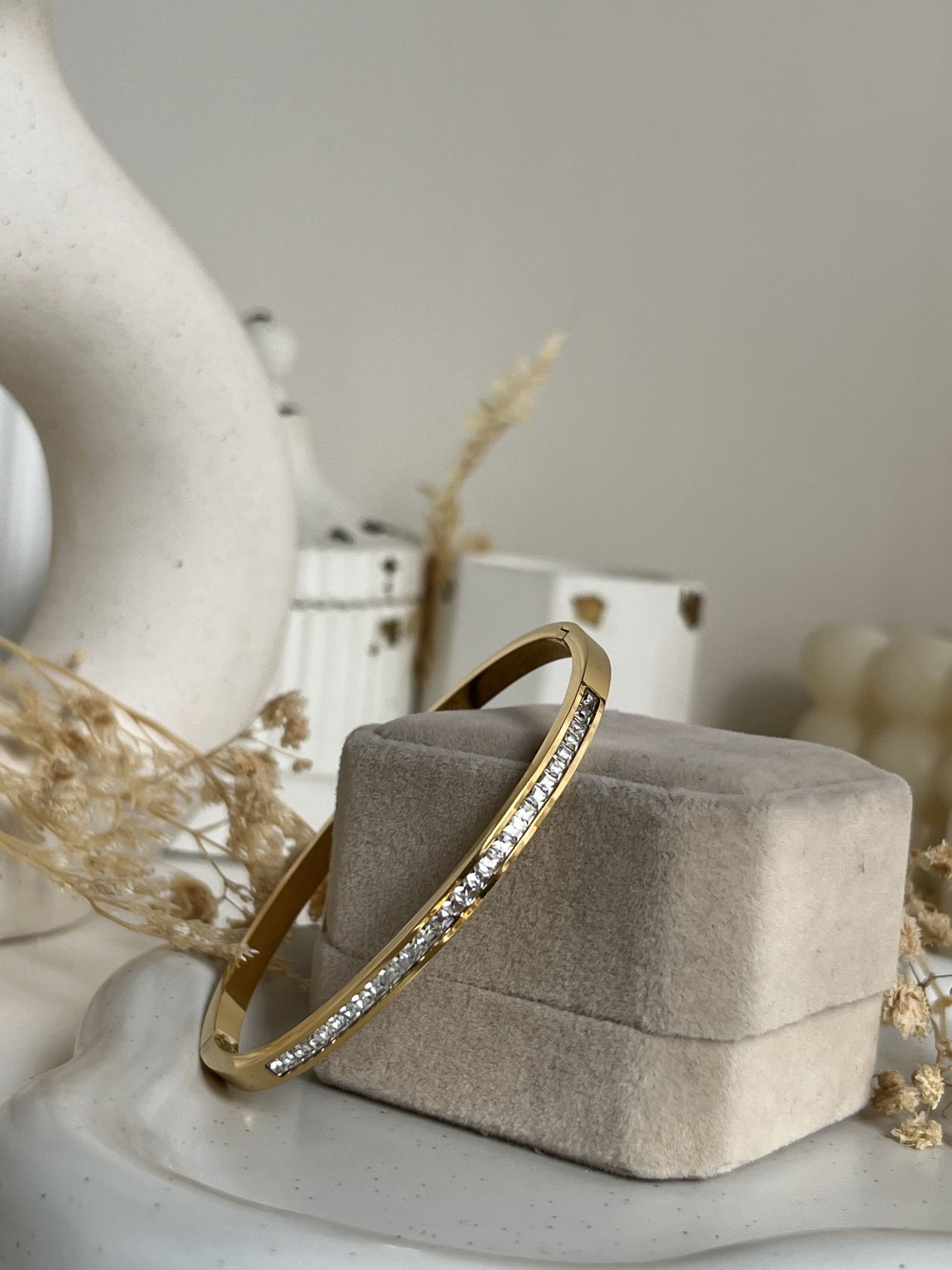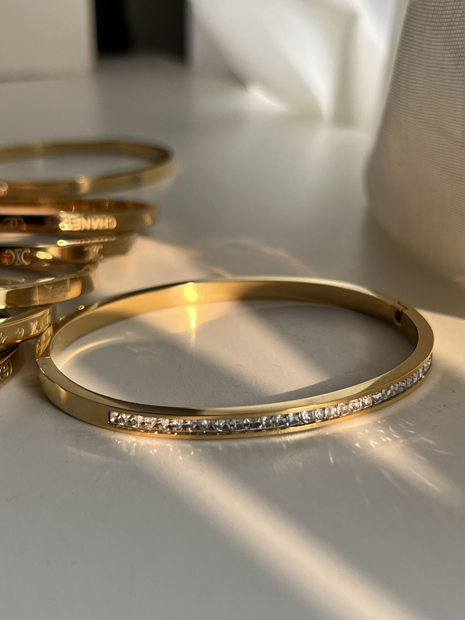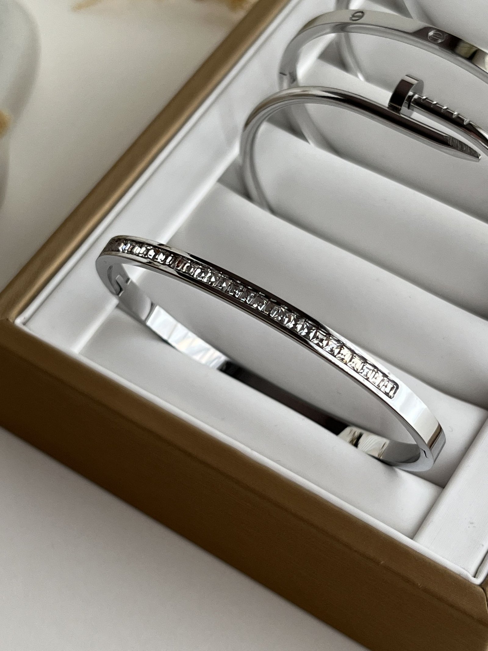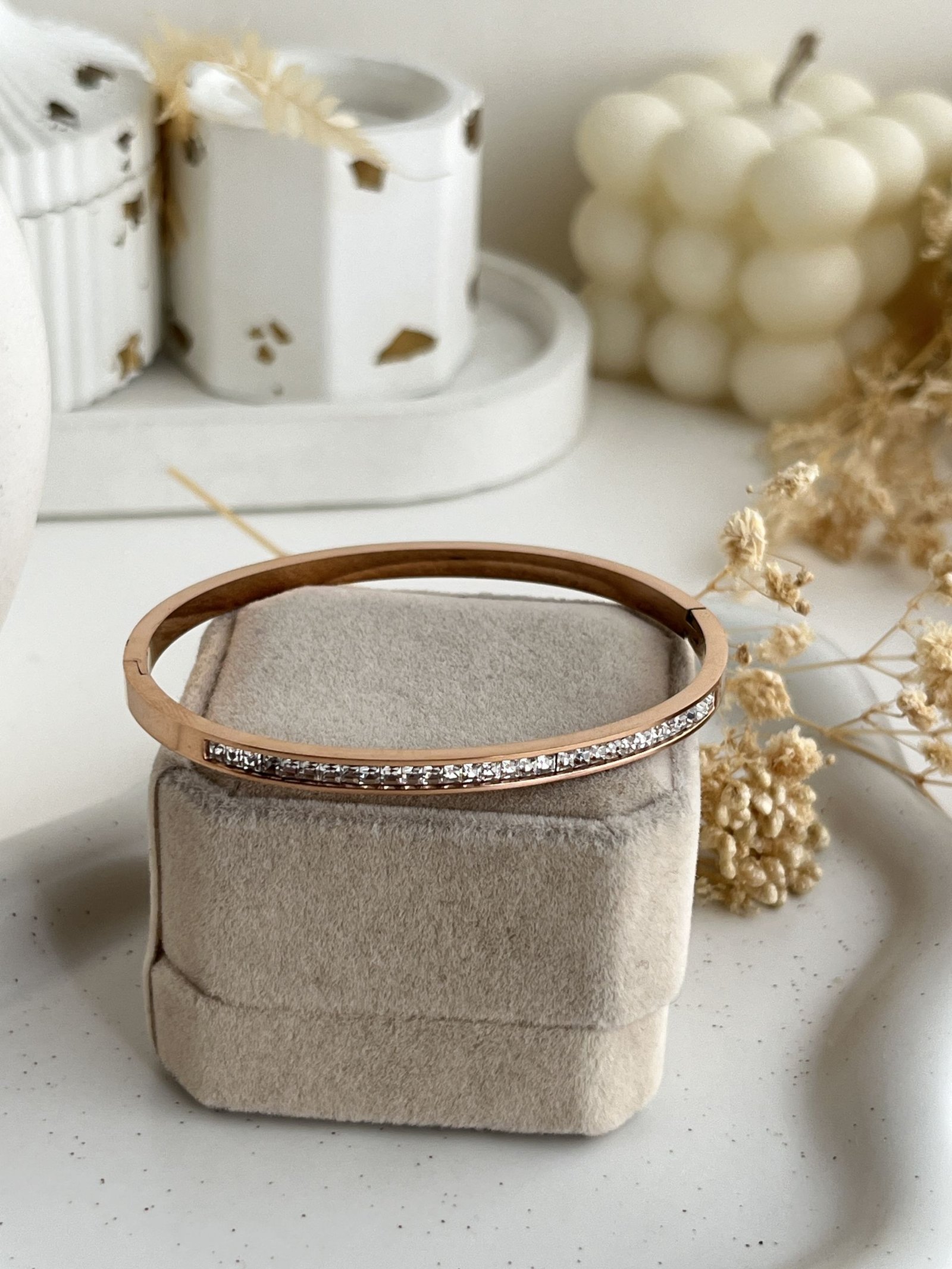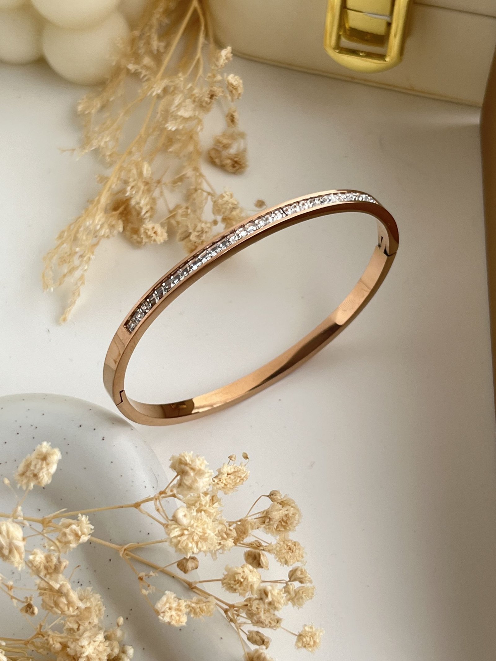 “Lunara Diamond Line Bangle is designed with a clean, structured profile that blends everyday comfort with luxury detailing. The cubic zirconia stones are precisely set along the center line, creating a continuous shimmer effect while maintaining a lightweight and balanced feel on the wrist.