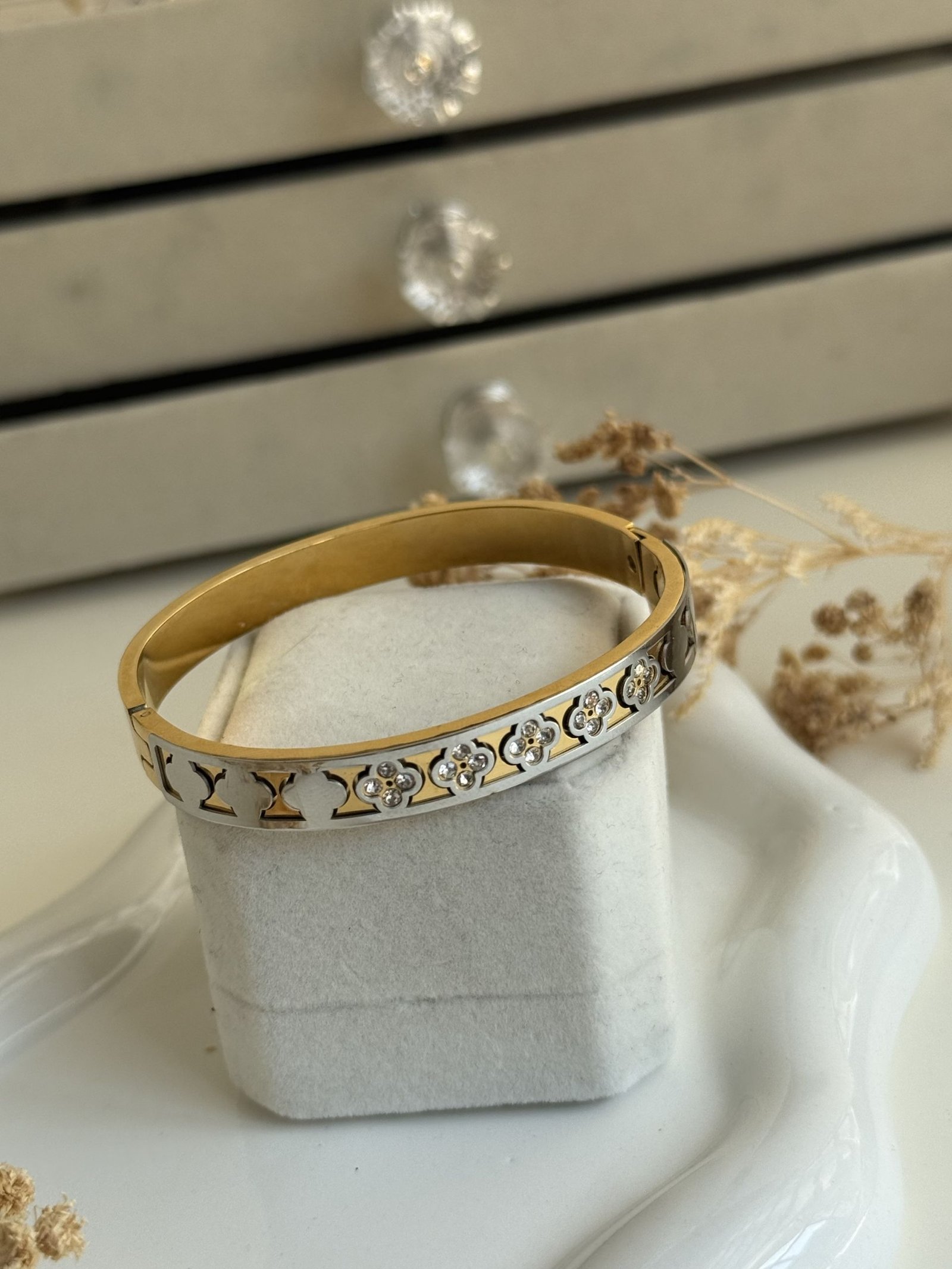 MonΓ©ra Ivory Cuff is designed with a clean oval silhouette, finished in a polished gold tone and detailed with a white enamel-style inlay framed by monogram-inspired motifs along the band. The contrast between the gold surface and light-toned detailing creates a refined visual balance with a contemporary edge.