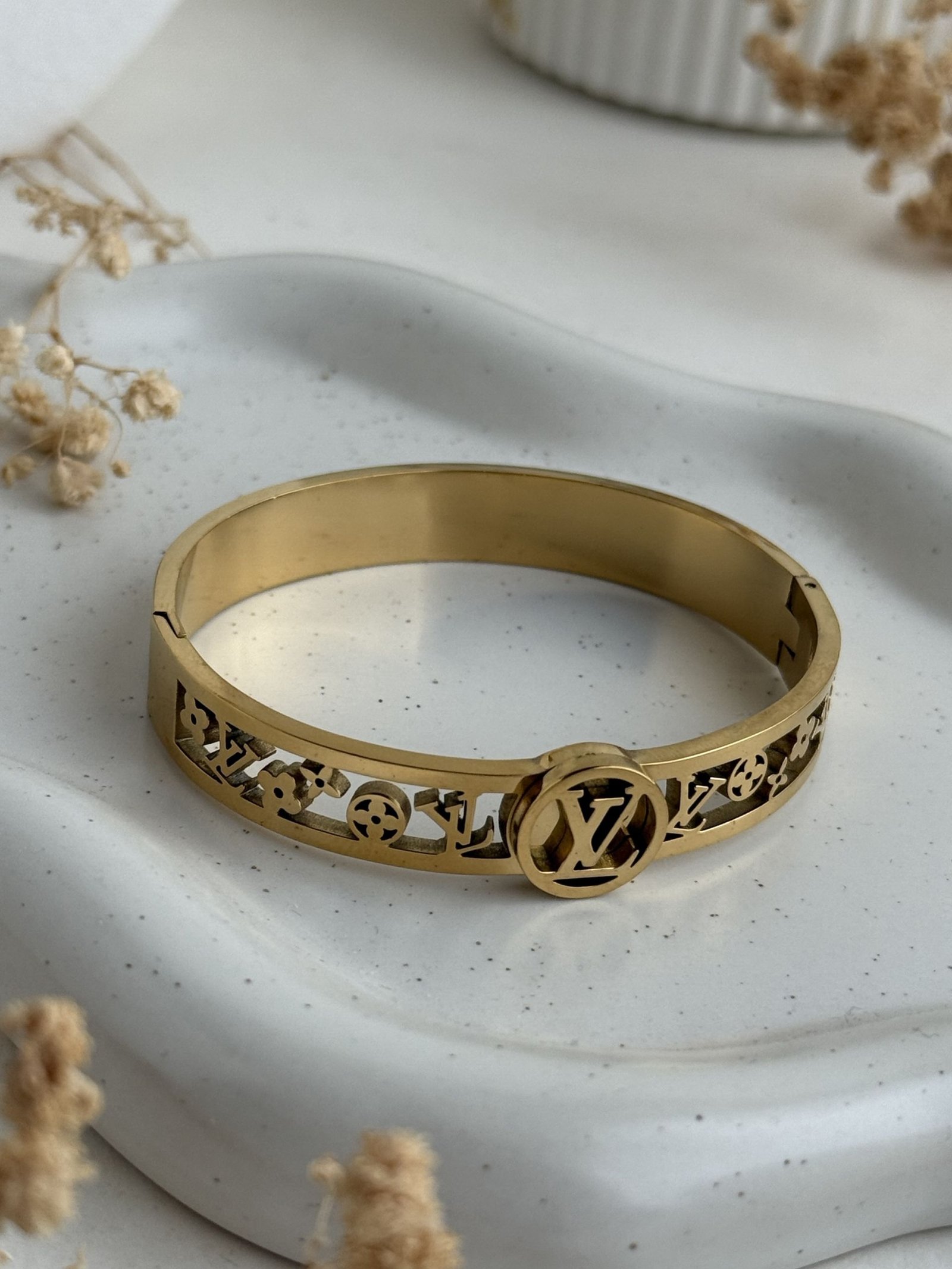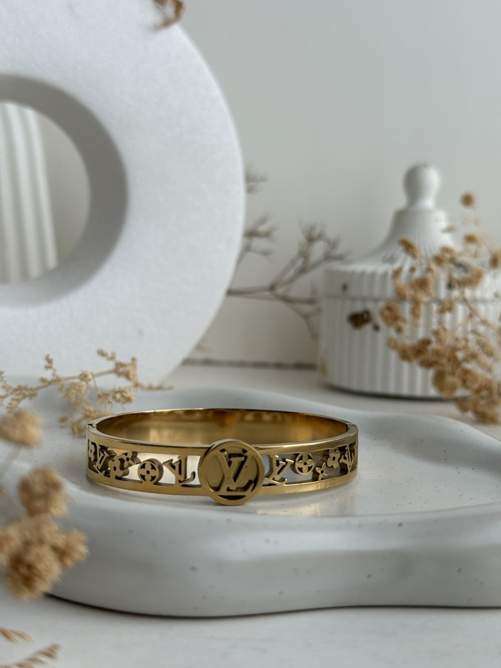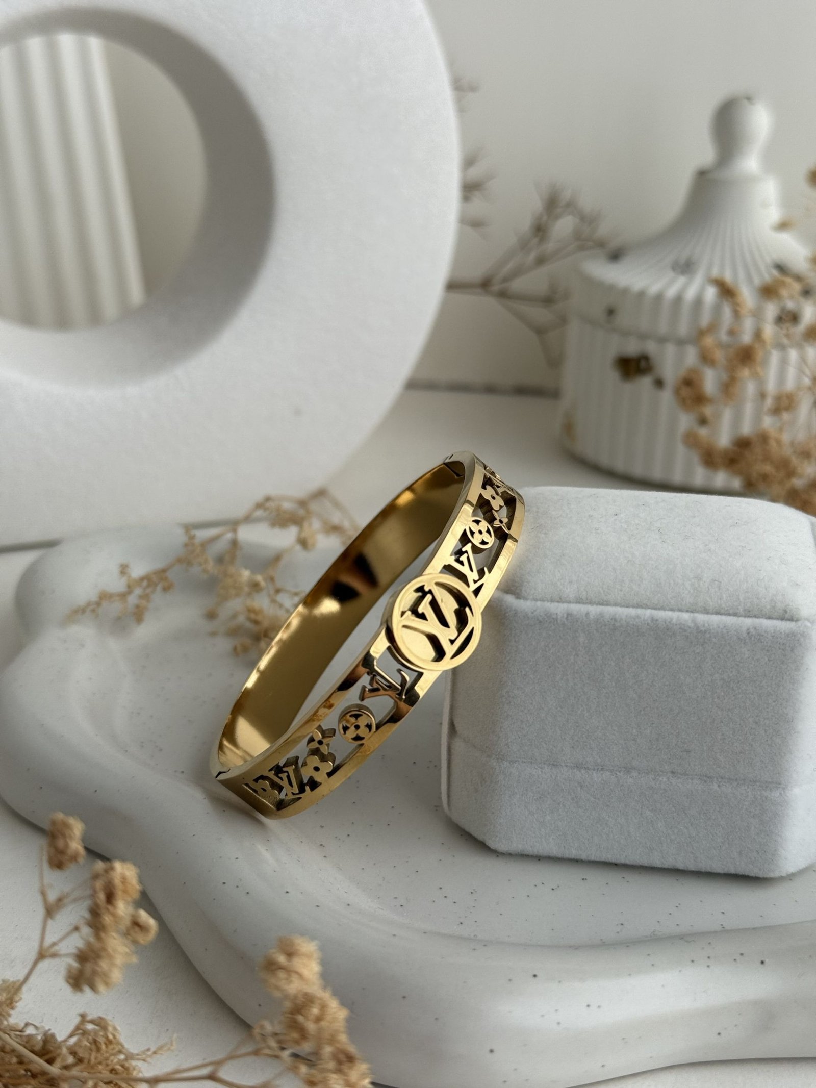 This cuff is crafted from titanium stainless steel and finished in a smooth gold tone. The cutout monogram pattern creates visual depth while keeping the design lightweight and breathable on the wrist. A secure side lock closure ensures ease of wear while maintaining a seamless look, making this piece ideal for daily styling or layering with other cuffs and bangles.