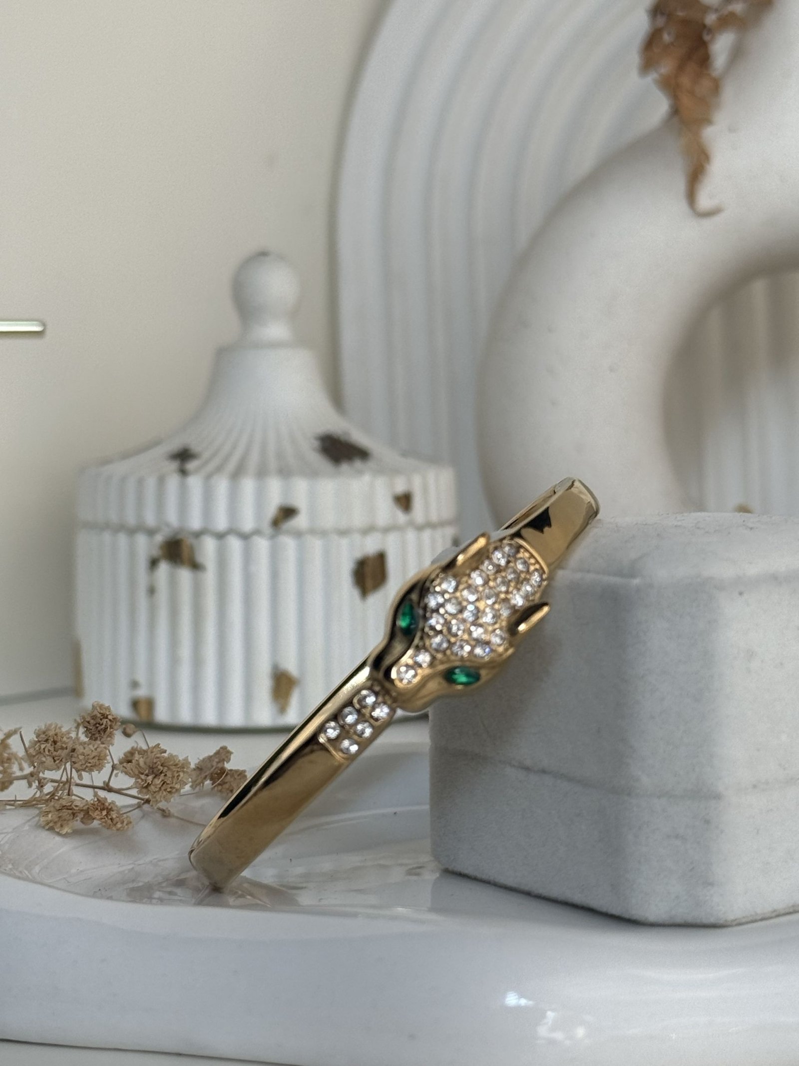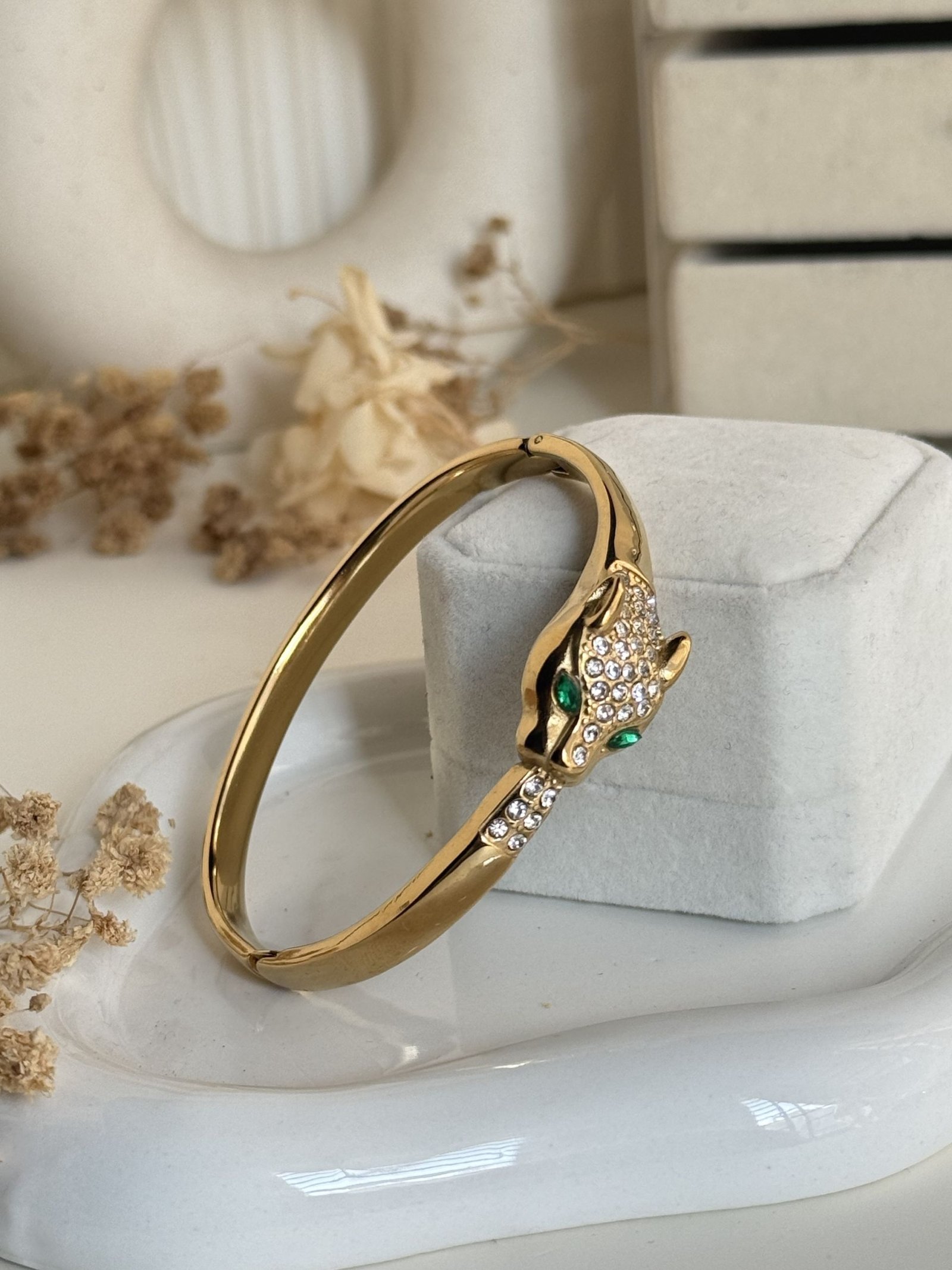 Savara Panther Cuff features a sleek oval bangle structure highlighted by a detailed leopard-head centerpiece. The sculpted form is enhanced with crystal embellishments and green stone accents on the eyes, delivering a luxurious contrast against the polished gold-tone surface.