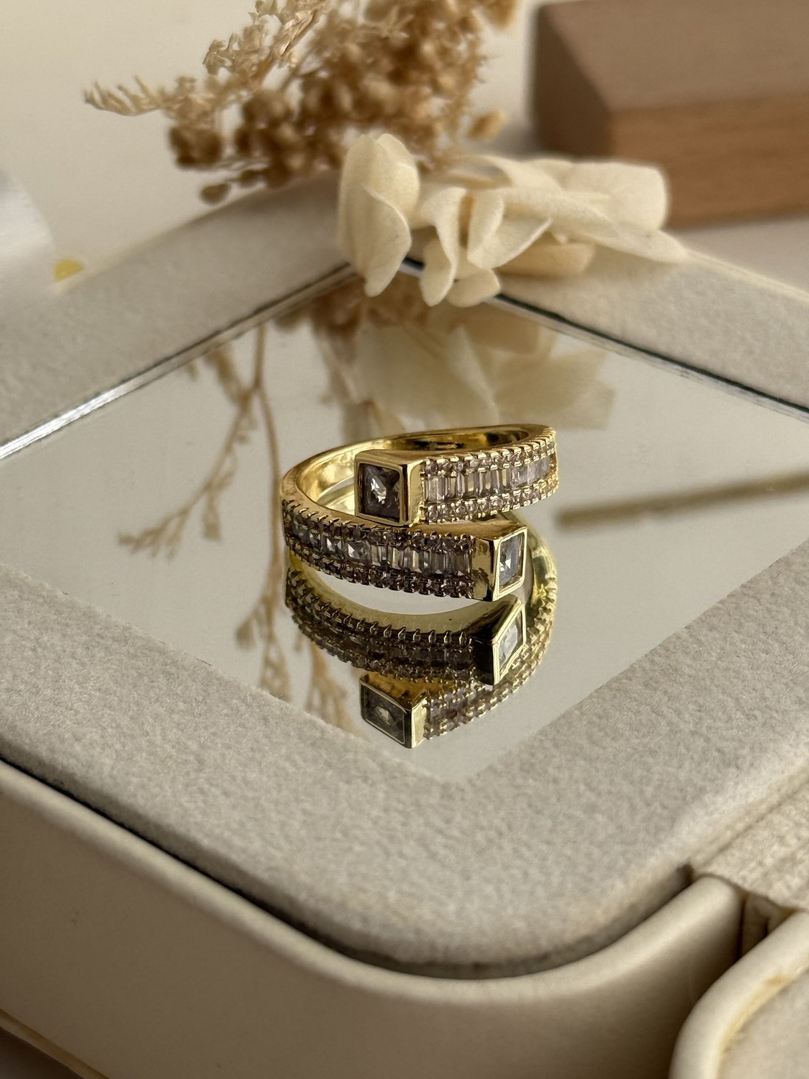 This sophisticated wrap ring features a sculptural layered band design highlighted with pavé-set crystal accents and a polished gold-plated copper finish. The architectural structure creates visual depth while maintaining a smooth inner curve for comfortable wear. Designed to elevate both everyday outfits and evening looks, this piece blends modern elegance with timeless appeal and flows seamlessly into the dimension profile.