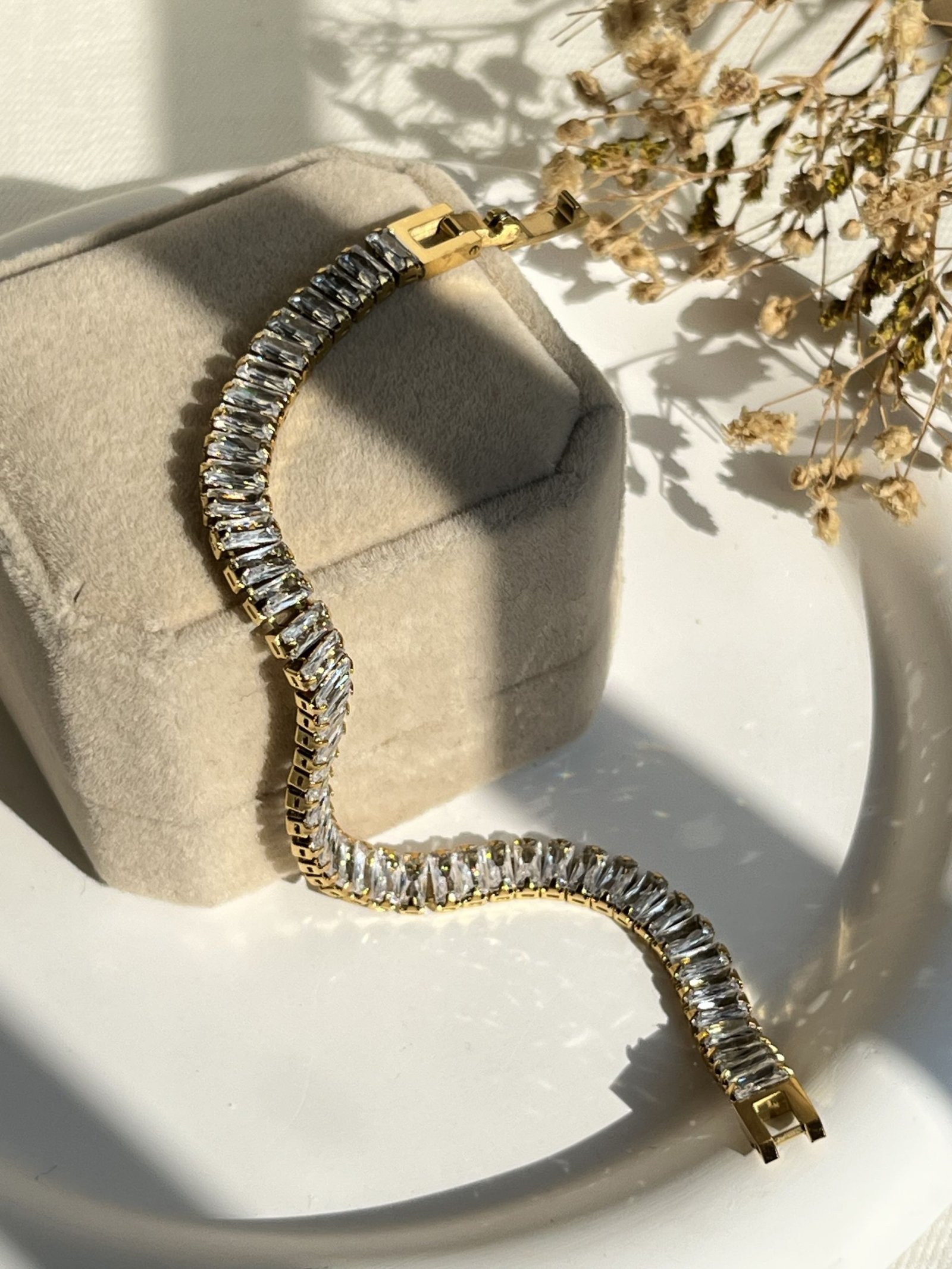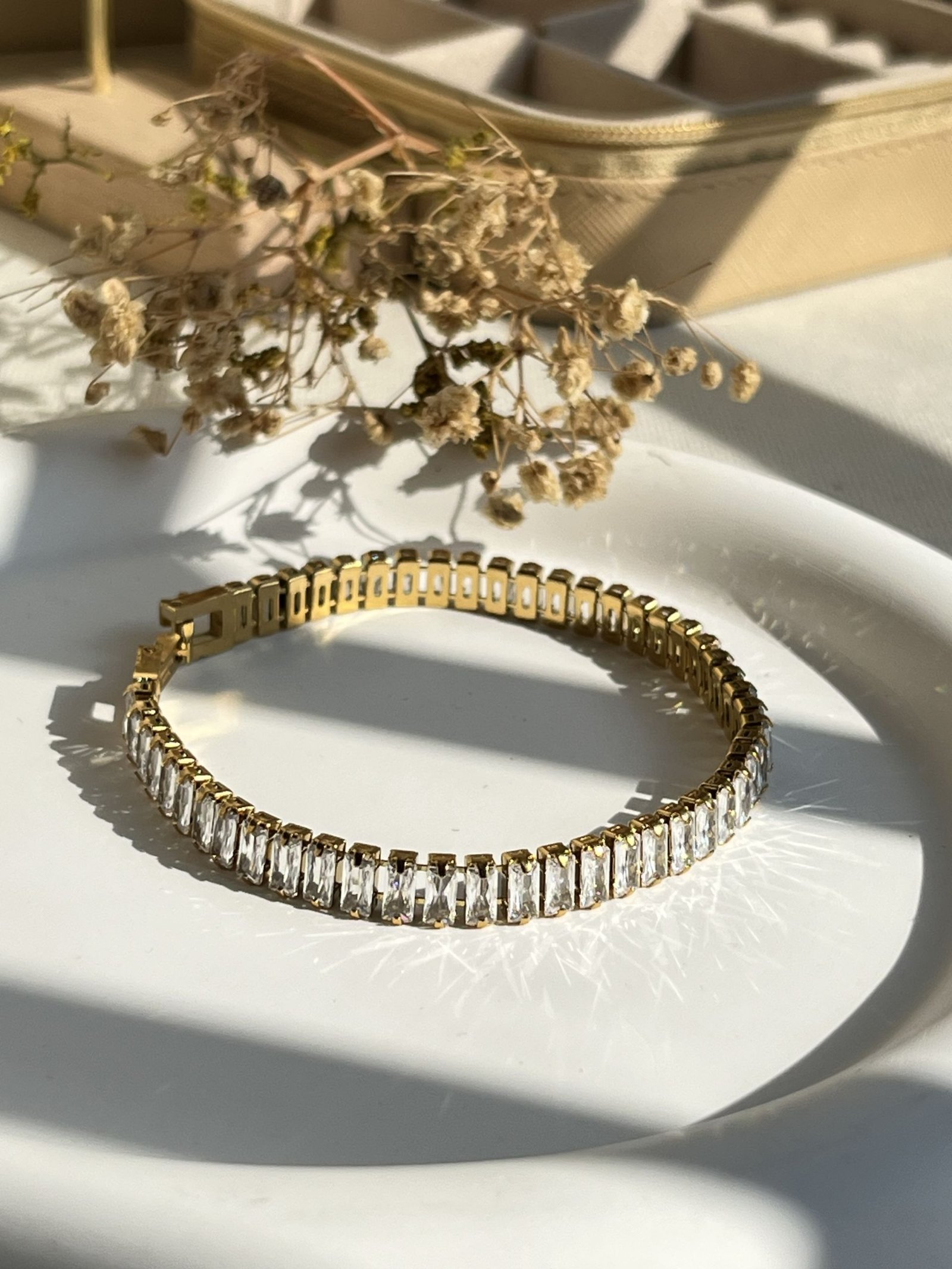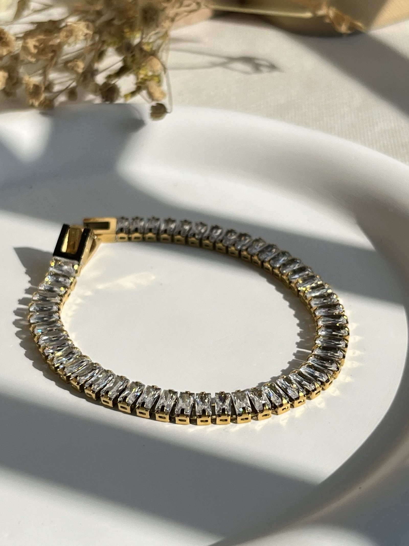 This bracelet features a continuous row of precisely aligned baguette-cut cubic zirconia stones set within a polished gold-tone frame, creating a sharp, modern interpretation of the classic tennis bracelet. The structured yet flexible construction allows the bracelet to rest smoothly on the wrist while maintaining a secure and balanced fit. Its streamlined profile makes it ideal for statement solo wear or pairing with minimal chain bracelets. Crafted from titanium stainless steel with gold plating, it offers excellent durability, tarnish resistance, and long-lasting color stability suitable for regular daily wear.