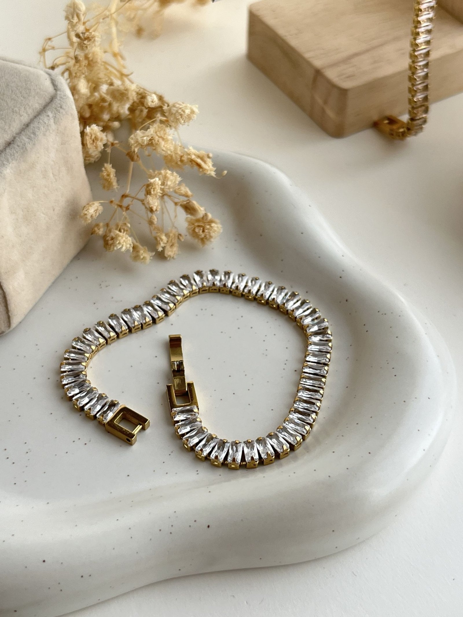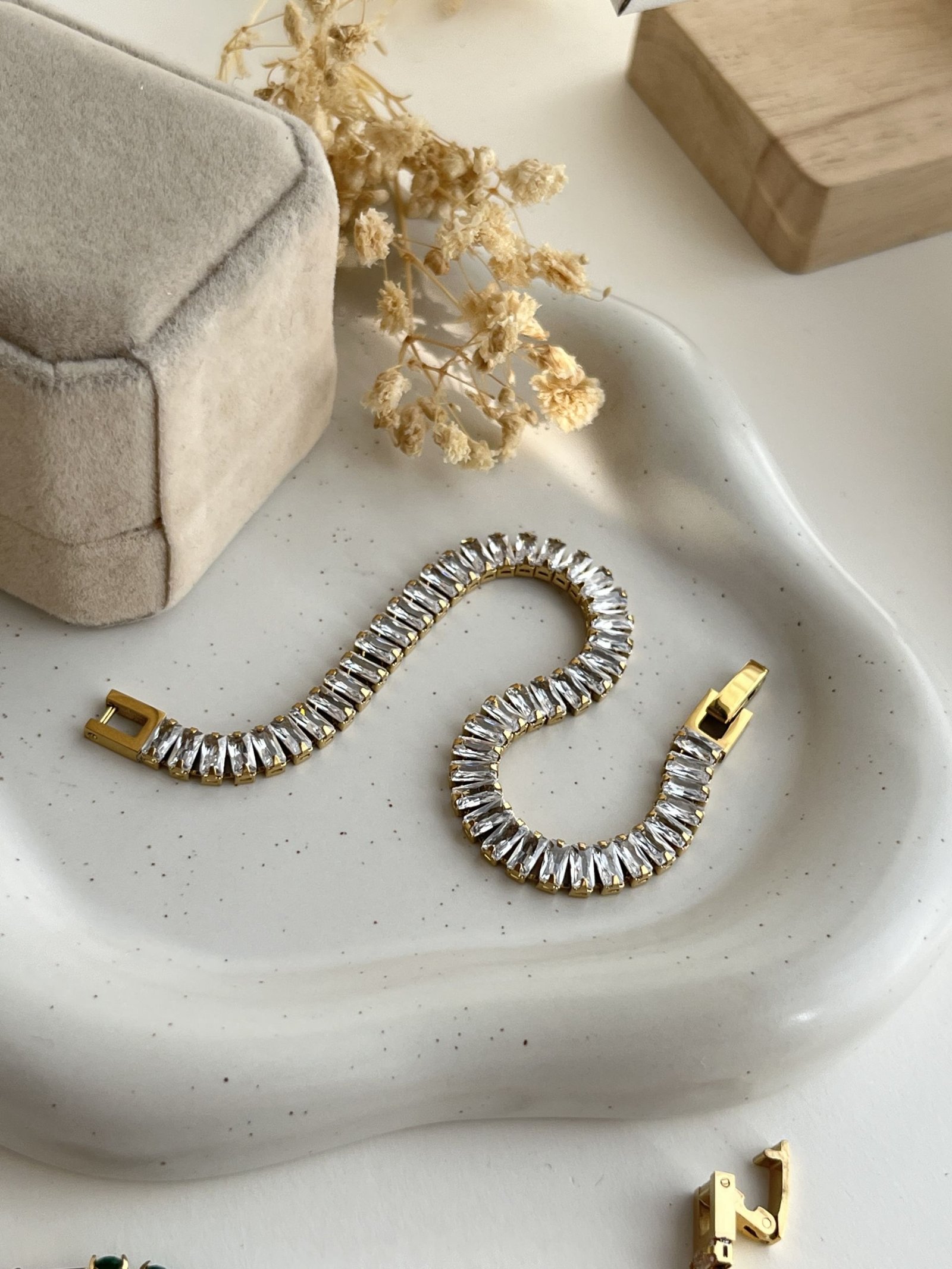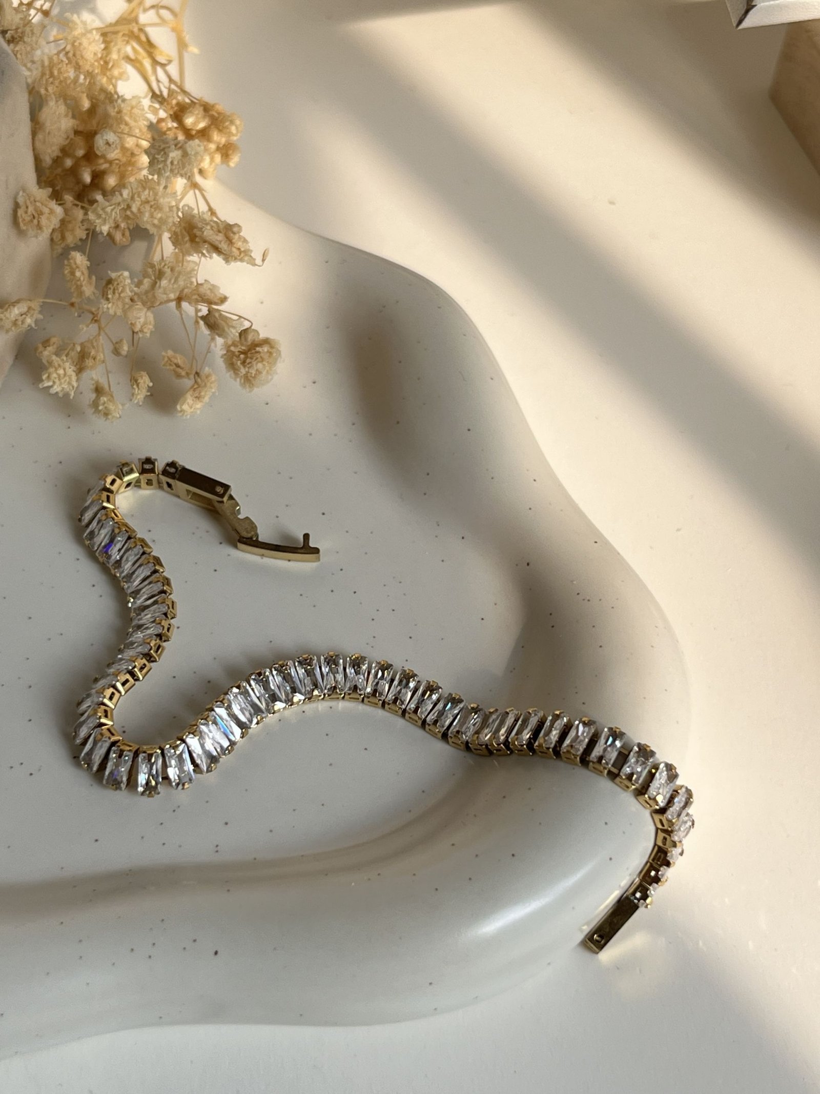 This bracelet features a continuous row of precisely aligned baguette-cut cubic zirconia stones set within a polished gold-tone frame, creating a sharp, modern interpretation of the classic tennis bracelet. The structured yet flexible construction allows the bracelet to rest smoothly on the wrist while maintaining a secure and balanced fit. Its streamlined profile makes it ideal for statement solo wear or pairing with minimal chain bracelets. Crafted from titanium stainless steel with gold plating, it offers excellent durability, tarnish resistance, and long-lasting color stability suitable for regular daily wear.