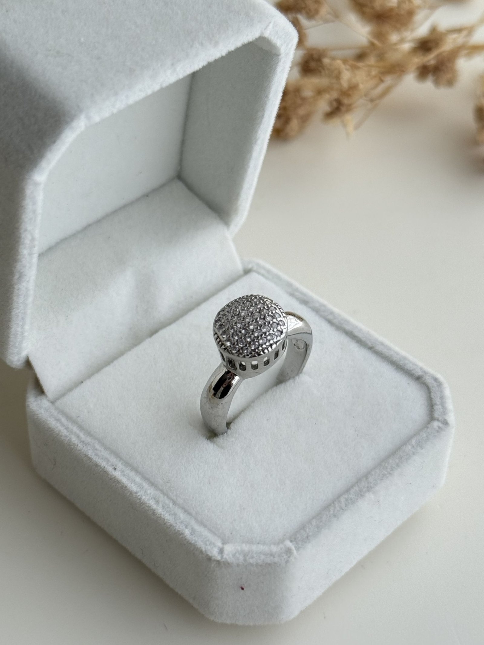 The Veloria Pavé Dome Ring features a softly contoured dome design adorned with closely set clear cubic zirconia stones for a luminous, uniform sparkle. Its smooth curved profile offers a balanced structure that sits comfortably on the finger while maintaining a bold yet elegant presence. Finished in silver-plated copper, this ring delivers a refined aesthetic suitable for statement wear, evening styling, or elevated everyday looks, transitioning effortlessly from solo wear to layered pairings.