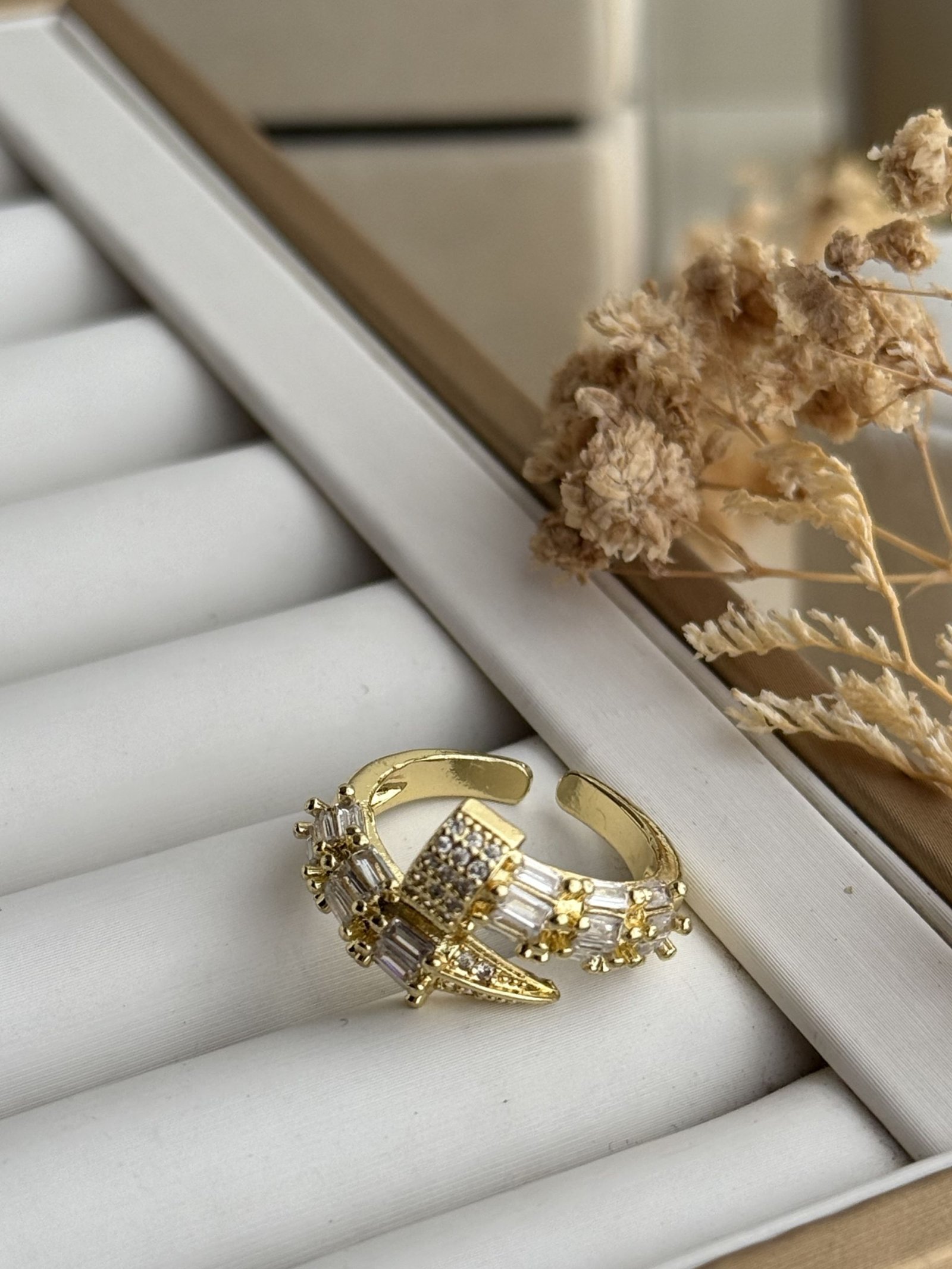 The Virelle Baguette Wrap Ring showcases a bold asymmetrical wrap design enhanced with baguette-cut and round-cut stones that create striking dimension and refined sparkle. Finished in a smooth gold-plated copper surface, this ring balances architectural structure with elegant detailing while maintaining a comfortable adjustable fit. Designed to stand alone as a statement piece or pair effortlessly with minimal bands, it offers versatile styling with a refined modern appeal.